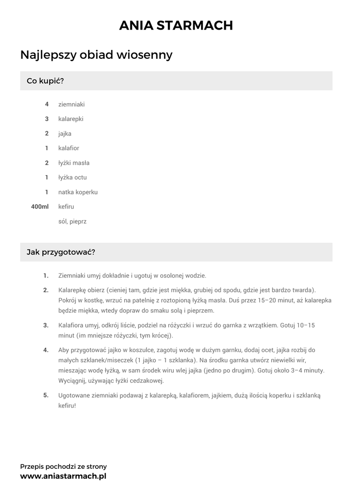 ANIA STARMACH Najlepszy obiad wiosenny Co kupić? 4 ziemniaki 3 kalarepki 2 jajka 1 kalafior 2 łyżki masła 1 łyżka octu 1 natka koperku 400ml kefiru sól, pieprz Jak przygotować? 1. Ziemniaki umyj dokładnie i ugotuj w osolonej wodzie. 2. Kalarepkę obierz (cieniej tam, gdzie jest miękka, grubiej od spodu, gdzie jest bardzo twarda). Pokrój w kostkę, wrzuć na patelnię z roztopioną łyżką masła. Duś przez 15–20 minut, aż kalarepka będzie miękka, wtedy dopraw do smaku solą i pieprzem. 3. Kalafiora umyj, odkrój liście, podziel na różyczki i wrzuć do garnka z wrzątkiem. Gotuj 10–15 minut (im mniejsze różyczki, tym krócej). 4. Aby przygotować jajko w koszulce, zagotuj wodę w dużym garnku, dodaj ocet, jajka rozbij do małych szklanek/miseczek (1 jajko – 1 szklanka). Na środku garnka utwórz niewielki wir, mieszając wodę łyżką, w sam środek wiru wlej jajka (jedno po drugim). Gotuj około 3–4 minuty. Wyciągnij, używając łyżki cedzakowej. 5. Ugotowane ziemniaki podawaj z kalarepką, kalafiorem, jajkiem, dużą ilością koperku i szklanką kefiru! Przepis pochodzi ze strony www.aniastarmach.pl