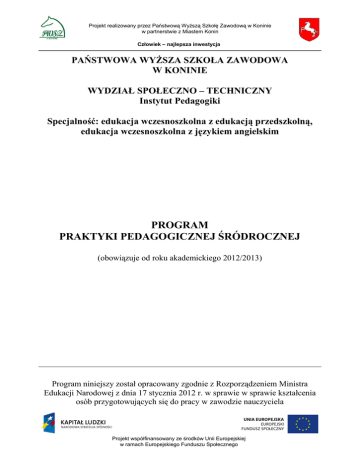 Projekt realizowany przez Państwową Wyższą Szkołę Zawodową w Koninie w partnerstwie z Miastem Konin Człowiek – najlepsza inwestycja PAŃSTWOWA WYŻSZA SZKOŁA ZAWODOWA W KONINIE WYDZIAŁ SPOŁECZNO – TECHNICZNY Instytut Pedagogiki Specjalność: edukacja wczesnoszkolna z edukacją przedszkolną, edukacja wczesnoszkolna z językiem angielskim PROGRAM PRAKTYKI PEDAGOGICZNEJ ŚRÓDROCZNEJ (obowiązuje od roku akademickiego 2012/2013) Program niniejszy został opracowany zgodnie z Rozporządzeniem Ministra Edukacji Narodowej z dnia 17 stycznia 2012 r. w sprawie w sprawie kształcenia osób przygotowujących się do pracy w zawodzie nauczyciela Projekt współfinansowany ze środków Unii Europejskiej w ramach Europejskiego Funduszu Społecznego Projekt realizowany przez Państwową Wyższą Szkołę Zawodową w Koninie w partnerstwie z Miastem Konin Człowiek – najlepsza inwestycja Nauczyciel, przyjmujący studenta na praktykę, opracowuje plan i nadzoruje przebieg praktyki pod względem organizacyjnym, merytorycznym i metodycznym. I. CELE I ZADANIA PRAKTYKI Podstawę prawną studenckich praktyk zawodowych stanowią: Ustawa z dnia 27 lipca 2005 roku – prawo o szkolnictwie wyższym (Dz. U. z 2005 r. nr 164, poz.1365), oraz Regulamin studiów Wydziału Społeczno – Technicznego Państwowej Wyższej Szkoły Zawodowej w Koninie z dnia 06.07.2007 r., § 23. Realizowane są w wymiarze nie mniejszym niż określony w standardach kształcenia nauczycieli na studiach wyższych zawodowych. Praktyka śródroczna organizowana jest w toku studiów w poszczególnych semestrach – zgodnie z planem studiów. Ma ona charakter próbnej pracy studenta w charakterze obserwatora procesu nauczania i wychowania oraz w charakterze asystenta nauczyciela prowadzącego zajęcia, a następnie nauczyciela coraz bardziej samodzielnie planującego, realizującego i poddającego ewaluacji własne zajęcia w klasach I - III. W realizację praktyk pedagogicznych śródrocznych zaangażowani są w sposób szczególny wykładowcy realizujący poszczególne metodyki szczegółowe. Zajęcia prowadzone są przez nich w III i IV semestrze w jednym czasie, w ramach tzw. „bloków metodycznych” (środa, czwartek), co umożliwia stały kontakt oraz możliwość integrowania swych poczynań dydaktycznych nie tylko na etapie projektowania i scalania programów, ale także na etapie ich realizacji i ewaluacji. Taka konstrukcja planu umożliwia również spójną realizację zajęć terenowych, gdzie wykładowcy są w jednym czasie dostępni dla wszystkich grup studenckich i odwrotnie. Celem praktyk pedagogicznych jest w szczególności: poznanie organizacji pracy szkół i innych placówek (m. in.: przedszkola, świetlicy socjoterapeutycznej), w szczególności zaś organizacji pracy na etapie edukacji wczesnoszkolnej; nabycie umiejętności planowania, prowadzenia i dokumentowania zajęć; nabycie umiejętności prowadzenia obserwacji zajęć i jej dokumentowania; nabycie umiejętności analizy pracy nauczyciela i uczniów podczas wspólnego omawiania praktyk przez opiekunów praktyk i studentów; nabycie umiejętności analizowania własnej pracy i jej efektów oraz pracy uczniów. Projekt współfinansowany ze środków Unii Europejskiej w ramach Europejskiego Funduszu Społecznego Projekt realizowany przez Państwową Wyższą Szkołę Zawodową w Koninie w partnerstwie z Miastem Konin Człowiek – najlepsza inwestycja Zadaniem studenta w czasie praktyki jest poznać: 1. Sposoby diagnozowania sytuacji edukacyjnych w szkole, środowisku rodzinnym dziecka, a także poza nim. 2. Sposoby realizacji treści programowych – poprzez obserwację (hospitowanie) oraz analizę dokumentacji dydaktycznej. 3. Zadania i obowiązki nauczyciela – wychowawcy (poprzez obserwacje i prowadzenie całodziennych zajęć przewidzianych rozkładem tygodniowym oraz udział w innych formach pracy pedagogicznej nauczyciela (prowadzenie dokumentacji szkolnej, posiedzenia rady pedagogicznej, zebrania z rodzicami itp.). 4. Zasady i formy współpracy nauczyciela z rodzicami w dążeniu do harmonijnego rozwoju dziecka i w tworzeniu jemu sprzyjającego środowiska pedagogicznego – poprzez udział w rozmowach i zebraniach z rodzicami, radą rodziców, wywiadach rodzinnych itp. 5. Różnorodne formy działalności pozalekcyjnej z dziećmi – poprzez udział w przygotowaniu i prowadzeniu imprez, wycieczek oraz innych form zajęć organizowanych z udziałem dzieci. 6. Bazę materialną, plany pracy, zadania rady pedagogicznej, dokumentację pracy szkoły, przedszkola i innych instytucji współdziałających ze szkołą. W czasie odbywania praktyki każdy student zobowiązany jest do wzbogacania doświadczeń poprzez aktywne uczestnictwo w gromadzeniu materiałów i w obserwacji wszystkich zajęć prowadzonych przez nauczyciela-opiekuna oraz studentów w ramach wyznaczonej grupy (liczącej w zasadzie nie więcej niż 3 – 5 studentów) w minimalnym czasie trwania określonym przez uczelnię. Na podstawie zebranego materiału diagnostycznego student – praktykant winien być gotowy do stopniowego rozszerzania swego współuczestnictwa z nauczycielem-opiekunem w prowadzeniu różnorodnych zajęć. Początkowo mogą to być krótkie (5-10 minut) wybrane fragmenty zajęć edukacyjnych jako sytuacje dwuzadaniowe obejmujące role każdego ucznia oraz role praktykanta (jako przyszłego nauczyciela). Bardzo ważnym elementem tego rodzaju prób jest sterowanie czynnościami poznawczo-instrumentalnymi poszczególnych uczniów będącymi szczególnie istotnymi wyznacznikami aktywności i aktywizacji w modelu interakcyjnego nauczania – uczenia się (według zasad sprzężenia zwrotnego). W kolejnej fazie praktykant winien podejmować próby prowadzenia zajęć w dłuższym czasie – docelowo całej lekcji w czasie 45 minut. W końcowej fazie praktyki śródrocznej student winien być przygotowany do tego, aby przeprowadzić zajęcia z dziećmi w d