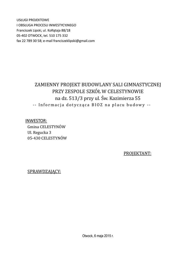 USŁUGI PROJEKTOWE I OBSŁUGA PROCESU INWESTYCYJNEGO Franciszek Lipski, ul. Kołłątaja 88/18 05-402 OTWOCK, tel. 510 175 332 fax 22 789 30 58; e-mail [email protected] ZAMIENNY PROJEKT BUDOWLANY SALI GIMNASTYCZNEJ PRZY ZESPOLE SZKÓŁ W CELESTYNOWIE na dz. 513/3 przy ul. Św. Kazimierza 55 -- I nfo r mac ja dot yc ząca BIOZ na pl acu bu dow y -- INWESTOR: Gmina CELESTYNÓW Ul. Regucka 3 05-430 CELESTYNÓW PROJEKTANT: SPRAWDZAJĄCY: Otwock, 6 maja 2015 r. OPIS TECHNICZNY DO INFORMACJI DOTYCZĄCEJ BEZPIECZEŃSTWA I OCHRONY ZDROWIA NA PLACU BUDOWY 1. Podstawa opracowania Projekt budowlany budynku przedszkola Rozporządzenie Ministra Infrastruktury z dnia 23.VI.2003r. w sprawie informacji dotyczącej bezpieczeństwa i ochrony zdrowia oraz planu bezpieczeństwa i ochrony zdrowia Dz. U. Nr 12, Poz. 1126 Rozporządzenie Ministra Budownictwa i Przemysłu Materiałów Budowlanych z dnia 28.III.1972r. w sprawie bezpieczeństwa i higieny pracy przy wykonywaniu robót budowlano-montażowych i rozbiórkowych Dz. U. Nr 13, Poz.93 Rozporządzenie Ministra Pracy i Polityki Socjalnej z dnia 26.IX.1997r. w sprawie ogólnych przepisów bezpieczeństwa i higieny pracy Rozporządzenie Ministra Pracy i Polityki Socjalnej z dnia 8.II.1994r. w sprawie wprowadzenia obowiązku stosowania niektórych Polskich Norm i norm branżowych, dotyczących bezpieczeństwa i higieny pracy (Dz. U. Nr 37, poz. 138) 2. Zakres i kolejność wykonywania robót ROBOTY związane z urządzeniem zaplecza i placu budowy: Wyznaczenie, oznakowanie i oświetlenie placu budowy Wyznaczenie pomieszczeń socjalnych i sanitarnych dla pracowników, rozmieszczenie sprzętu ratunkowego i pierwszej pomocy Utwardzenie wjazdu, wyznaczenie dróg dojazdowych i dojść Wyznaczenie miejsca składowania materiałów budowlanych z oznaczeniem stref ochronnych wynikających z odrębnych przepisów. Wyznaczenie na placu budowy stanowiska zbrojarni, węzła betoniarskiego i stanowiska pracy sprzętu zmechanizowanego i pomocniczego ROBOTY budowlano – montażowe Wykonanie wykopu pod łącznik Wykonanie ław i stóp fundamentowych Wykonanie murów fundamentowych Zasypanie wykopów wokół ścian Wykonanie słupów żelbetowych, ścian konstrukcyjnych i działowych Wykonanie żelbetowych belek, podciągów i wieńcy Wykonanie konstrukcji więźby dachowej, impregnacja ognioochronna i owadobójcza elementów drewnianych Wykonanie pokrycia dachowego i obróbek blacharskich (parapety, rynny i rury spustowe), wykonanie izolacji przeciwwilgociowych, przeciwwodnych i cieplnych Montaż i demontaż typowych rusztowań Osadzenie stolarki okiennej i drzwiowej Wykonanie robót wykończeniowych: tynkarskie – posadzkowe Wykonanie instalacji sanitarnych Wykonanie instalacji elektrycznej Wykonanie zagospodarowania terenu Wszystkie roboty należy wykonać zgodnie ze sztuką budowlaną, pod nadzorem osoby posiadającej odpowiednie uprawnienia budowlane. 3. Wykaz istniejących obiektów budowlanych na placu budowy Budynek Zespołu Szkół Budynek Szkoły Podstawowej Budynek administracyjny Sala gimnastyczna (w budowie) 4. Elementy zagospodarowania bezpieczeństwa i zdrowia ludzi działki, które mogą stwarzać zagrożenie Nie projektuje się 5. Zagrożenia w czasie wykonywania robót budowlanych Roboty ziemnie – obsunięcie się skarpy, możliwość przygniecenia i uderzenia pracowników podczas pracy koparki Roboty budowlano – montażowe – możliwość upadku (prace na wysokości) należy wykonać zabezpieczenie dróg komunikacyjnych Roboty betonowe – nie dopuścić do przeciążenia deskowań mieszanką budowlaną Roboty ciesielskie – możliwość upadku – prace na wysokościach i prace ze środkami chemicznymi – impregnacja ognioochronna i owadobójcza elementów drewnianych Praca urządzeń technicznych i maszyn budowlanych, która może powodować: Porażenie prądem elektrycznym Potrącenie pracownika sprzętem Pochwycenie kończyn przez napęd urządzeń Roboty instalatorskie – porażenie prądem 6. Sposób prowadzenie instruktażu pracowników Przed przystąpieniem do robót ziemnych i budowlano – montażowych należy przeprowadzić wstępne szkolenie dla pracowników w zakresie objętym planem „BIOZ” zgodnie z Rozporządzeniem Ministra Infrastruktury z dnia 6.II.2003r. Przed dopuszczeniem pracowników do robót zakład zobowiązany jest zaopatrzyć pracowników w odzież roboczą i ochronną, zgodnie z obowiązującymi przepisami (hełmy, rękawice ochronne), z uwzględnieniem niebezpieczeństw wystąpienia: urazów mechanicznych, porażenia prądem, oparzenia, zatrucia, promieniowania, wibracji, upadku z wysokości lub innych szkodliwych czynników zagrożeń związanych z wykonywaną pracą. Należy stosować przewidziane przy robotach urządzenia zabezpieczające i ochronne (osłony). Urządzenia powinny być sprawne i posiadać aktualne atesty. Należy zapewnić stały dostęp pracowników do telefonu alarmowego, wykazu numerów telefonów i adresów najbliższego punktu opieki lekarskiej, straży pożarnej, policji, a także apteczki oraz środków i urządzeń przeciwpożarowych. Na budowie powinny się znajdować podręczne środki gaśnicze /gaśnice proszkowe, koce gaśnicze/. Należy wykonać i oznakować drogi umożliwiające ewakuacje, komunikacje i dojazd dla wozu straży pożarnej lub karetki pogotowia. Tych dróg i wyjazdów nie wolno zastawiać, a tym bardziej wykorzystywać na cele składowania. Muszą być w każdej chwili dostępne. 7. POSTANOWIENIA końcowe Każdy pracownik wykonujący roboty budowlane powinien posiadać kwalifikacje przewidziane dla określonego stanowiska oraz ważne świadectwo lekarskie o dopuszczenia do pracy Każdy pracownik zatrudniony na budowie powinien odbyć szkolenie wstępne w zakresie bezpieczeństwa i higieny pracy. Szkolenie wstępne powinno składać się z instruktażu ogólnego i stanowiskowego. Instruktaż ogólny powinien przeprowadzać inspektor B.H.P., a instruktaż stanowiskowy po