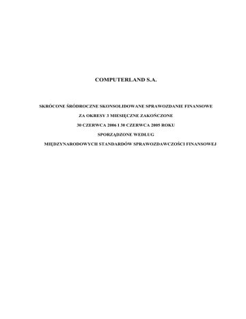 COMPUTERLAND S.A. SKRÓCONE ŚRÓDROCZNE SKONSOLIDOWANE SPRAWOZDANIE FINANSOWE ZA OKRESY 3 MIESIĘCZNE ZAKOŃCZONE 30 CZERWCA 2006 I 30 CZERWCA 2005 ROKU SPORZĄDZONE WEDŁUG MIĘDZYNARODOWYCH STANDARDÓW SPRAWOZDAWCZOŚCI FINANSOWEJ Grupa ComputerLand SA Skonsolidowane kwartalne sprawozdanie finansowe na dzień 30 czerwca 2006r. (wszystkie dane w tys. zł chyba, że zaznaczono inaczej) Spis treści Komentarz Zarządu do sprawozdania finansowego za drugi kwartał 2006 roku 3 Śródroczny skonsolidowany bilans 6 Śródroczny skonsolidowany rachunek zyskow i strat 8 Śródroczne skonsolidowane zestawienie zmian w kapitale własnym 9 Śródroczny skonsolidowany rachunek przepływów pieniężnych 11 Objaśnienia do śródrocznego skonsolidowanego rachunku przepływów pieniężnych 12 Noty do skróconego skonsolidowanego sprawozdania finansowego -2- 13 Grupa ComputerLand SA Skonsolidowane kwartalne sprawozdanie finansowe na dzień 30 czerwca 2006r. (wszystkie dane w tys. zł chyba, że zaznaczono inaczej) Komentarz Zarządu do sprawozdania finansowego za drugi kwartał 2006 roku Zgodna z zapowiedziami wyraźna strata w pierwszych sześciu miesiacach roku. Prognozowany zysk netto w drugim półroczu 2006 niemal dwukrotnie wyższy od zysku całego 2005. CoLorado i fuzja z Emax wzmacniają pozycję ComputerLandu na rynku Zarząd ComputerLand S.A. zgodnie z komunikatem z dnia 24 lipca 2006 roku, zapowiadającym osiągnięcie wyraźnej straty po pierwszym półroczu 2006 roku oraz przedstawienie w dniu 10 sierpnia br. roku oficjalnej prognozy na drugie półrocze 2006 roku podaje do publicznej wiadomości prognozę skonsolidowanych wyników finansowych Grupy ComputerLand. Zarząd prognozuje osiągnięcie, w ciągu ostatnich 6 miesięcy 2006 roku, zysku netto na poziomie 20 milionów złotych. Planowany wynik oznacza, że Grupa wygeneruje w drugiej połowie 2006 roku zysk netto blisko dwa razy wyższy od uzyskanego w całym 2005 roku (11,4 mln zł). Zarząd ComputerLand S.A. prognozując wyniki finansowe Grupy Kapitałowej na drugie półrocze uwzględnił: - planowane do realizacji w drugim półroczu projekty w najsilniejszych sektorach Grupy ComputerLand tj. sektorze bankowo-finansowym i telekomunikacyjnym; - tradycyjne w drugim półroczu zwiększenie przychodów w sektorach gospodarki zależnych od Skarbu Państwa, w szczególności dotyczy to sektora Publicznego i sektora Utilities; - stabilne przychody i zyski osiągane w sektorze Zdrowia, w oparciu o własne oprogramowanie i usługi; - aktualną wysokość książki zamówień wynoszącą ponad 380 mln złotych; - pozytywne efekty wdrażanego w spółce programu poprawy efektywności CoLorado; - pierwsze efekty fuzji ze spółką EMAX wynikające głównie z ograniczenia dotychczasowej konkurencyjności; - mniejsze, w stosunku do minionych półroczy, obciążenie Spółki kosztami finansowymi. Zarząd ComputerLand S.A. będzie na bieżąco monitorował wykonanie zaprezentowanej prognozy w oparciu o rzeczywistą realizację budżetów finansowych Grupy Kapitałowej. Ocena możliwości realizacji prognozowanych wyników będzie odbywała się w okresach kwartalnych tj. wraz z przekazaniem do publicznej wiadomości skonsolidowanego raportu kwartalnego. Zarząd Spółki, biorąc pod uwagę konsekwentnie prowadzony projekt poprawy efektywności CoLorado, zgodny z harmonogramem proces fuzji ze spółką Emax oraz stabilizację polityczną niosącą wzrost zamówień ze strony sektorów związanych ze Skarbem Państwa, ocenia, że Grupa ComputerLand jest na dobrej drodze do osiągnięcia znacznego wzrostu w kolejnych latach i zdecydowanego umocnienia swojej pozycji na rynku. Zgodna z zapowiedziami wyraźna strata w pierwszym półroczu 2006 Zgodnie z zapowiedziami przekazanymi w komunikacie z dnia 24 lipca bieżącego roku Spółka zanotowała w pierwszym półroczu 2006, na poziomie skonsolidowanym, stratę operacyjną w wysokości 9,87 miliona złotych oraz stratę netto w wysokości 14,8 miliona złotych. Przychody w pierwszych sześciu miesiącach bieżącego roku wzrosły o ponad 6% i wyniosły na poziomie skonsolidowanym ponad 332 milionów złotych. -3- Grupa ComputerLand SA Skonsolidowane kwartalne sprawozdanie finansowe na dzień 30 czerwca 2006r. (wszystkie dane w tys. zł chyba, że zaznaczono inaczej) Wyniki pierwszego półrocza 2006 I półrocze 2005 Przychody netto Zysk (strata) na działalności operacyjnej Zysk (strata) netto 311 817 16 285 7 344 I półrocze 2006 332 415 (9 871) (14 793) Zmiana 6,6% Wyniki drugiego kwartału 2006 II kwartał 2005 Przychody netto Zysk (strata) na działalności operacyjnej Zysk (strata) netto 159 055 8 262 3 908 II kwartał 2006 149 922 (14 536) (13 858) Zmiana -5,7% Na rezultaty Spółki w tym okresie miały wpływ: - przejście w etap obsługi serwisowej kilku dużych projektów wdrożeniowych w sektorze bankowym i telekomunikacyjnym. Gwarantuje to Spółce stabilne przychody, jednak z nieco mniejszym wolumenem przychodów i zysków; - przesunięcia części projektów w sektorze telekomunikacyjnym na kolejne kwartały; - zastój na rynku publicznym i utilities, zarówno jeśli chodzi o liczbę ogłaszanych jak i rozstrzyganych przetargów; - koszty restrukturyzacji przeprowadzanej w Spółce; - koszty budowy nowych rozwiązań dla sektora bankowego i przemysłowego oraz inwestycje w Rosji; - koncentracja na transakcji połączenia z Emax i realizacji programu poprawy efektywności Colorado. Dodatkowo w wyniku analizy przedsięwzięć prowadzonej w ramach projektu CoLorado zostały wskazane przedsięwzięcia, dla których spodziewany w przyszłości zwrot nie spełnia aktualnych oczekiwań Spółki. Część z nich nie będzie kontynuowana w przyszłości. Koszty związane z restrukturyzacją tych działalności wynoszące blisko 7 milionów złotych obciążyły wyniki pierwszego półrocza. Dotyczą one w szczególności rozwoju produktu klasy ERP dla małych i średnich przedsiębiorstw. C