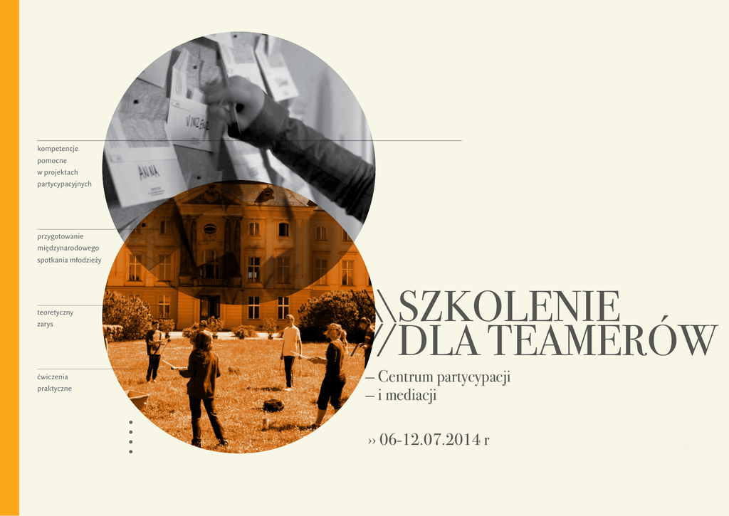 kompetencje pomocne w projektach partycypacyjnych przygotowanie międzynarodowego spotkania młodzieży teoretyczny zarys ćwiczenia praktyczne \\\SZKOLENIE ///DLA TEAMERÓW — Centrum partycypacji — i mediacji ›› 06-12.07.2014 r | Zgłoś się! Partnerzy wsparcie inansowe | | Tematy szkolenia | Listy motywacyjne prosimy przesłać do Zamku Trebnitz najpóźniej do dnia 15.06.2014 r.na adres [email protected]. faza poznawania się oczekiwania | | uczestników metody dydaktyka | polityczna pedagogika przeżyć | | Osoba kontaktowa Anna Czechowska Tel. 033477 519-18 Mail: [email protected]. animacja językowa kreatywna | pedagogika artystyczna pedagogika | Opłata za udział w szkoleniu historyczna edukacja zrównoważonego 50 EUR dla uczestniczek i uczestników z Niemiec rozwoju pedagogika zabawy | | | procesy grupowe empowerment 30 EUR dla uczestniczek i uczestników z Polski | emancypacyjna praca z młodymi | Opłata ta obejmuje zakwaterowanie i wyżywienie w Zamku Trebnitz oraz materiały szkoleniowe. dorosłymi konlikty i rozwiązywanie | konliktów interkulturowe uczenie się | Organizatorzy zapewniają tłumaczenie symultaniczne podczas seminarium. | praca w teamie zarządzanie projektami (przygotowanie, tworzenie programu i Projekt jest współfinansowany ze środków Europejskiego Funduszu Rozwoju Regionalnego w ramach Programu Operacyjnego Współpracy Transgranicznej Polska (Województwo Lubuskie) – Brandenburgia 2007-2013, Fundusz Małych Projektów i Projekty Sieciowe Euroregionu Pro Europa Viadrina Pokonywać granice poprzez wspólne inwestowanie w przyszłość. Das Projekt wird aus Mitteln des Europäischen Fonds für Regionale Entwicklung im Rahmen des Operationellen Programms der grenzübergreifenden Zusammenarbeit Polen (Wojewodschat Lubuskie) – Brandenburg 2007-2013, Small Project Fund und Netzwerkprojektefonds der Euroregion Pro Europa Viadrina, koinanziert. Grenzen überwinden durch gemeinsame Investition in die Zukunt. | | releksja) ewaluacja pożegnanie. | Zostań częścią naszej grupy teamerów | Teoretyczny zarys i ćwiczenia praktyczne Centrum Partycypacji i Mediacji przy Zamku Trebnitz zaprasza w lipcu na pierwsze szkolenie dla teamerów (osób prowadzących spotkania/projekty). Jego nadrzędnym celem jest stworzenie bazy teamerów, z której to w przyszłości będzie korzystać Berlińsko-Brandenburska Organizacja Młodzieży Wiejskiej (BBL e.V.) oraz Zamek Trebnitz (Schloß Trebnitz e.V.) przy realizacji projektów partycypacyjnych (także międzynarodowych). Szkolenie jest kierowane do młodych dorosłych pracujących lub mających zamiar pracować z młodzieżą lub młodymi dorosłymi. | Zostań częścią teamu i rozwijaj pomysły na własne projekty partycypacyjne | Wspólne kształtowanie czasu wolnego i skupienie się na dynamice grupy przyczyni się do tego, by sens przekazywanych teoretycznych treści szkolenia mógł zostać od razu poddany praktycznej releksji. Interaktywny przebieg siedmiodniowego szkolenia pozwoli na poznanie wszystkich istotnych faz międzynarodowych spotkań młodzieży, a charakter pracy pozwoli odpowiednio połączyć treści merytoryczne z przestrzenią zdobywania doświadczeń. Uczestniczki i uczestnicy będą aktywnie brać udział w kształtowaniu przebiegu szkolenia, w ten sposób zdobędą praktyczne doświadczenia w ramach przedsięwziętych przez nich działań ukierunkowanych na przeżycia. Poza tym wiele miejsca poświęcimy różnym metodom znajdującym zastosowanie podczas międzynarodowej pracy z młodzieżą i młodymi dorosłymi. Tak jak każdy projekt, tak i to szkolenie będzie miało za zadanie przyczynić się do nawiązania i utrzymania kontaktów także po jego zakończeniu oraz do stworzenia skutecznych i zmotywowanych teamów prowadzących. Celem tego działania jest zbudowanie całego zespołu teamerów przy Zamku Trebnitz. Podczas szkolenia jego uczestniczki i uczestnicy opracują koncepcje dla własnych projektów partycypacyjnych, które będę następnie zrealizowane z Zamkiem Trebnitz i BBL. | Formularz aplikacyjny uczestnictwa w szkoleniu dla teamerów Nazwisko, imię (ewent. także nazwa organizacji/ instytucji wysyłającej) Formularz aplikacyjny należy przesłać najpóźniej do 15.06.2014 r. na adres e-mail: [email protected] O przyjęciu lub odrzuceniu Państwa aplikacji poinformujemy Państwa pisemnie najpóźniej do dnia 20.06.2014 r. Z wykształcenia jestem Wcześniej sam(a) realizowałam/-em następujące projekty Obecnie pracuję jako/w Data urodzenia Adres zamieszkania Wcześniej brałam/-em udział w następujących międzynarodowych projektach Chcę wziąć udział w szkoleniu dla teamerów, ponieważ Telefon wraz z nr kierunkowym Faks / Tel. komórkowy E-mail