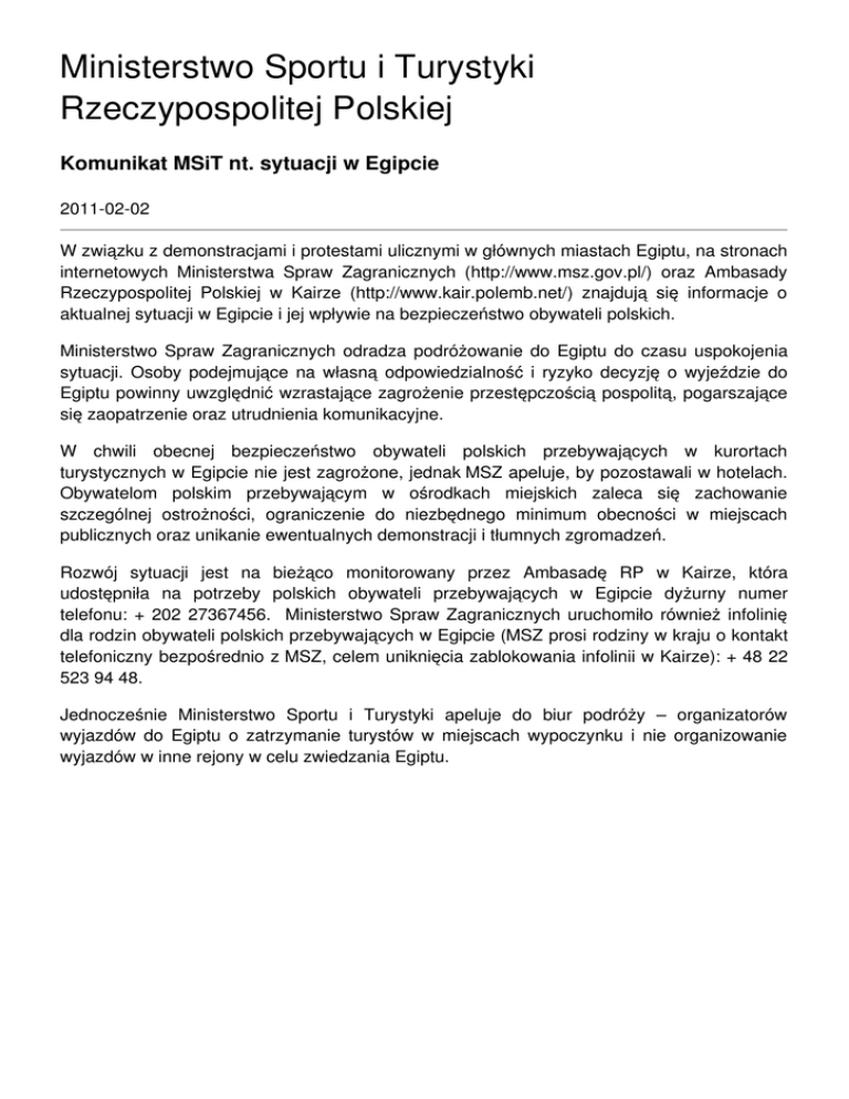 Ministerstwo Sportu i Turystyki Rzeczypospolitej Polskiej Komunikat MSiT nt. sytuacji w Egipcie 2011-02-02 W związku z demonstracjami i protestami ulicznymi w głównych miastach Egiptu, na stronach internetowych Ministerstwa Spraw Zagranicznych (http://www.msz.gov.pl/) oraz Ambasady Rzeczypospolitej Polskiej w Kairze (http://www.kair.polemb.net/) znajdują się informacje o aktualnej sytuacji w Egipcie i jej wpływie na bezpieczeństwo obywateli polskich. Ministerstwo Spraw Zagranicznych odradza podróżowanie do Egiptu do czasu uspokojenia sytuacji. Osoby podejmujące na własną odpowiedzialność i ryzyko decyzję o wyjeździe do Egiptu powinny uwzględnić wzrastające zagrożenie przestępczością pospolitą, pogarszające się zaopatrzenie oraz utrudnienia komunikacyjne. W chwili obecnej bezpieczeństwo obywateli polskich przebywających w kurortach turystycznych w Egipcie nie jest zagrożone, jednak MSZ apeluje, by pozostawali w hotelach. Obywatelom polskim przebywającym w ośrodkach miejskich zaleca się zachowanie szczególnej ostrożności, ograniczenie do niezbędnego minimum obecności w miejscach publicznych oraz unikanie ewentualnych demonstracji i tłumnych zgromadzeń. Rozwój sytuacji jest na bieżąco monitorowany przez Ambasadę RP w Kairze, która udostępniła na potrzeby polskich obywateli przebywających w Egipcie dyżurny numer telefonu: + 202 27367456. Ministerstwo Spraw Zagranicznych uruchomiło również infolinię dla rodzin obywateli polskich przebywających w Egipcie (MSZ prosi rodziny w kraju o kontakt telefoniczny bezpośrednio z MSZ, celem uniknięcia zablokowania infolinii w Kairze): + 48 22 523 94 48. Jednocześnie Ministerstwo Sportu i Turystyki apeluje do biur podróży – organizatorów wyjazdów do Egiptu o zatrzymanie turystów w miejscach wypoczynku i nie organizowanie wyjazdów w inne rejony w celu zwiedzania Egiptu.