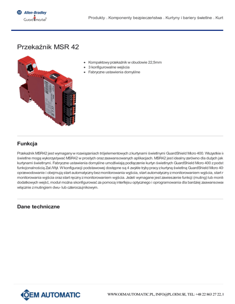 Produkty Komponenty bezpieczeństwa Kurtyny i bariery świetlne Kurtyny MI Przekaźnik MSR 42 Kompaktowy przekaźnik w obudowie 22,5mm 3 konfigurowalne wejścia Fabryczne ustawienia domyślne Funkcja Przekaźnik MSR42 jest wymagany w rozwiązaniach trójelementowych z kurtynami świetlnymi GuardShield Micro 400. Wszystkie inne kurt świetlne mogą wykorzystywać MSR42 w prostych oraz zaawansowanych aplikacjach. MSR42 jest idealny zarówno dla dużych jak i małyc kurtynami świetlnymi. Fabryczne ustawienia domyślne umożliwiają podłączenie kurtyn świetlnych GuardShield Micro 400 z podstawową funkcjonalnością Zał./Wył. W konfiguracji podstawowej dostępne są 4 zwykłe tryby pracy z kurtyną świetlną GuardShield Micro 400, wybie oprzewodowanie i obejmują start automatyczny bez monitorowania wyjścia, start automatyczny z monitorowaniem wyjścia, start ręczny b monitorowania wyjścia oraz start ręczny z monitorowaniem wyjścia. Jeżeli wymagane jest zawieszenie funkcji (muting) lub monitorowan dodatkowych wejść, moduł można skonfigurować za pomocą interfejsu optycznego i oprogramowania dla bardziej zaawansowanych ap włącznie z mutingiem dwu- lub czteroczujnikowym. Dane techniczne WWW.OEMAUTOMATIC.PL, [email protected], TEL: +48 22 863 27 22, FAX: +4 Napięcie zasilania Tolerancja Pobór prądu Wyjścia bezpieczeństwa sygnałowe Max prąd wyjścia Rozłączenie Wskazywanie stanu Stopień ochrony: Temperatura pracy Montaż Żywotność Kategoria bezpieczeństwa PL SIL PFHd Zgodność z Zaciski Obudowa 24 V DC -15 % + 20 % 70 mA 2 PNP 2 PNP bezpieczeństwa 400 mA sygnałowego 100 mA 15 ms (max.) 13 x LED IP20 IP20 0 °C do +55 °C Szyna DIN 2 x 107 4 wg EN 954-1 e wg. EN ISO 13849-1 3 wg. EN IEC 62061 8.97x10-10 MD, LVD, EMC Certyfikaty , , Właściwości WWW.OEMAUTOMATIC.PL, [email protected], TEL: +48 22 863 27 22, FAX: +4 W zależności od wymagań bezpieczeństwa • Zdublowane wyjście • Redundancja wewnętrzna/zewnętrzna • Monitorowanie wyjścia Zalety dla użytkownika • Konfiguracja podstawowa • Fixed blanking tylko Micro 400 • Szybka reakcja • Rozszerzalny • Pełna diagnostyka LED • Trzy wejścia • Możliwość opóźnienia wyjść • Międzynarodowe aprobaty LED Lamp GPI01-GPI04 OSSD2 OSSD1 OSSD2 OSSD1 Info1 Info2 IN1 IN 2 +24 V Stan lampy mutingu Stan wejść Micro 400 nieaktywowana Micro 400 nieaktywowana Micro 400 aktywowana (pole przerwane) Micro 400 aktywowana (pole przerwane) Reset OK Czekanie na sygnał resetu Blokada (błąd) Blokada (błąd) Bez sygnału testu Sygnał testu Brak sygnału zezwolenia startu Brak sygnału zezwolenia startu Zasilanie OK Konfiguracja wejść/wyjść GPIO/ podłączenia innych komponentów do MSR42 1 urządzenie (2 NC) E-STOP, wyłączniki drzwiowe 1 urządzenie (2 OSSD) Kurtyna Safe 2/4, Sensaguard, skaner laserowy 2 urządzenia (2 OSSD) Kurtyna Safe 2/4, Sensaguard, skaner laserowy Muting Micro 400 Funkcja mutingu Micro 400 Muting innych urządzeń (2OSSD) Muting dowolnej kurtyny świetlnej GuardShield Wejścia do resetowania/monitorowania IN1 Test input = wejście testowe IN2 Start = zezwolenie startu EDM = monitorowanie styczników zewnętrznych. Sygnał wejściowy EDM jest zawsze nadzorowany. Sygnał EDM musi być prawidłowy nie tylko przed startem. Także po starcie musi nastąpić zmiana sygnału, inaczej nastąpi awaryjne wyłączenie, jeśli ten błędny sygnał trwa dłużej niż 5s. WWW.OEMAUTOMATIC.PL, [email protected], TEL: +48 22 863 27 22, FAX: +4 Wymiary Podłączenia Poniżej są pokazane schematy podłączeń. Przekaźnik MSR42 jest dostarczany w konfiguracji bazowej z rysunku 1. 1. Nadzorowane kasowanie ręczne 2. Nadzorowane kasowanie ręczne z sygnałem zezwolenia Nadzorowanie styczników zewnętrznych. 3. Nadzorowane kasowanie ręczne z sygnałem zezwolenia na start 4. Kasowanie automatyczne. 5. Kasowanie automatyczne z sygnałem zezwolenia na start WWW.OEMAUTOMATIC.PL, [email protected], TEL: +48 22 863 27 22, FAX: +4 Numer katalogowy Nr katalogowy 440R-P226AGSNNR Opis MSR42 - moduł bazowy Download Instrukcje Produkt MSR42 Opis Manual Pobierz Opis Deklaracja zgodności Pobierz Ceryfikaty Produkt MSR42 WWW.OEMAUTOMATIC.PL, [email protected], TEL: +48 22 863 27 22, FAX: +4