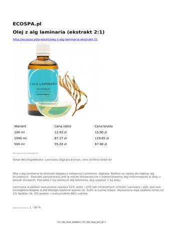 ECOSPA.pl Olej z alg laminaria (ekstrakt 2:1) http://ecospa.pl/produkt/olej-z-alg-laminaria-ekstrakt-21 Wariant Cena netto Cena brutto 100 ml 12.93 zł 15.90 zł 1000 ml 97.27 zł 119.65 zł 500 ml 55.20 zł 67.90 zł Olej z alg laminaria (ekstrakt 2:1) Skład INCI/Ingredients: Laminaria Digitata Extract, Vitis Vinifera Seed Oil Olej z alg laminaria to ekstrakt olejowy z listownicy Laminaria digitata. Roślina ta należy do rodziny alg brunatnych. Ekstrakt pozyskiwany jest w niskiej temperaturze z mikronizowanej algi macerowanej w oleju z pestek winogron. Potrzeba 2 kg świeżych alg laminaria, aby uzyskać 1 kg oleju. Laminaria w postaci wysuszonej zawiera 12% wody i 15% soli mineralnych (chlorki, siarczany i jod). Jest ona szczególnie bogata w jod którego stężenie wynosi ok. 0,8% w suchej masie. Wysuszona alga zawiera mniej niż 1% lipidów, ok. 5% protein i maksymalnie 65% cukrów. Zalecane dozowanie: 1 - 50 % TXT_PDF_PAGE_NUMBER 1 TXT_PDF_PAGE_OUT_OF 4 Właściwości alg laminaria: Laminaria jest głównie wykorzystywana w zwalczaniu cellulitu i otyłości, zarówno samodzielnie jak i w kombinacji z innymi ekstraktami wzmacniającymi jej działanie. Sole mineralne, a szczególnie jod, stymulują ogólny metabolizm i powodują wzrost wymiany osmotycznej, przyczyniając się tym samym do eliminowania nadmiaru płynów z organizmu. Fenomen ten został wykorzystany w kosmetykach modelujących. Ekstrakt z laminarii znalazł zastosowanie w preparatach do masażu, kąpieli oraz jako surowiec wspomagający kurację antycellulitową. Zastosowanie: Znajduje zastosowanie w kosmetykach ujędrniających i antycellulitowych – balsamy, kremy, masełka, serum itd. Może być stosowany jako olej bazowy w oliwkach do masażu. Stosuje się go w peelingach do ciała. W tym celu miesza się go z solą morską lub cukrem i olejkami eterycznymi. Przygotowanym peelingiem należy wykonać masaż ciała, szczególnie w miejscach trudnych do odchudzenia (udach, biodrach, pośladkach, brzuchu). Służy jako składnik maseczek i odżywek do włosów zniszczonych. Może być dodawany do kosmetyków dla cery dojrzałej, tracącej jędrność – kremy, serum, maseczki, oliwki, mleczka. Uwagi: Przy problemach z tarczycą (niedoczynność lub nadczynność), stosowanie alg zawsze warto skonsultować z lekarzem prowadzącym. Typ skóry Sucha 1 Tłusta 0 Normalna 1 Mieszana 1 Dojrzała 1 Atopowa 0 Naczynkowa 0 Trądzikowa 0 Wrażliwa 0 TXT_PDF_PAGE_NUMBER 2 TXT_PDF_PAGE_OUT_OF 4 Działanie Anti-aging 0 Antybakteryjne 0 Antycellulitowe 1 Dezodorujące 0 Kojące 1 Liftingujące 0 Mineralizujące 1 Natłuszczające 1 Nawilżające 0 Ochorona UV 0 Oczyszczające 0 Odżywiające 1 Przeciw rozstępom 1 Przeciwobrzękowe 1 Przeciwzapalne 0 Przeciwzmarszczkowe 0 Regenerujące 0 Regulujące sebum 0 Relaksujące 0 Rozjąśniające 0 Stymulacja krążenia 0 Ściągające 0 Tonizujące 0 Ujędrniające 1 Wyszczuplające 1 Złuszczające 0 Obszar Aplikacji Włosy i skóra głowy 0 Twarz 0 Okolice oczu 0 Szyja i dekolt 0 TXT_PDF_PAGE_NUMBER 3 TXT_PDF_PAGE_OUT_OF 4 Biust 0 Ciało 1 Dłonie i paznokcie 0 Stopy 0 Wiek Dla dzieci 0 Dla młodzierzy 0 20/30 1 40/50 1 60+ 1 TXT_PDF_PAGE_NUMBER 4 TXT_PDF_PAGE_OUT_OF 4