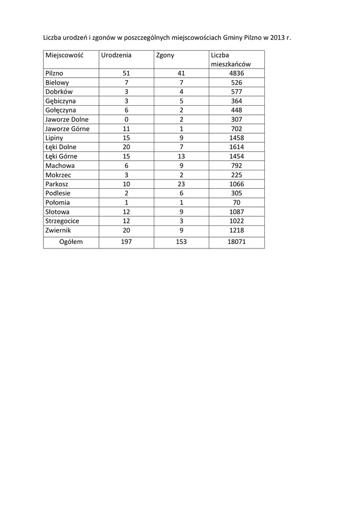 Liczba urodzeń i zgonów w poszczególnych miejscowościach Gminy Pilzno w 2013 r. Miejscowość Pilzno Bielowy Dobrków Gębiczyna Gołęczyna Jaworze Dolne Jaworze Górne Lipiny Łęki Dolne Łęki Górne Machowa Mokrzec Parkosz Podlesie Połomia Słotowa Strzegocice Zwiernik Ogółem Urodzenia Zgony 51 7 3 3 6 0 11 15 20 15 6 3 10 2 1 12 12 20 41 7 4 5 2 2 1 9 7 13 9 2 23 6 1 9 3 9 197 153 Liczba mieszkańców 4836 526 577 364 448 307 702 1458 1614 1454 792 225 1066 305 70 1087 1022 1218 18071