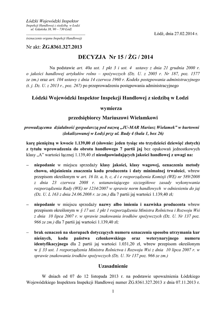 Łódzki Wojewódzki Inspektor Inspekcji Handlowej z siedzibą w Łodzi ul. Gdańska 38, 90 – 730 Łódź Łódź, dnia 27.02.2014 r. ..................................................... (oznaczenie organu Inspekcji Handlowej) Nr akt: ŻG.8361.327.2013 DECYZJA Nr 15 / ŻG / 2014 Na podstawie art. 40a ust. 1 pkt 3 i ust. 4 ustawy z dnia 21 grudnia 2000 r. o jakości handlowej artykułów rolno – spożywczych (Dz. U. z 2005 r. Nr 187, poz. 1577 ze zm.) oraz art. 104 ustawy z dnia 14 czerwca 1960 r. Kodeks postępowania administracyjnego (t. j. Dz. U. z 2013 r., poz. 267) po przeprowadzeniu postępowania administracyjnego Łódzki Wojewódzki Inspektor Inspekcji Handlowej z siedzibą w Łodzi wymierza przedsiębiorcy Mariuszowi Wielamkowi prowadzącemu działalność gospodarczą pod nazwą „JU-MAR Mariusz Wielamek” w hurtowni zlokalizowanej w Łodzi przy ul. Budy 4 (hala 1, box 26) karę pieniężną w kwocie 1.139,00 zł (słownie: jeden tysiąc sto trzydzieści dziewięć złotych) z tytułu wprowadzenia do obrotu handlowego 7 partii jaj bez opakowań jednostkowych klasy „A” wartości łącznej 1.139,40 zł nieodpowiadających jakości handlowej z uwagi na: niepodanie w miejscu sprzedaży klasy jakości, klasy wagowej, oznaczenia metody chowu, objaśnienia znaczenia kodu producenta i daty minimalnej trwałości, wbrew przepisom określonym w art. 16 lit. a, b, c, d i e rozporządzenia Komisji (WE) nr 589/2008 z dnia 23 czerwca 2008 r. ustanawiającego szczegółowe zasady wykonywania rozporządzenia Rady (WE) nr 1234/2007 w sprawie norm handlowych w odniesieniu do jaj (Dz. U. L 163 z dnia 24.06.2008 r. ze zm.) dla 7 partii jaj wartości 1.139,40 zł; niepodanie w miejscu sprzedaży nazwy albo imienia i nazwiska producenta wbrew przepisom określonym w § 17 ust. 1 pkt 1 rozporządzenia Ministra Rolnictwa i Rozwoju Wsi z dnia 10 lipca 2007 r. w sprawie znakowania środków spożywczych (Dz. U. Nr 137 poz. 966 ze zm.) dla 7 partii jaj wartości 1.139,40 zł; brak oznaczeń na skorupach dotyczących numeru oznaczenia sposobu utrzymania kur nieśnych, kodu państwa członkowskiego oraz weterynaryjnego numeru identyfikacyjnego dla 2 partii jaj wartości 1.031,20 zł, wbrew przepisom określonym w § 33 ust. 1 rozporządzenia Ministra Rolnictwa i Rozwoju Wsi z dnia 10 lipca 2007 r. w sprawie znakowania środków spożywczych (Dz. U. Nr 137 poz. 966 ze zm.) Uzasadnienie W dniach od 07 do 12 listopada 2013 r. na podstawie upoważnienia Łódzkiego Wojewódzkiego Inspektora Inspekcji Handlowej numer ŻG.8361.327.2013 z dnia 07.11.2013 r. 1 inspektorzy Wojewódzkiego Inspektoratu Inspekcji Handlowej w Łodzi, przeprowadzili kontrolę w hurtowni zlokalizowanej w Łodzi przy ul. Budy 4 (hala 1, box 26), należącej do Mariusza Wielamka, wykonującego działalność gospodarczą pod nazwą „JU-MAR Mariusz Wielamek”. Kontrolę przeprowadzono na podstawie przepisów art. 3 ust. 1 - 3 rozporządzenia Parlamentu Europejskiego i Rady (WE) Nr 882/2004 z dnia 29 kwietnia 2004 r. w sprawie kontroli urzędowych przeprowadzanych w celu sprawdzenia zgodności z prawem paszowym i żywnościowym oraz regułami dotyczącymi zdrowia zwierząt i dobrostanu zwierząt (Dz. U. L 165 z 30.4.2004 ze zm.), art. 17 ust. 3 ustawy z dnia 21 grudnia 2000 r. o jakości handlowej artykułów rolno-spożywczych (Dz. U. z 2005 r. nr 187, poz. 1577, ze zm.), art. 3 ust. 1 pkt 1, 2 i 6 ustawy z dnia 15 grudnia 2000 r. o Inspekcji Handlowej (Dz. U. z 2009 r. Nr 151, poz. 1219 ze zm.) w obecności właściciela Mariusza Wielamka. W trakcie prowadzonych działań kontrolnych stwierdzono, że do sprzedaży detalicznej oferowano 7 partii jaj bez opakowań w ilości 2.560 sztuk o łącznej wartości 1.139,40 zł, w tym: 60 sztuk w cenie 0,31 zł za sztukę, oznaczonych na skorupie „3 PL 100313303”, zaś na wywieszce jako „2A 0,31”, , 60 sztuk w cenie 0,35 zł za sztukę, oznaczonych na skorupie „3 PL100313303”, zaś na wywieszce jako „1b 0,35”, , 60 sztuk w cenie 0,39 zł za sztukę, oznaczonych na skorupie „3 PL 100313303”, zaś na wywieszce jako „1A 0,39”, 60 sztuk w cenie 0,42 zł za sztukę, oznaczonych na skorupie „3 PL 041413033”, zaś na wywieszce jako „0 0,42”, 40 sztuk w cenie 0,50 zł za sztukę, oznaczonych na skorupie „3 PL041413033”, zaś na wywieszce jako „Extra 0,50”, 1360 sztuk bez oznaczeń na skorupie, deklarowanych ustnie jako jaja świeże w cenie 0,42 zł za sztukę, 920 sztuk bez oznaczeń na skorupie deklarowanych ustnie jako jaja świeże w cenie 0,50 zł za sztukę, dla których w miejscu sprzedaży nie podano klasy jakości, klasy wagowej, oznaczenia metody chowu, objaśnienia znaczenia kodu producenta, daty minimalnej trwałości wbrew postanowieniom art. 16 lit. a, b, c, d i e rozporządzenia Komisji (WE) nr 589/2008 z dnia 23 czerwca 2008 r. ustanawiającego szczegółowe zasady wykonywania rozporządzenia Rady (WE) nr 1234/2007 w sprawie norm handlowych w odniesieniu do jaj (Dz. U. L 163 z dnia 24.06.2008 r. ze zm.) zwanego dalej „rozporządzeniem 589/2008” oraz nazwy albo imienia i nazwiska producenta wbrew przepisom określonym w § 17 ust. 1 pkt 1 rozporządzenia Ministra Rolnictwa i Rozwoju Wsi z dnia 10 lipca 2007 r. w sprawie znakowania środków spożywczych (Dz. U. Nr 137 poz. 966 ze zm.) zwanego dalej „rozporządzeniem w sprawie znakowania środków spożywczych”. Dodatkowo wprowadzone do obrotu 2 partie jaj (1.360 sztuk w cenie 0,42 zł i 920 sztuk w cenie 0,50 zł za sztukę) wartości łącznej 1.031,40 zł, nie posiadały na skorupach oznaczeń dotyczących numeru oznaczenia sposobu utrzymania kur nieśnych, kodu państwa członkowskiego oraz weterynaryjnego numeru identyfikacyjnego producenta, co naruszało § 33 ust. 1 rozporządzenia w sprawie znakowania środków spożywczych . Przedmiotowe jaja 2 decyzją z dnia 07 listopada 2013 r. zostały wycofane z obrotu handlowego. Mariusz Wielamek zakup jaj bez oznaczeń na skorupach ud