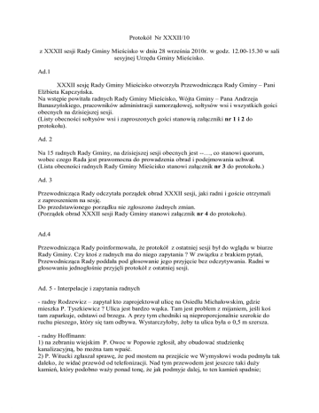 Protokół Nr XXXII/10 z XXXII sesji Rady Gminy Mieścisko w dniu 28 września 2010r. w godz. 12.00-15.30 w sali sesyjnej Urzędu Gminy Mieścisko. Ad.1 XXXII sesję Rady Gminy Mieścisko otworzyła Przewodnicząca Rady Gminy – Pani Elżbieta Kapczyńska. Na wstępie powitała radnych Rady Gminy Mieścisko, Wójta Gminy – Pana Andrzeja Banaszyńskiego, pracowników administracji samorządowej, sołtysów wsi i wszystkich gości obecnych na dzisiejszej sesji. (Listy obecności sołtysów wsi i zaproszonych gości stanowią załączniki nr 1 i 2 do protokołu). Ad. 2 Na 15 radnych Rady Gminy, na dzisiejszej sesji obecnych jest --…, co stanowi quorum, wobec czego Rada jest prawomocna do prowadzenia obrad i podejmowania uchwał. (Lista obecności radnych Rady Gminy Mieścisko stanowi załącznik nr 3 do protokołu.) Ad. 3 Przewodnicząca Rady odczytała porządek obrad XXXII sesji, jaki radni i goście otrzymali z zaproszeniem na sesję. Do przedstawionego porządku nie zgłoszono żadnych zmian. (Porządek obrad XXXII sesji Rady Gminy stanowi załącznik nr 4 do protokołu). Ad.4 Przewodnicząca Rady poinformowała, że protokół z ostatniej sesji był do wglądu w biurze Rady Gminy. Czy ktoś z radnych ma do niego zapytania ? W związku z brakiem pytań, Przewodnicząca Rady poddała pod głosowanie jego przyjęcie bez odczytywania. Radni w głosowaniu jednogłośnie przyjęli protokół z ostatniej sesji. Ad. 5 - Interpelacje i zapytania radnych - radny Rodzewicz – zapytał kto zaprojektował ulicę na Osiedlu Michałowskim, gdzie mieszka P. Tyszkiewicz ? Ulica jest bardzo wąska. Tam jest problem z mijaniem, jeśli koś tam zaparkuje, odstawi od brzegu. A przy tym chodniki są nieproporcjonalnie szerokie do ruchu pieszego, który się tam odbywa. Wystarczyłoby, żeby ta ulica była o 0,5 m szersza. - radny Hoffmann: 1) na zebraniu wiejskim P. Owoc w Popowie zgłosił, aby obudować studzienkę kanalizacyjną, bo można tam wpaść. 2) P. Witucki zgłaszał sprawę, że pod mostem na przejście we Wymysłowi woda podmyła tak daleko, że widać przewód od telefonizacji. Nad tym przewodem jest jeszcze taki duży kamień, który podobno waży ponad tonę, że jak podmyje dalej, to ten kamień spadnie; - radny Kuryłowicz: 1) Czy będzie robiony przegląd oświetlenia ? W Jaroszewie jedna lampa nie świeci już od wiosny. Na zimę trzebaby ją naprawić; 2) asfalt na Kłodzin. Był na wiosnę trochę poklejony, ale już takie duże dziury zrobiły się, że można koło urwać; 3) czy jest możliwość otrzymania tłucznia, szlaki, kruszywa na gminne drogi dojazdowe do pól. Głównie chodzi o drogę Borkowicz – Król. Mleczarek jedzie po to mleko i jak to się zacznie wybijać to nie przejedzie. Przydałby się chociaż transport kruszywa żeby rozgarnąć; -radny Górski: 1) czy byłaby możliwość założenie lampy oświetleniowej na Osiedlu Michałowskim koło P. Mazurkiewiczów z tyłu ? Tam jest dosyć ciemno. 2) na ul. Janowieckiej pod koniec asfaltu po prawej stronie na poboczu zrobiła się dość duża wyrwa. Czy byłoby to możliwe jeszcze przed zimą załatać ? -P. Witucki: 1) na początku roku w ramach interpelacji zgłaszał do Powiatowego Zarządu Dróg o załatanie dziur w Sarbii i wyrównanie równiarką drogi w kierunku Łosińca. Dostałem odpowiedź, że to zostanie zrobione w okresie wiosenno – letnim, okres się skończył. Do tego czasu dziury nie załatane i droga jest niewyrównana. 2) czy będzie położony asfalt w kierunku do cmentarza w Podlesiu Kościelnym ? - radna Starosta – nie świeci lampa koło pierwszego bloku w Popowie Kościelnym a także Panie, które dojeżdżają do Listera i Kozichgłów mówią, że pierwsze dwie lampy od cmentarza co idą wzdłuż drogi do stacji, jedna jest zbita i jest tam bardzo ciemno, jak jadą o 3.00, 4.00 do pracy to jest ciemno. - radny Rodzewicz: 1) jak daleko jest sprawa z tymi z tymi studzienkami przez Mieścisko, bo one coraz bardziej obniżają się ? Jak jadą ciężarowe w nocy to jest duży huk. Niech będzie zrobione tak jak jest w Czerwonaku; 2) problem planu Osiedla Michałowskiego. Spotkałem się z Panem, który błądził. Ja też nie wiedziałem. Jak tam ktoś nie mieszka to nie wie. Karetka pogotowia też błądziła. - radna Kapczyńska – mówiliśmy o słupkach z numerami. Przy wjeździe do Osiedla miała być tabliczka z nazwą Osiedla i numerami od. --do. Ad. – Zapytania sołtysów - P. Toboła – sołtys wsi Gołaszewo: 1) myśmy mieli zaplanowane 3 transporty tłucznia. Do tej pory dojechał tylko 1 transport. Są dziury., woda stoi i mieszkańcy nie mogą przejść; 2) odnośnie oświetlenia. Lampy często nie świecą. Na lampach nie ma żadnej widocznej numeracji; - P. Borowska – sołtys wsi Wiela - prosiła o równiarkę z Wieli do domu kolejowego oraz wymianę żarówki przy 3 słupie. Jest problem z odczytaniem numeracji na słupie; 2 - P. Kmieciak – sołtys wsi Jaroszewo Drugie: 1) sprawa koszy. Są przepełnione. Przy koszach są pełne worki i beczka jest pełna. Psy to rozwalają. Ja zgłaszałem to w Urzędzie P.Kapczyńskiemu, który wyjaśnił, że firmy nie przyjeżdżają; 2) w Jaroszewie zostały zamontowane 2 oczyszczalnie przydomowe. Prawdopodobnie jeszcze dwie mają powstać w tym roku i chciałbym się dowiedzieć czy jakieś rekompensaty mieszkańcy dostaną z tego tytułu ? 3) do spółki zwracałem się kiedy w Jaroszewie woda przerwała asfalt. Jest tam zamontowana studzienka dość głęboka i tam zginęła pokrywa. Jakby dzieci szły do szkoły i ktoś kogoś popchnął, to nie ma szans żeby wyjść; - P.Nawrocki – sołtys wsi Nieświastowice - w sprawie wywozu szamba przez Spółdzielnię w Popowie Kościelnym . My regularnie mamy zalaną wieś i tam się nic nie dzieje. - P. Rolewski – sołtys wsi Pląskowo: 1)na drodze powiatowej biegnącej przez Pląskowo, jak wyjeżdżamy z Pląskowa z wioski to tam jest tak bardzo zarośnięte, że nie w