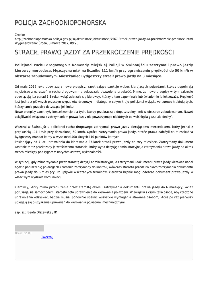 POLICJA ZACHODNIOPOMORSKA Źródło: http://zachodniopomorska.policja.gov.pl/sz/aktualnosci/aktualnosci/7567,Stracil-prawo-jazdy-za-przekroczenie-predkosci.html Wygenerowano: Środa, 8 marca 2017, 09:23 STRACIŁ PRAWO JAZDY ZA PRZEKROCZENIE PRĘDKOŚCI Policjanci ruchu drogowego z Komendy Miejskiej Policji w Świnoujściu zatrzymali prawo jazdy kierowcy mercedesa. Mężczyzna miał na liczniku 111 km/h przy ograniczeniu prędkości do 50 km/h w obszarze zabudowanym. Mieszkaniec Bydgoszczy stracił prawo jazdy na 3 miesiące. Od maja 2015 roku obowiązują nowe przepisy, zaostrzające sankcje wobec kierujących pojazdami, którzy popełniają najcięższe z naruszeń w ruchu drogowym - przekraczają dozwoloną prędkość. Mimo, że nowe przepisy w tym zakresie obowiązują już ponad 1,5 roku, wciąż zdarzają się kierowcy, którzy o tym zapominają lub świadomie je lekceważą. Prędkość jest jedną z głównych przyczyn wypadków drogowych, dlatego w całym kraju policjanci wyjątkowo surowo traktują tych, którzy łamią przepisy dotyczące jej limitu. Nowe przepisy zaostrzyły konsekwencje dla tych, którzy przekraczają dopuszczalny limit w obszarze zabudowanym. Nawet uciążliwość związana z zatrzymaniem prawa jazdy nie powstrzymuje niektórych od wciśnięcia gazu „do dechy”. Wczoraj w Świnoujściu policjanci ruchu drogowego zatrzymali prawo jazdy kierującemu mercedesem, który jechał z prędkością 111 km/h przy dozwolonej 50 km/h. Oprócz zatrzymania prawa jazdy, stróże prawa nałożyli na mieszkańca Bydgoszczy mandat karny w wysokości 400 złotych i 10 punktów karnych. Posiadający od 7 lat uprawnienia do kierowania 27-latek stracił prawo jazdy na trzy miesiące. Zatrzymany dokument zostanie teraz przekazany je właściwemu staroście, który wyda decyzję administracyjną o zatrzymaniu prawa jazdy na okres trzech miesięcy pod rygorem natychmiastowej wykonalności. W sytuacji, gdy mimo wydania przez starostę decyzji administracyjnej o zatrzymaniu dokumentu prawa jazdy kierowca nadal będzie poruszał się po drogach i zostanie zatrzymany do kontroli, wówczas starosta przedłuża okres zatrzymania dokumentu prawa jazdy do 6 miesięcy. Po upływie wskazanych terminów, kierowca będzie mógł odebrać dokument prawa jazdy w właściwym wydziale komunikacji. Kierowcy, który mimo przedłużenia przez starostę okresu zatrzymania dokumentu prawa jazdy do 6 miesięcy, wciąż poruszają się samochodem, starosta cofa uprawnienia do kierowania pojazdem. W związku z czym taka osoba, aby rzeczone uprawnienia odzyskać, będzie musiał ponownie spełnić wszystkie wymagania stawiane osobom, które po raz pierwszy ubiegają się o uzyskanie uprawnień do kierowania pojazdami mechanicznymi. asp. szt. Beata Olszewska / IK Ocena: 0/5 (0) Tweetnij