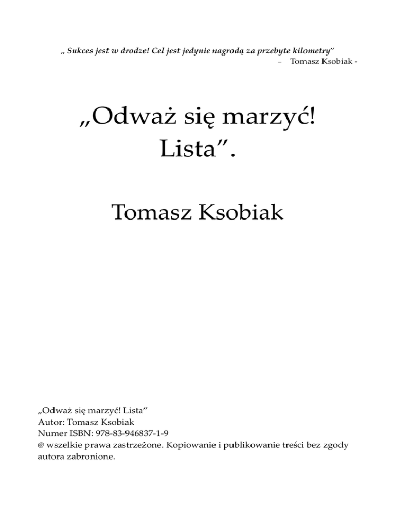 „ Sukces jest w drodze! Cel jest jedynie nagrodą za przebyte kilometry” – Tomasz Ksobiak - „Odważ się marzyć! Lista”. Tomasz Ksobiak „Odważ się marzyć! Lista” Autor: Tomasz Ksobiak Numer ISBN: 978-83-946837-1-9 @ wszelkie prawa zastrzeżone. Kopiowanie i publikowanie treści bez zgody autora zabronione. Sukces jest w drodze! Cel jest jedynie nagrodą za przebyte kilometry. To zdanie jest kwintesencją mojego dotychczasowego życia. Mam nadzieję, że dla Ciebie stanie się motywacją do faktycznego działania! „Sukces jest w drodze...”, to również metoda na życie, którą staram się propagować i przekazywać każdemu, kto chce stać się świadomym kreatorem własnego życia. To swego rodzaju program coachingowy oparty o 48 możliwości wprowadzania zmian i dążenia do sukcesu: sześć obszarów życia na ośmiu poziomach uczenia się i zmiany. Każdy człowiek na świecie – ja, Ty, Twoi znajomi, rodzina czy przyjaciele działa w sześciu zasadniczych obszarach, w których może budować szczęście i sukces. Należą do nich: praca, zdrowie, relacje międzyludzkie, czas wolny, rozwój osobisty i finanse. Każdy z nich jest równie ważny a na dodatek wszystkie wzajemnie się przenikają. Bez wprowadzania zmian w każdym z tych obszarów jednocześnie nie jest możliwe zbudowanie naprawdę szczęśliwego życia człowieka sukcesu! Dlatego należy bezwzględnie dążyć do wprowadzenia w każdym z wymienionych obszarów jak największej ilości pozytywnych zmian oraz dbać o utrzymanie równowagi pomiędzy poszczególnymi aspektami: 1. Praca: prawdziwy sukces daje połączenie pracy zawodowej z pasją. Tylko wówczas możesz odczuwać satysfakcję finansową, ale również w pełni poświęcić się każdemu zadaniu bez konieczności angażowania ogromnych nakładów energii na jego wykonanie. Praca nie będzie Cię męczyć i jest wielce prawdopodobne, a w zasadzie pewne, że nie będziesz wyczekiwał kolejnego weekendu już od poniedziałku! Wręcz przeciwnie – w piątek zaczniesz odliczać godziny do początku nowego tygodnia. 2. Zdrowie: chyba nie potrzeba tłumaczyć tego aspektu naszego życia. Dobre zdrowie to sprawne ciało i umysł. Sprawne ciało, to możliwość bezproblemowego funkcjonowania w środowisku a wolny od obciążeń chorobowych umysł jest kreatywny i potrafi rozwiązać każdy pojawiający się problem. 3. Relacje międzyludzkie: Ci, z którymi przebywasz – koledzy z pracy, rodzina, znajomi i przyjaciele mają na Ciebie potężny wpływ! To właśnie oni bezpośrednio wpływają na Twoją osobowość i fakt, czy działasz nad polepszeniem własnego życia, czy wręcz przeciwnie – stoisz w miejscu. Ludzie, z którymi przebywamy, spotykamy się na różnych poziomach życia dosłownie „kodują” nasze umysły. Od Ciebie tylko zależy, czy to kodowanie będzie negatywne, czy pozytywne. 4. Czas wolny: to jedna z najważniejszych rzeczy w Twoim życiu! Przecież ono nie polega tylko na wykonywaniu określonej pracy i zarabianiu pieniędzy na potrzeby swoje i Twoich bliskich! Musisz pamiętać o tym, że jeśli nie potrafisz dać sobie odrobiny wolnego czasu każdego dnia, to jest wielce prawdopodobne, że niebawem staniesz się sfrustrowany i być może nabawisz się depresji, która bardzo ograniczy lub nawet uniemożliwi Ci jakikolwiek rozwój! 5. Rozwój osobisty: chyba najbardziej zaniedbywany obszar! Ciągły pośpiech, wyścig szczurów, brak czasu na „cokolwiek” sprawia, że dzisiejszy człowiek praktycznie w ogóle nie rozwija się wewnętrznie! Pomyśl, czy nie warto zatrzymać się choć na chwilę i zainwestować w siebie! 6. Finanse: pewnie uważasz pieniądze za najważniejsze w Twoim życiu. Przecież bez nich nie zrobisz praktycznie nic, prawda? Owszem – prawda! Różnica jednak pomiędzy ludźmi sukcesu (dbającymi o wszystkie sześć wyżej wymienionych obszarów) a „całą resztą” polega na tym, że ci pierwsi określają ile chcą zarabiać i według tego wskaźnika planują wszystko dookoła (w tym pracę czy rozwój osobisty), drudzy natomiast są „niewolnikami pieniądza” i przystosowują siebie i otaczającą ich rzeczywistość do ilości zarabianych pieniędzy. Widzisz różnicę? Wierzę, że skoro czytasz tę książkę, to jesteś właśnie na etapie chęci do wprowadzenia w swoje życie poważnych zmian. Zrobiłeś pierwszy, najtrudniejszy krok – podjąłeś decyzję, że chcesz coś (cokolwiek) zmienić! Już sam fakt podjęcia takiej decyzji stawia Cię w kręgu zwycięzców, choć musisz wiedzieć, że maraton jeszcze przed Tobą. Niemniej decyzja pozwala Ci