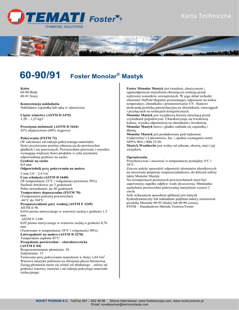Karta Techniczna 60-90/91 Foster Monolar® Mastyk Kolor 60-90 Biały 60-91 Szary Konsystencja nakładania Nakładanie szpatułką lub ręką w rękawiczce CięŜar właściwy (ASTM D 1475) 1,20 – 1,25 kg/l Przeciętna nielotność (ASTM D 1644) 42% objętościowo (60% wagowo) Pokrywanie (FSTM 72) (W zaleŜności od rodzaju pokrywanego materiału) Ilości przytoczone poniŜej odnoszą się do powierzchni gładkich i nie porowatych. Powierzchnie porowate i szorstkie wymagają większej ilości produktu w celu uzyskania odpowiedniej grubości na sucho. Grubość na sucho 0,9 mm Odpowiednik przy pokrywaniu na mokro 2 2 mm 2,0 – 2,4 l/m Czas schnięcia (ASTM D 1640) (W temperaturze 23°C i wilgotności powietrza 50%) Suchość dotykowa: po 3 godzinach Pełne utwardzenie: po 48 godzinach Temperatury dopuszczalne (FSTM 70) (Temperatura pokrytej powierzchni) -46°C do 104°C Przepuszczalność pary wodnej (ASTM F 1249) ASTM E 96 0,016 perma metrycznego w warstwie suchej o grubości 1,3 mm ASTM F-1249 0,02 perma metrycznego w warstwie suchej o grubości 0,76 mm (Testowano w temperaturze 38°C i wilgotności 90%) Łatwopalność na mokro (ASTM D 3278) Temperatura zapłonu 43°C Przepalanie powierzchni – charakterystyka (ASTM E 84) Rozprzestrzenianie płomienia: 10 Zadymianie: 15 Testowano przy pokrywaniu mastykiem w ilości 1,64 l/m2. Warstwa mastyku połoŜona na zbrojonej płycie betonowej. Zasięg płomienia moŜe się róŜnić od zbadanego – zaleŜy od grubości warstwy mastyku i od rodzaju pokrytego materiału izolacyjnego. Foster Monolar Mastyk jest twardym, elastycznym i ognioodpornym mastykiem chroniącym izolację przed wpływem warunków zewnętrznych. W jego skład wchodzi elastomer DuPont Hypalon gwarantujący odporność na niskie temperatury, chemikalia i promieniowanie UV. Stanowi doskonałą powłokę paroizolacyjną na zbiornikach, rurociągach i przyłączach na izolacjach kriogenicznych. Monolar Mastyk jest wyjątkową barierą chroniącą przed czynnikami pogodowymi. Charakteryzuje się trwałością koloru, wysoką odpornością na chemikalia i trwałością. Monolar Mastyk łatwo i gładko nakłada się szpatułką i dłonią. Monolar Mastyk jest produkowany pod nadzorem Underwriter’s Laboratories, Inc. i spełnia wymagania norm NFPA 90A i 90B 25/50. Mastyk Weatherite jest wolny od azbestu, ołowiu, rtęci i jej związków. Ograniczenia Przechowywać i stosować w temperaturze pomiędzy 4°C i 38°C. Zawsze naleŜy sprawdzić odporność elementów plastikowych na stosowane preparaty rozpuszczalnikowe, do których naleŜy takŜe Monolar Mastyk. Na zewnętrznych poziomych powierzchniach musi być zapewniony zupełny odpływ wody deszczowej. Minimalne nachylenie powierzchni pokrywanej mastykiem wynosi 2 cm/m. Jeśli wskazanym sposobem aplikacji jest natrysk hydrodynamiczny lub nakładanie pędzlem naleŜy zastosować powłokę Monolar 60-95 (biała) lub 60-96 (szara). FSTM – Standardowa Metoda Testowa Foster NOVET POZNAŃ S.C. Tel/Fax 061 – 652 48 86 Strona internetowa: www.fostereurope.com, www.novet.poznan.pl Email: [email protected] Sposób stosowania FOSTER MONOLAR® MASTYK 60-90 / 60-91 Przygotowanie mastyku Dokładnie wymieszać. NIE ROZCIEŃCZAĆ! Stosować na powierzchniach czystych i suchych. Pojemnik z mastykiem naleŜy przechowywać szczelnie zamknięty. Stosowanie Aby zapobiec przenikaniu wilgoci i pary wodnej przez tworzoną powłokę konieczne jest prawidłowe i dokładne, zgodne z zaleceniami, wysuszenie powłoki. 2 Normalne uŜytkowanie NałoŜyć warstwę mastyku MONOLAR o grubości 0,8 mm (odpowiada to zuŜyciu ok. 0,8 l/m ). Osadzić siatkę Foster MAST-A-FAB® w warstwie mastyku. Wygładzić siatkę. Siatka w miejscach połączeń musi zachodzić na siebie na co najmniej 50 mm. Następnie naleŜy nałoŜyć drugą warstwę mastyku MONOLAR o grubości co najmniej 2 1,2 mm (odpowiada to zuŜyciu ok. 1,2 l/m ). Druga warstwa mastyku nie moŜe być nakładana później niŜ 2 godziny po nałoŜeniu warstwy pierwszej i musi całkowicie pokrywać siatkę zbrojącą. Aplikacja mastyku zgodna z metodyką zapewnia powstanie warstwy ochronnej o grubości co najmniej 0,9 mm (po wyschnięciu). 2 UŜytkowanie w warunkach kriogenicznych i cięŜkich NaleŜy zwiększyć grubość pierwszej warstwy do zuŜycia 1,2 l/m i 2 drugiej warstwy do 1,6 l/m . Przed nałoŜeniem drugiej warstwy na powierzchniach pionowych naleŜy poczekać na związanie warstwy pierwszej. 2 Powłoka zbrojona Hex Mesh Wire Reinforcement (4,1 l/m ). Na izolacji (or dry primed cement), rozciągnąć ciasno heksagonalną siatkę zbrojącą. Zabezpieczyć drutując i wiąŜąc krawędzie siatki. 2 NałoŜyć szpatułką lub natryskowo pierwszą warstwę Mastyku WEATHERITE przy minimalnym zuŜyciu 2,0 l/m . UŜywając metalowej szpatułki wcisnąć mastyk w oczka siatki pokrywając obficie powierzchnię drutów siatki. Po co najmniej 4 godzinach (nie później jednak niŜ po 24 godzinach), czyli po tym jak pierwsza warstwa zacznie juŜ wyraźnie wiązać, 2 nałoŜyć drugą warstwę mastyku WEATHERITE w ilości ok. 2 l/m . Aplikacja mastyku zgodna z metodyką zapewnia powstanie warstwy ochronnej o grubości 2,3 mm (po wyschnięciu). (Ze względu na nierówności zabezpieczanych powierzchni grubość wykonanej warstwy ochronnej moŜe być miejscami większa. NaleŜy jednak unikać przekraczania grubości 2,5 mm warstwy ochronnej, aby wyeliminować ryzyko pękania jej powierzchni.) Nakładanie szpatułką UŜywać czystych stalowych szpatułek. Nakładać kaŜdą warstwę o pełnej wymaganej grubości przed rozpoczęciem wiązania mastyku. Unikać przesadnego szpachlowania. Nakładanie pędzlem UŜywać dobrej jakości pędzla przeznaczonego do farb na bazie wody. Mastyk rozprowadzać moŜliwie najdłuŜszymi ruchami. Nakładać pędzlem i równomiernie rozkładać. Nie nakładać zbyt grubej warstwy. Dla uzyskania poŜądanej minimalnej grubości suchej warstwy konieczne jest nakładanie wi