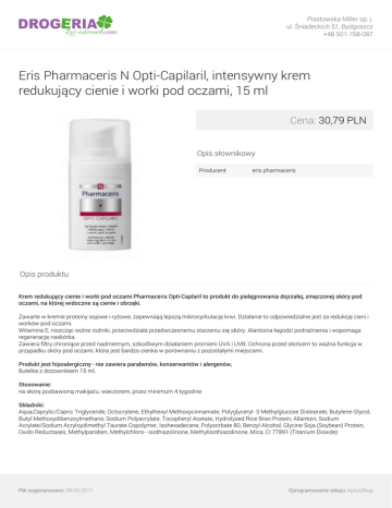 Piastowska Miller sp. j. ul. Śniadeckich 51, Bydgoszcz +48 501-768-087 Eris Pharmaceris N Opti-Capilaril, intensywny krem redukujący cienie i worki pod oczami, 15 ml Cena: 30,79 PLN Opis słownikowy Producent eris pharmaceris Opis produktu Krem redukujący cienie i worki pod oczami Pharmaceris Opti-Caplaril to produkt do pielęgnowania dojrzałej, zmęczonej skóry pod oczami, na której widoczne są cienie i obrzęki. Zawarte w kremie proteiny sojowe i ryżowe, zapewniają lepszą mikrocyrkulację krwi. Działanie to odpowiedzialne jest za redukcję cieni i worków pod oczami. Witamina E, niszcząc wolne rodniki, przeciwdziała przedwczesnemu starzeniu się skóry. Alantoina łagodzi podrażnienia i wspomaga regenerację naskórka. Zawiera filtry chroniące przed nadmiernym, szkodliwym działaniem promieni UVA i UVB. Ochrona przed słońcem to ważna funkcja w przypadku skóry pod oczami, która jest bardzo cienka w porównaniu z pozostałymi miejscami. Produkt jest hipoalergiczny - nie zawiera parabenów, konserwantów i alergenów, Butelka z dozownikiem 15 ml. Stosowanie: na skórę pozbawioną makijażu, wieczorem, przez minimum 4 tygodnie Składniki: Aqua,Caprylic/Capric Triglyceride, Octocrylene, Ethylhexyl Methoxycinnamate, Polyglyceryl- 3 Methylglucose Distearate, Butylene Glycol, Butyl Methoxydibenzoylmethane, Sodium Polyacrylate, Tocopheryl Acetate, Hydrolyzed Rice Bran Protein, Allantoin, Sodium Acrylate/Sodium Acryloydimethyl Taurate Copolymer, Isohexadecane, Polysorbate 80, Benzyl Alcohol, Glycine Soja (Soybean) Protein, Oxido Reductases, Methylparaben, Methylchloro- -isothiazolinone, Methylisothiazolinone, Mica, CI 77891 (Titanium Dioxide) Plik wygenerowano: 08-03-2017 Powered by TCPDF (www.tcpdf.org) Oprogramowanie sklepu: AptusShop