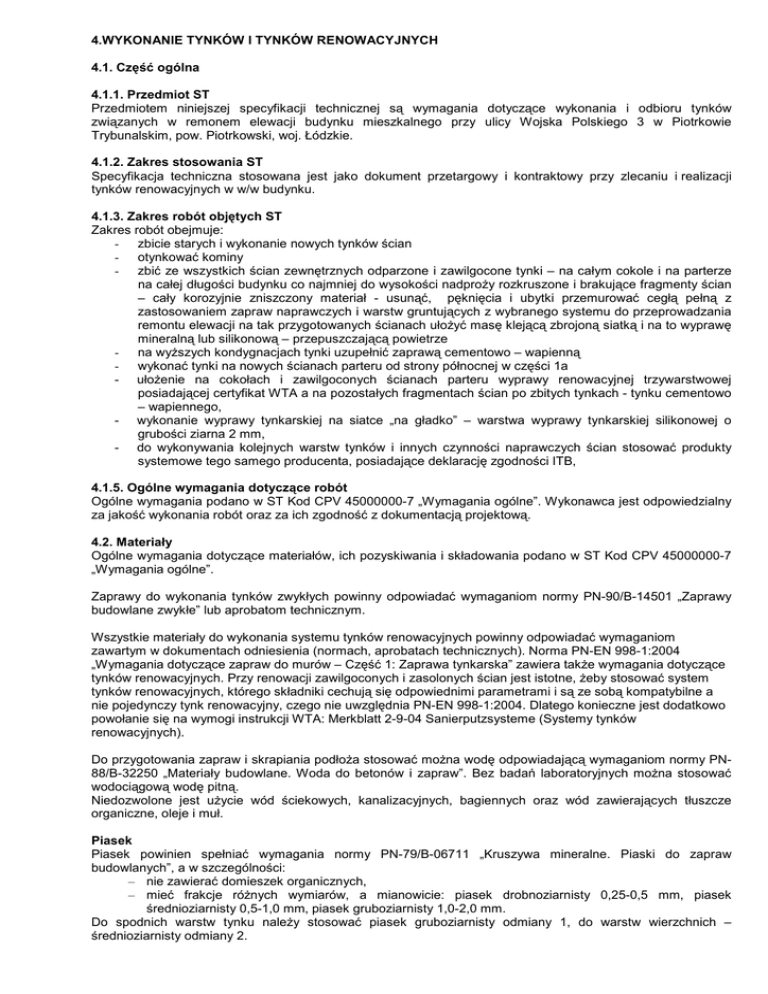 4.WYKONANIE TYNKÓW I TYNKÓW RENOWACYJNYCH 4.1. Część ogólna 4.1.1. Przedmiot ST Przedmiotem niniejszej specyfikacji technicznej są wymagania dotyczące wykonania i odbioru tynków związanych w remonem elewacji budynku mieszkalnego przy ulicy Wojska Polskiego 3 w Piotrkowie Trybunalskim, pow. Piotrkowski, woj. Łódzkie. 4.1.2. Zakres stosowania ST Specyfikacja techniczna stosowana jest jako dokument przetargowy i kontraktowy przy zlecaniu i realizacji tynków renowacyjnych w w/w budynku. 4.1.3. Zakres robót objętych ST Zakres robót obejmuje: - zbicie starych i wykonanie nowych tynków ścian - otynkować kominy - zbić ze wszystkich ścian zewnętrznych odparzone i zawilgocone tynki – na całym cokole i na parterze na całej długości budynku co najmniej do wysokości nadproży rozkruszone i brakujące fragmenty ścian – cały korozyjnie zniszczony materiał - usunąć, pęknięcia i ubytki przemurować cegłą pełną z zastosowaniem zapraw naprawczych i warstw gruntujących z wybranego systemu do przeprowadzania remontu elewacji na tak przygotowanych ścianach ułożyć masę klejącą zbrojoną siatką i na to wyprawę mineralną lub silikonową – przepuszczającą powietrze - na wyższych kondygnacjach tynki uzupełnić zaprawą cementowo – wapienną - wykonać tynki na nowych ścianach parteru od strony północnej w części 1a - ułożenie na cokołach i zawilgoconych ścianach parteru wyprawy renowacyjnej trzywarstwowej posiadającej certyfikat WTA a na pozostałych fragmentach ścian po zbitych tynkach - tynku cementowo – wapiennego, - wykonanie wyprawy tynkarskiej na siatce „na gładko” – warstwa wyprawy tynkarskiej silikonowej o grubości ziarna 2 mm, - do wykonywania kolejnych warstw tynków i innych czynności naprawczych ścian stosować produkty systemowe tego samego producenta, posiadające deklarację zgodności ITB, 4.1.5. Ogólne wymagania dotyczące robót Ogólne wymagania podano w ST Kod CPV 45000000-7 „Wymagania ogólne”. Wykonawca jest odpowiedzialny za jakość wykonania robót oraz za ich zgodność z dokumentacją projektową. 4.2. Materiały Ogólne wymagania dotyczące materiałów, ich pozyskiwania i składowania podano w ST Kod CPV 45000000-7 „Wymagania ogólne”. Zaprawy do wykonania tynków zwykłych powinny odpowiadać wymaganiom normy PN-90/B-14501 „Zaprawy budowlane zwykłe” lub aprobatom technicznym. Wszystkie materiały do wykonania systemu tynków renowacyjnych powinny odpowiadać wymaganiom zawartym w dokumentach odniesienia (normach, aprobatach technicznych). Norma PN-EN 998-1:2004 „Wymagania dotyczące zapraw do murów – Część 1: Zaprawa tynkarska” zawiera także wymagania dotyczące tynków renowacyjnych. Przy renowacji zawilgoconych i zasolonych ścian jest istotne, żeby stosować system tynków renowacyjnych, którego składniki cechują się odpowiednimi parametrami i są ze sobą kompatybilne a nie pojedynczy tynk renowacyjny, czego nie uwzględnia PN-EN 998-1:2004. Dlatego konieczne jest dodatkowo powołanie się na wymogi instrukcji WTA: Merkblatt 2-9-04 Sanierputzsysteme (Systemy tynków renowacyjnych). Do przygotowania zapraw i skrapiania podłoża stosować można wodę odpowiadającą wymaganiom normy PN88/B-32250 „Materiały budowlane. Woda do betonów i zapraw”. Bez badań laboratoryjnych można stosować wodociągową wodę pitną. Niedozwolone jest użycie wód ściekowych, kanalizacyjnych, bagiennych oraz wód zawierających tłuszcze organiczne, oleje i muł. Piasek Piasek powinien spełniać wymagania normy PN-79/B-06711 „Kruszywa mineralne. Piaski do zapraw budowlanych”, a w szczególności: – nie zawierać domieszek organicznych, – mieć frakcje różnych wymiarów, a mianowicie: piasek drobnoziarnisty 0,25-0,5 mm, piasek średnioziarnisty 0,5-1,0 mm, piasek gruboziarnisty 1,0-2,0 mm. Do spodnich warstw tynku należy stosować piasek gruboziarnisty odmiany 1, do warstw wierzchnich – średnioziarnisty odmiany 2. Do gładzi piasek powinien być drobnoziarnisty i przechodzić całkowicie przez sito o prześwicie 0,5 mm Zaprawy budowlane cementowo-wapienne − Marka i skład zaprawy powinny być zgodne z wymaganiami normy PN-90/B-14501 „Zaprawy budowlane zwykłe”. − Przygotowanie zapraw do robót tynkarskich powinno być wykonywane mechanicznie. − Zaprawę należy przygotować w takiej ilości, aby mogła być wbudowana możliwie szybko po jej przygotowaniu, tj. w okresie ok. 3 godzin. − Do zaprawy tynkarskiej należy stosować piasek rzeczny lub kopalniany. − Do zaprawy cementowo-wapiennej należy stosować cement portlandzki według normy PN-B-19701;1997 „Cementy powszechnego użytku”. − Do zapraw cementowo-wapiennych należy stosować wapno suchogaszone lub gaszone w postaci ciasta wapiennego otrzymanego z wapna niegaszonego, które powinno tworzyć jednolitą i jednobarwną masę, bez grudek niegaszonego wapna i zanieczyszczeń obcych. Skład objętościowych składników zapraw należy dobierać doświadczalnie, w zależności od wymaganej marki zaprawy oraz rodzaju cementu i wapna. 4.3. Sprzęt Ogólne wymagania dotyczące sprzętu podano w ST Kod CPV 45000000-7 „Wymagania ogólne”. Wykonawca przystępujący do wykonania tynków zwykłych i renowacyjnych powinien wykazać się możliwością korzystania z następującego sprzętu: – mieszarki do zapraw, – agregatu tynkarskiego, – betoniarki wolnospadowej, – pompy do zapraw, – przenośnych zbiorników na wodę. 4.4.Transport Ogólne wymagania dotyczące transportu podano w ST Kod CPV 45000000-7 „Wymagania ogólne”. Wszystkie materiały niezbędne do wykonania elementów wchodzących w skład robót renowacyjnych można przewozić dowolnymi środkami transportu zaakceptowanymi przez zarządzającego realizacją umowy. Załadunek, transport i rozładunek materiałów należy przeprowadzić zgodnie z przepisami BIOZ i przepisami o ruchu drogowym. Materiały i urządzenia przewożon