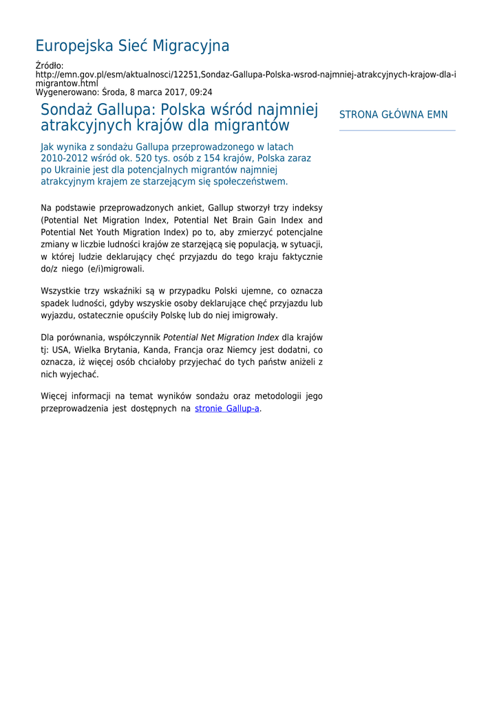 Europejska Sieć Migracyjna Źródło: http://emn.gov.pl/esm/aktualnosci/12251,Sondaz-Gallupa-Polska-wsrod-najmniej-atrakcyjnych-krajow-dla-i migrantow.html Wygenerowano: Środa, 8 marca 2017, 09:24 Sondaż Gallupa: Polska wśród najmniej atrakcyjnych krajów dla migrantów Jak wynika z sondażu Gallupa przeprowadzonego w latach 2010-2012 wśród ok. 520 tys. osób z 154 krajów, Polska zaraz po Ukrainie jest dla potencjalnych migrantów najmniej atrakcyjnym krajem ze starzejącym się społeczeństwem. Na podstawie przeprowadzonych ankiet, Gallup stworzył trzy indeksy (Potential Net Migration Index, Potential Net Brain Gain Index and Potential Net Youth Migration Index) po to, aby zmierzyć potencjalne zmiany w liczbie ludności krajów ze starzęjącą się populacją, w sytuacji, w której ludzie deklarujący chęć przyjazdu do tego kraju faktycznie do/z niego (e/i)migrowali. Wszystkie trzy wskaźniki są w przypadku Polski ujemne, co oznacza spadek ludności, gdyby wszyskie osoby deklarujące chęć przyjazdu lub wyjazdu, ostatecznie opuściły Polskę lub do niej imigrowały. Dla porównania, współczynnik Potential Net Migration Index dla krajów tj: USA, Wielka Brytania, Kanda, Francja oraz Niemcy jest dodatni, co oznacza, iż więcej osób chciałoby przyjechać do tych państw aniżeli z nich wyjechać. Więcej informacji na temat wyników sondażu oraz metodologii jego przeprowadzenia jest dostępnych na stronie Gallup-a. STRONA GŁÓWNA EMN