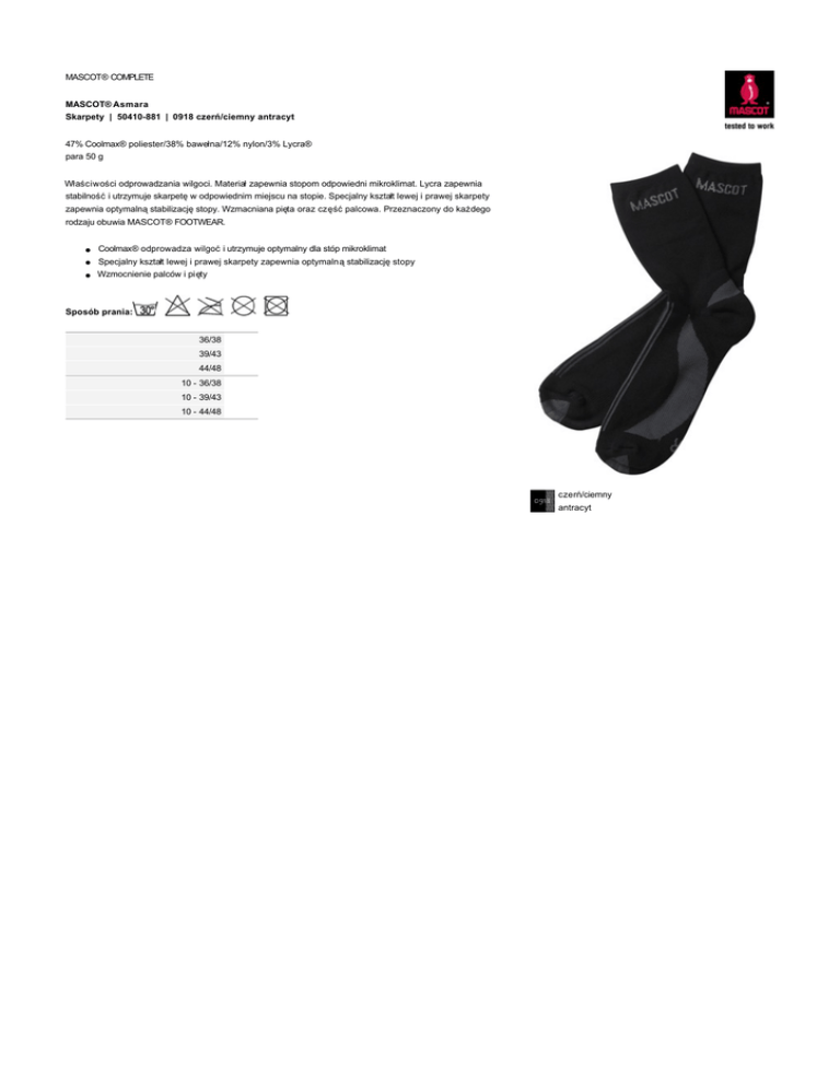 MASCOT® COMPLETE MASCOT® Asmara Skarpety | 50410-881 | 0918 czerń/ciemny antracyt 47% Coolmax® poliester/38% bawełna/12% nylon/3% Lycra® para 50 g Właściwości odprowadzania wilgoci. Materiał zapewnia stopom odpowiedni mikroklimat. Lycra zapewnia stabilność i utrzymuje skarpetę w odpowiednim miejscu na stopie. Specjalny kształt lewej i prawej skarpety zapewnia optymalną stabilizację stopy. Wzmacniana pięta oraz część palcowa. Przeznaczony do każdego rodzaju obuwia MASCOT® FOOTWEAR. l Coolmax® odprowadza wilgoć i utrzymuje optymalny dla stóp mikroklimat l Specjalny kształt lewej i prawej skarpety zapewnia optymalną stabilizację stopy l Wzmocnienie palców i pięty Sposób prania: 36/38 39/43 44/48 10 - 36/38 10 - 39/43 10 - 44/48 czerń/ciemny antracyt