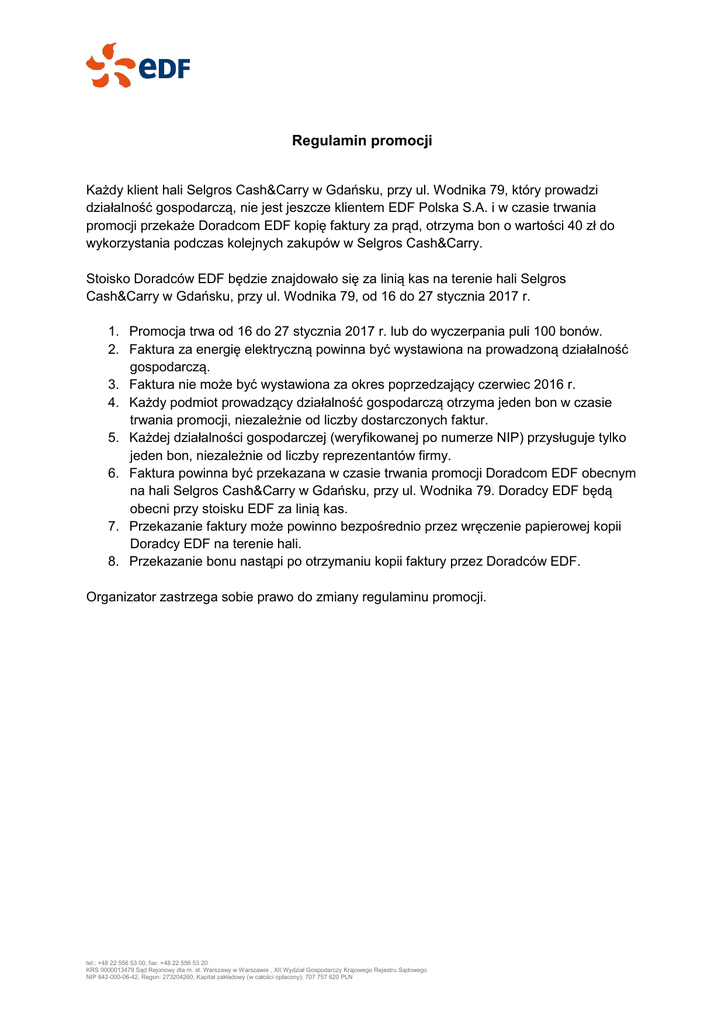 Regulamin promocji Każdy klient hali Selgros Cash&Carry w Gdańsku, przy ul. Wodnika 79, który prowadzi działalność gospodarczą, nie jest jeszcze klientem EDF Polska S.A. i w czasie trwania promocji przekaże Doradcom EDF kopię faktury za prąd, otrzyma bon o wartości 40 zł do wykorzystania podczas kolejnych zakupów w Selgros Cash&Carry. Stoisko Doradców EDF będzie znajdowało się za linią kas na terenie hali Selgros Cash&Carry w Gdańsku, przy ul. Wodnika 79, od 16 do 27 stycznia 2017 r. 1. Promocja trwa od 16 do 27 stycznia 2017 r. lub do wyczerpania puli 100 bonów. 2. Faktura za energię elektryczną powinna być wystawiona na prowadzoną działalność gospodarczą. 3. Faktura nie może być wystawiona za okres poprzedzający czerwiec 2016 r. 4. Każdy podmiot prowadzący działalność gospodarczą otrzyma jeden bon w czasie trwania promocji, niezależnie od liczby dostarczonych faktur. 5. Każdej działalności gospodarczej (weryfikowanej po numerze NIP) przysługuje tylko jeden bon, niezależnie od liczby reprezentantów firmy. 6. Faktura powinna być przekazana w czasie trwania promocji Doradcom EDF obecnym na hali Selgros Cash&Carry w Gdańsku, przy ul. Wodnika 79. Doradcy EDF będą obecni przy stoisku EDF za linią kas. 7. Przekazanie faktury może powinno bezpośrednio przez wręczenie papierowej kopii Doradcy EDF na terenie hali. 8. Przekazanie bonu nastąpi po otrzymaniu kopii faktury przez Doradców EDF. Organizator zastrzega sobie prawo do zmiany regulaminu promocji. tel.: +48 22 556 53 00, fax: +48 22 556 53 20 KRS 0000013479 Sąd Rejonowy dla m. st. Warszawy w Warszawie , XII Wydział Gospodarczy Krajowego Rejestru Sądowego NIP 642-000-06-42, Regon: 273204260, Kapitał zakładowy (w całości opłacony): 707 757 620 PLN