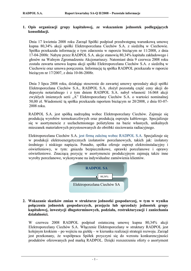 RADPOL S.A. Raport kwartalny SA-Q II/2008 – Pozostałe informacje 1. Opis organizacji grupy kapitałowej, ze wskazaniem jednostek podlegających konsolidacji. Dnia 17 kwietnia 2008 roku Zarząd Spółki podpisał przedwstępną warunkową umowę kupna 80,34% akcji spółki Elektroporcelana Ciechów S.A. z siedzibą w Ciechowie. Spółka przekazała informację o tym zdarzeniu w raporcie bieżącym nr 11/2008, z dnia 17-04-2008r. Nabyte przez RADPOL S.A. akcje stanowią 80,34% kapitału zakładowego i głosów na Walnym Zgromadzeniu Akcjonariuszy. Natomiast dnia 9 czerwca 2008 roku została zawarta umowa kupna akcji spółki Elektroporcelana Ciechów S.A. z siedzibą w Ciechowie oraz umowa poręczenia. Informację tą spółka RADPOL przekazała w raporcie bieżącym nr 17/2007, z dnia 10-06-2008r. Dnia 3 lipca 2008 roku, działając stosownie do zawartej umowy sprzedaży akcji spółki Elektroporcelana Ciechów S.A., RADPOL S.A. złożył pozostałą część ceny akcji do depozytu notarialnego i z tym dniem RADPOL S.A. nabył własność 16.068 akcji zwykłych imiennych serii „A” Elektroporcelany Ciechów S.A. o wartości nominalnej 50,00 zł. Wiadomość tą spółka przekazała raportem bieżącym nr 20/2008, z dnia 03-072008 roku. RADPOL S.A. jest spółką nadrzędną wobec Elektroporcelany Ciechów. Zajmuje się produkcją wyrobów termokurczliwych oraz produkcją osprzętu kablowego. Specjalizuje się w asortymencie z uszlachetnionego polietylenu na bazie własnych, unikalnych mieszanek materiałowych przystosowanych do obróbki sieciowania radiacyjnego. Elektroporcelana Ciechów S.A. jest firmą zależną wobec RADPOL S.A. Specjalizuje się w produkcji elektroenergetycznych izolatorów porcelanowych, takich jak: izolatory średniego i niskiego napięcia. Ponadto, spółka oferuje osprzęt elektroinstalacyjny i oświetleniowy, w tym: gniazda bezpiecznikowe, oprawki porcelanowe i oprawy oświetleniowe. Znaczącą pozycję w asortymencie produkcyjnym zajmują także inne wyroby porcelanowe, wykonywane na indywidualne zamówienia klientów. RADPOL SA 80,34% Elektroporcelana Ciechów SA 2. Wskazanie skutków zmian w strukturze jednostki gospodarczej, w tym w wyniku połączenia jednostek gospodarczych, przejęcia lub sprzedaży jednostek grupy kapitałowej, inwestycji długoterminowych, podziału, restrukturyzacji i zaniechania działalności. W czerwcu 2008 RADPOL podpisał ostateczną umowę kupna 80,34% akcji Elektroporcelany Ciechów S.A. Włączenie Elektroporcelany w struktury RADPOL jest kolejnym krokiem – po wejściu na giełdę – w kierunku realizacji strategii rozwoju. Zarząd jest przekonany, że współpraca Spółek przyczyni się do wzrostu konkurencyjności produktów oferowanych pod marką RADPOL. Dzięki rozszerzeniu oferty o asortyment -1- Raport kwartalny SA-Q II/2008 – Pozostałe informacje RADPOL S.A. Elektroporcelany RADPOL będzie dostarczał klientom szerszą gamę produktów oraz zwiększy swój udział w rynku elektroenergetycznym. 3. Stanowisko Zarządu odnośnie do możliwości zrealizowania wcześniej publikowanych prognoz wyników na dany rok, w świetle wyników zaprezentowanych w raporcie kwartalnym w stosunku do wyników prognozowanych. Emitent nie publikował prognoz wyników na 2008r. 4. Wskazanie akcjonariuszy posiadających bezpośrednio lub pośrednio przez podmioty zależne co najmniej 5 % ogólnej liczby głosów na walnym zgromadzeniu emitenta na dzień przekazania raportu kwartalnego wraz ze wskazaniem liczby posiadanych przez te podmioty akcji, ich procentowego udziału w kapitale zakładowym, liczby głosów z nich wynikających i ich procentowego udziału w ogólnej liczbie głosów na walnym zgromadzeniu oraz wskazanie zmian w strukturze własności znacznych pakietów akcji emitenta w okresie od przekazania poprzedniego raportu kwartalnego. Na dzień przekazania raportu kwartalnego, zgodnie z posiadanymi przez Spółkę informacjami następujący akcjonariusze posiadają co najmniej 5% ogólnej liczby głosów na Walnym Zgromadzeniu Akcjonariuszy: % głosów na WZA oraz % udział w kapitale zakładowym stan na dzień przekazania raportu za I kwart. 2008 Imię i nazwisko (nazwa) ilość akcji zwykłych na dzień przekazania raportu za I kwart. 2008 TAR HEEL CAPITAL R LLC 5 401 485 22,55 - - 5 401 485 5 401 485 22,55 Grzegorz J. Bielowicki 3 031 572 12,66 - - 3 031 572 3 031 572 12,66 Marcin Wysocki 3 031 572 12,66 - - 3 031 572 3 031 572 12,66 ING NationaleNederlanden OFE 1 814 854 7,58 - - 1 814 854 1 814 854 7,58 Commercial Union IM (Polska) 1 410 000 5,89 - - 1 410 000 1 410 000 5,89 BZ WBK AIB AM, w tym BZ WBK AIB TFI 1 315 000 5,49 - - 1 315 000 1 315 000 5,49 liczba akcji nabytych do terminu przekazania raportu liczba akcji zbytych do terminu przekazania raportu ilość akcji zwykłych na dzień przekazania raportu za II kwart. 2008 ilość głosów na dzień przekazania raportu za II kwart. 2008 % głosów na WZA oraz % udział w kapitale zakładowym stan na dzień przekazania raportu za II kwart. 2008 Wszystkie wyemitowane akcje przez RADPOL S.A. są akcjami zwykłymi na okaziciela. Pan Grzegorz J. Bielowicki na mocy udzielonych pełnomocnictw przez TAR HEEL CAPITAL R LLC i Pana Gabriela Wróblewskiego oraz nabyciu akcji RADPOL S.A. przez podmiot przez niego kontrolowany („TAR HEEL CAPITAL Spółka z ograniczoną odpowiedzialnością” Spółka komandytowa z siedzibą w Warszawie) ma prawo do głosu z akcji przysługujących tym osobom, co daje razem: -2- RADPOL S.A. Raport kwartalny SA-Q II/2008 – Pozostałe informacje Liczba akcji Liczba głosów Udział w kapitale zakładowym Udział w ogólnej liczbie głosów 8.673.989 8.673.989 36,21% 36,21% 5. Zestawienie zmian w stanie posiadania akcji emitenta lub uprawnień do nich (opcji) przez osoby zarządzające i nadzorujące emitenta, zgodnie z posiadanymi przez emitenta informacjami, w okresie od przekazania poprzedniego raportu kwartalnego. Zarząd Imię i nazwisk