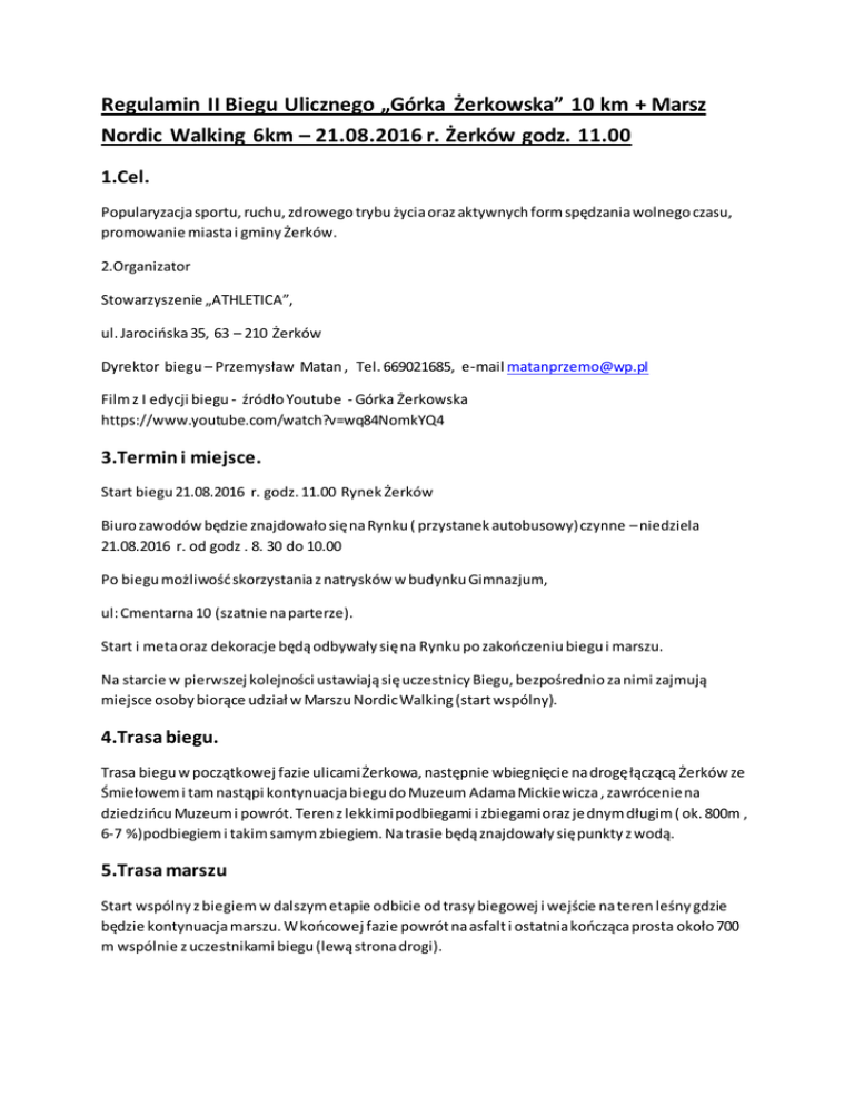 Regulamin II Biegu Ulicznego „Górka Żerkowska” 10 km + Marsz Nordic Walking 6km – 21.08.2016 r. Żerków godz. 11.00 1.Cel. Popularyzacja sportu, ruchu, zdrowego trybu życia oraz aktywnych form spędzania wolnego czasu, promowanie miasta i gminy Żerków. 2.Organizator Stowarzyszenie „ATHLETICA”, ul. Jarocioska 35, 63 – 210 Żerków Dyrektor biegu – Przemysław Matan , Tel. 669021685, e-mail [email protected] Film z I edycji biegu - źródło Youtube - Górka Żerkowska https://www.youtube.com/watch?v=wq84NomkYQ4 3.Termin i miejsce. Start biegu 21.08.2016 r. godz. 11.00 Rynek Żerków Biuro zawodów będzie znajdowało się na Rynku ( przystanek autobusowy) czynne – niedziela 21.08.2016 r. od godz . 8. 30 do 10.00 Po biegu możliwośd skorzystania z natrysków w budynku Gimnazjum, ul: Cmentarna 10 (szatnie na parterze). Start i meta oraz dekoracje będą odbywały się na Rynku po zakooczeniu biegu i marszu. Na starcie w pierwszej kolejności ustawiają się uczestnicy Biegu, bezpośrednio za nimi zajmują miejsce osoby biorące udział w Marszu Nordic Walking (start wspólny). 4.Trasa biegu. Trasa biegu w początkowej fazie ulicami Żerkowa, następnie wbiegnięcie na drogę łączącą Żerków ze Śmiełowem i tam nastąpi kontynuacja biegu do Muzeum Adama Mickiewicza , zawrócenie na dziedziocu Muzeum i powrót. Teren z lekkimi podbiegami i zbiegami oraz je dnym długim ( ok. 800m , 6-7 %)podbiegiem i takim samym zbiegiem. Na trasie będą znajdowały się punkty z wodą. 5.Trasa marszu Start wspólny z biegiem w dalszym etapie odbicie od trasy biegowej i wejście na teren leśny gdzie będzie kontynuacja marszu. W koocowej fazie powrót na asfalt i ostatnia koocząca prosta około 700 m wspólnie z uczestnikami biegu (lewą strona drogi). 6.Klasyfikacja i nagrody Dla Biegu: Kobiety – open, nagradzane 3 (Nagroda pieniężna + puchar ), K 16 (16-19) – nagradzana 1 (puchar), K 20 (20– 29) – nagradzana 1 ( puchar), K 30 (30 - 39) – nagradzana 1 (puchar), K 40 ( 40 – 49) – nagradzana 1 ( puchar), K 50 ( 50 – 59) – nagradzana 1 (puchar), K 60 + ( 60 i więcej) – nagradzana 1 ( puchar ). Ponad to Puchar dla najlepszej zawodniczki Gminy Żerków. Mężczyźni – open, nagradzani 3 (Nagroda pieniężna + puchar ), M 16 (16 – 19) – nagradzany 1 (puchar), M 20 (20 – 29) – nagradzany 1 (puchar), M 30 ( 30 – 39 ) – nagradzany 1 ( puchar), M 40 ( 40 – 49 ) – nagradzany 1 ( puchar ), M 50 ( 50 – 59 ) – nagradzany 1 ( puchar ), M 60 + ( 60 i więcej )- nagradzany 1 ( puchar ). Puchar dla najlepszego zawodnika Gminy Żerków. Dla Marszu NW : w kat. Open dla najlepszej zawodniczki oraz zawodnika przewidziany puchar oraz Nagroda rzeczowa , również dla najlepszej zawodniczki i zawodnika Gminy Żerków przewidziany puchar oraz nagroda rzeczowa. Zwycięzcy kategorii puchar bądź statuetka. Organizator bierze pod uwagę dodatkowe nagrody pieniężne bądź rzeczowe dla zwycięzców poszczególnych kategorii wiekowych (uzależnione od budżetu). 7.Pomiar czasu – firma Time4run Pomiar czasu i ustalenie miejsc nastąpi drogą elektroniczną za pomocą chipów. Chipy oraz numery startowe bezzwrotne. Posiadanie numeru startowego i chipa jest warunkiem wystartowania w biegu oraz marszu i sklasyfikowania w komunikacie koocowym. 8.Świadczenia dla zawodników. 1. Dla każdego uczestnika biegu i marszu przewidziany pamiątkowy odlewany okolicznościowy medal. 2. Dla zawodników , którzy dokonają rejestracji drogą elektroniczną oraz ui szczą opłatę startową do dnia 15.08.2016 r. ( godz. 23.59) przewidziany pakiet startowy ( woda, baton, bezzwrotny numer i chip oraz pamiątkowa koszulka uczestnictwa –wysoka jakośd, trwały nadruk). 3. Każdy zawodnik po ukooczeniu biegu lub marszu otrzyma sms na wcześniej podany nr. z uzyskanym czasem i miejscem . 4. Łączna liczba uczestników biegu ograniczona jest do 150, marszu do 50. 9.Zgłoszenia do biegu oraz marszu. Zgłoszeo można dokonywad: - Bezpośrednio na stronie: time4run.com.pl do dnia 15.08.2016 r. (23.59) - warunkiem uczestnictwa w biegu i marszu będzie dokonanie rejestracji , uiszczenie opłaty startowej drogą elektroniczną oraz wypełnienie deklaracji uczestnictwa podczas odbioru pakietów startowych w dniu biegu co będzie jednoznaczne z akceptacją Regulaminu Biegu i Marszu. - dzieo zawodów od godz. 8.30 – 10.00 zapisy osobiście w biurze zawodów w ramach wolnych miejsc, wpisanie na listę startową po uiszczeniu opłaty . - dla uczestników biegu oraz marszu przewidziany ciepły posiłek oraz kawa i herbata + coś słodkiego 10.Opłata startowa. 1. Opłata startowa wynosi: - 30 zł – dla wszystkich, którzy dokonują zgłoszenia i wpłaty do 31.05.2016 r. - 40 zł – dla wszystkich którzy dokonają zgłoszenia wpłaty od 31.05 - 15.07.2016 r. - 50 zł – dla wszystkich którzy dokonują zgłoszenia i wpłaty od 15.07 - 15.08.2016 r. - 20 zł dla wszystkich mieszkaoców Gminy Żerków. - 40 zł – dla osób, które dokonują zgłoszenia w dniu przeprowadzenia biegu tj . 21.08.2016 r. w ramach wolnych miejsc. 2. Opłatę startową należy wpłacad elektronicznie przy zapisach na stronie: time4run.com.pl 3. Weryfikacja zawodników odbywad się będzie w biurze zawodów w dniu 21.08.2016 r. od godz. 8.30 do 10.00 4. Wpłacona opłata startowa nie podlega zwrotowi. 5. Koszty organizacyjne ponosi organizator natomiast koszty osobowe ponoszą uczestnicy. 11.Warunki uczestnictwa. 1. Do weryfikacji każdy zawodnik ma obowiązek zgłosid się osobiście. 2. Do startu dopuszczone zostaną osoby mające ukooczone 16 lat i będą zweryfikowane w biurze zawodów, ponadto osoby te zobowiązane są na przedłożenie zgody od rodzica bądź prawnego opiekuna na udział w biegu lub marszu.( zgoda do pobrania wraz z zapisami elektronicznymi). 3. Każdy uczestnik startuje na własną odpowiedzialnośd co potwierdza podpisaniem oświadczenia o zdolności do udziału w biegu. 4. Każdy uczes
