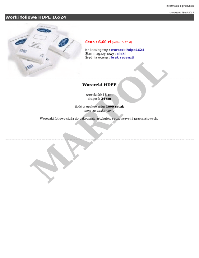 Informacje o produkcie Utworzono 08-03-2017 Worki foliowe HDPE 16x24 Cena : 6,60 zł (netto: 5,37 zł) PO L Nr katalogowy : woreczkihdpe1624 Stan magazynowy : niski Średnia ocena : brak recenzji Woreczki HDPE szerokość: 16 cm długość: 24 cm ilość w opakowaniu: 1000 sztuk cena za opakowanie M AR Woreczki foliowe służą do pakowania artykułów spożywczych i przemysłowych.
