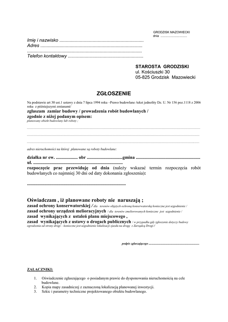 Imię i nazwisko .................................................................. Adres ................................................................................ .......................................................................................... Telefon kontaktowy ........................................................... GRODZISK MAZOWIECKI dnia ............................... STAROSTA GRODZISKI ul. Kościuszki 30 05-825 Grodzisk Mazowiecki ZGŁOSZENIE Na podstawie art 30 ust.1 ustawy z dnia 7 lipca 1994 roku –Prawo budowlane /tekst jednolity Dz. U. Nr 156 poz.1118 z 2006 roku z późniejszymi zmianami/ zgłaszam zamiar budowy / prowadzenia robót budowlanych / zgodnie z niżej podanym opisem: planowany obiekt budowlany lub roboty ; .................................................................................................................................................................................................................................. ................................................................................................................................................................................................................................. ................................................................................................................................................................................................................................. adres nieruchomości na której planowane są roboty budowlane: działka nr ew. ................... obr ...............................gmina ........................................................ ul. .............................................................................. rozpoczęcie prac przewiduję od dnia (należy wskazać termin rozpoczęcia robót budowlanych co najmniej 30 dni od daty dokonania zgłoszenia): ...................................................................................... Oświadczam , iż planowane roboty nie naruszają ; zasad ochrony konserwatorskiej / dla terenów objętych ochroną konserwatorską konieczne jest uzgodnienie / zasad ochrony urządzeń melioracyjnych / dla terenów zmeliorowanych konieczne jest uzgodnienie / zasad wynikających z ustaleń planu miejscowego , zasad wynikających z ustawy o drogach publicznych / w przypadku gdy zgłoszenie dotyczy budowy ogrodzenia od strony drogi – konieczne jest uzgodnienie lokalizacji zjazdu na drogę z Zarządcą Drogi / podpis zgłaszającego .................................................................. ZAŁĄCZNIKI: 1. 2. 3. Oświadczenie zgłaszającego o posiadanym prawie do dysponowania nieruchomością na cele budowlane. Kopia mapy zasadniczej z zaznaczoną lokalizacją planowanej inwestycji. Szkic i parametry techniczne projektowanego obiektu budowlanego.