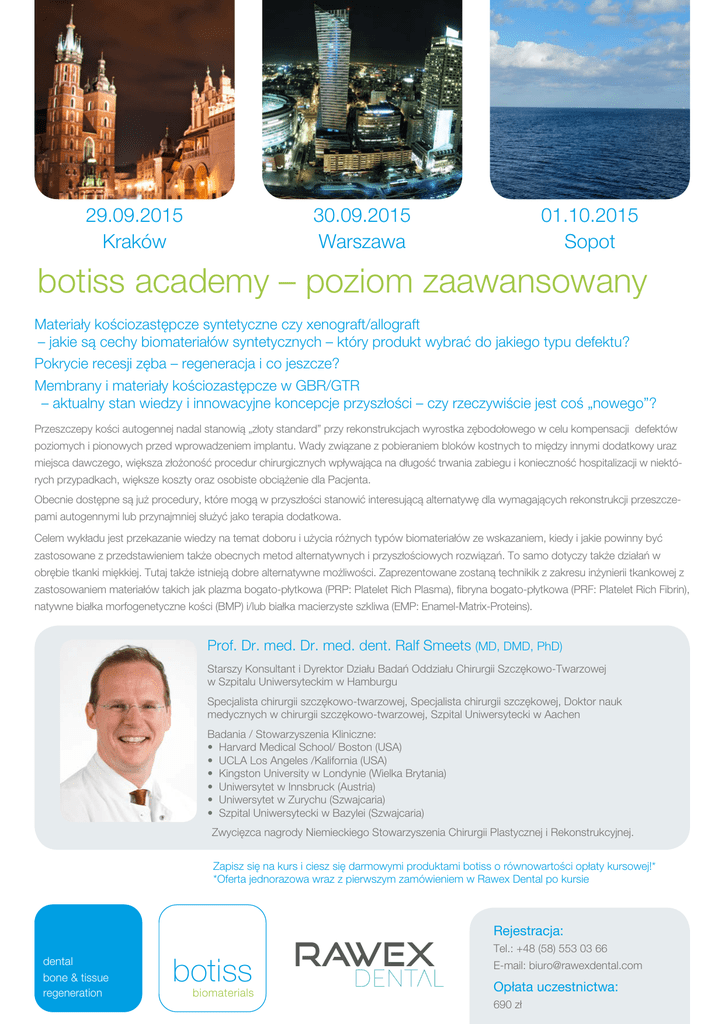 29.09.2015 Kraków 30.09.2015 Warszawa 01.10.2015 Sopot botiss academy – poziom zaawansowany Materiały kościozastępcze syntetyczne czy xenograft/allograft – jakie są cechy biomateriałów syntetycznych – który produkt wybrać do jakiego typu defektu? Pokrycie recesji zęba – regeneracja i co jeszcze? Membrany i materiały kościozastępcze w GBR/GTR – aktualny stan wiedzy i innowacyjne koncepcje przyszłości – czy rzeczywiście jest coś „nowego”? Przeszczepy kości autogennej nadal stanowią „złoty standard” przy rekonstrukcjach wyrostka zębodołowego w celu kompensacji defektów poziomych i pionowych przed wprowadzeniem implantu. Wady związane z pobieraniem bloków kostnych to między innymi dodatkowy uraz miejsca dawczego, większa złożoność procedur chirurgicznych wpływająca na długość trwania zabiegu i konieczność hospitalizacji w niektórych przypadkach, większe koszty oraz osobiste obciążenie dla Pacjenta. Obecnie dostępne są już procedury, które mogą w przyszłości stanowić interesującą alternatywę dla wymagających rekonstrukcji przeszczepami autogennymi lub przynajmniej służyć jako terapia dodatkowa. Celem wykładu jest przekazanie wiedzy na temat doboru i użycia różnych typów biomateriałów ze wskazaniem, kiedy i jakie powinny być zastosowane z przedstawieniem także obecnych metod alternatywnych i przyszłościowych rozwiązań. To samo dotyczy także działań w obrębie tkanki miękkiej. Tutaj także istnieją dobre alternatywne możliwości. Zaprezentowane zostaną technikik z zakresu inżynierii tkankowej z zastosowaniem materiałów takich jak plazma bogato-płytkowa (PRP: Platelet Rich Plasma), fibryna bogato-płytkowa (PRF: Platelet Rich Fibrin), natywne białka morfogenetyczne kości (BMP) i/lub białka macierzyste szkliwa (EMP: Enamel-Matrix-Proteins). Prof. Dr. med. Dr. med. dent. Ralf Smeets (MD, DMD, PhD) Starszy Konsultant i Dyrektor Działu Badań Oddziału Chirurgii Szczękowo-Twarzowej w Szpitalu Uniwersyteckim w Hamburgu Specjalista chirurgii szczękowo-twarzowej, Specjalista chirurgii szczękowej, Doktor nauk medycznych w chirurgii szczękowo-twarzowej, Szpital Uniwersytecki w Aachen Badania / Stowarzyszenia Kliniczne: • Harvard Medical School/ Boston (USA) • UCLA Los Angeles /Kalifornia (USA) • Kingston University w Londynie (Wielka Brytania) • Uniwersytet w Innsbruck (Austria) • Uniwersytet w Zurychu (Szwajcaria) • Szpital Uniwersytecki w Bazylei (Szwajcaria) Zwycięzca nagrody Niemieckiego Stowarzyszenia Chirurgii Plastycznej i Rekonstrukcyjnej. Zapisz się na kurs i ciesz się darmowymi produktami botiss o równowartości opłaty kursowej!* *Oferta jednorazowa wraz z pierwszym zamówieniem w Rawex Dental po kursie dental bone & tissue regeneration botiss biomaterials RAWEX Rejestracja: Tel.: +48 (58) 553 03 66 E-mail: [email protected] Opłata uczestnictwa: 690 zł