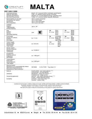 MALTA DOP 1020/113268 Fabrikatiemethode Mode de fabrication Herstellungsverfahren Manufacturing process Getuft, 1/2’’ luxueuse berber lussenpool, gevold garen Tufté, 1/2’’ berbère luxueux bouclé, fils feutré Getuftet,1/2’’ luxuriöse Berberschlinge, gewalktes Garn Tufted, 1/2’’ luxurious berber loop pile, felted yarn Samenstelling van de pool Composition du velours Nutzschicht Pile composition 100 % zuivere scheerwol 100 % laine vierge 100 % reine Schurwolle 100 % pure new wool Tuftdoek Support Trägergewebe Primary backing 100 % PP Rug Dossier Rücken Secondary backing 28 Jute Poolhoogte Hauteur du velours Polhöhe Pile height Zand 35 4 + 5 m Sable 4+5m Sand Sand Lichtbeige 4 + 5 m Beige clair Hellbeige Light beige 36 ca. 11 mm Totale hoogte Hauteur totale Gesamthöhe Total height ca. 13,5 mm Aantal noppen Nombre de points Noppenzahl Tuft density ca. 13 000/m² Poolgewicht Poids du velours Polgewicht Pile weight ca. 1 900 g/m² Totaal gewicht Poids total Gesamtgewicht Total weight ca. 3 220 g/m² Warmte isolatie Résistance à la conductibilité de chaleur Wärmedurchlasswiderstand Resistance of heat conduction ISO 8302 Gebruik 191 4+5m 0,12 m² K/W 38 4+5m Beige Beige Beige Beige Wit Blanc Weiß White Noot Noix Nuss Nut Tog rating 1.2 Huishoudelijk : zeer zwaar gebruik ***** Contractueel : normaal gebruik Résidentiel : usage très intensif ***** Professionnel : usage normal Wohnen : sehr starke Beanspruchung ***** Projekt : mittlere Beanspruchung Domestic : extra heavy duty ***** Contract : medium duty Utilisation Verwendungsbereich Suitability Leverbaar als rol en als coupon / Livrable en rouleaux et à la coupe / als Rolle und im Coupon lieferbar / available in rolls and cutlengths Bij verlijming : enkel gebruik van EC1-lijmen ! / En cas de pose collée : seulement utilisation des colles EC1 ! Bei geklebter Verlegung : nur EC1-Klebstoffe verwenden ! / In case of adhesion : only use of EC1 glues ! We reserve the right to modify the characteristics of this product for quality improvement. Industrielaan 16 8520 Kuurne België Tel. 32-56 / 35 44 44 Fax 32-56 / 35 41 30