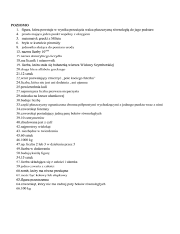 POZIOMO 1. figura, która powstaje w wyniku przecięcia walca płaszczyzną równoległą do jego podstaw 4. prosta mająca jeden punkt wspólny z okręgiem 5. matematyk grecki z Miletu 6. bryła w kształcie piramidy 8. jednostka służąca do pomiaru urody 13. nazwa liczby 10100 15.nazwa starożytnego liczydła 18.ma licznik i mianownik 19. liczba, która stała się bohaterką wiersza Wisławy Szymborskiej 20.druga litera alfabetu greckiego 21.12 sztuk 22,wzór pozwalający zmierzyć „pole kociego futerka” 24.liczba, która nie jest ani dodatnia , ani ujemna 25.powierzchnia kuli 27.najmniejsza liczba pierwsza nieparzysta 29.mieszka na kresce ułamkowej 30.buduje liczbę 33.część płaszczyzny ograniczona dwoma półprostymi wychodzącymi z jednego punktu wraz z nimi 34.czworokąt foremny 36.czworokąt posiadający jedną parę boków równoległych 39.10 centymetrów 40.zbudowana jest z cyfr 42.najprostrzy wielokąt 43. niezbędne w twierdzeniu 45.60 sztuk 46.1000 kg 47.np. liczba 2 lub 3 w dzieleniu przez 5 49.liczba w dodawaniu 50.budują każdą figurę 54.15 sztuk 57.liczba składająca się z całości i ułamka 59.jedna czwarta z całości 60.romb, który ma równe przekątne 61.może być kołowy lub słupkowy 63.figura przestrzenna 64.czworokąt, który nie ma żadnej pary boków równoległych 66.100 kg PIONOWO 2. styczna lub sieczna 3. ma cztery ściany, które są trójkątami 7. dekagon, wielobok, którego suma kątów wewnętrznych wynosi 1440 stopni 8. liczba będąca symbolem nieskończoności i wieczności 10. grecka bogini pamięci 11. matematyczny geniusz z Sankt Petersburga 12. średniowieczna miara oznaczająca mgnienie oka 14. zaprzeczenie poziomu 16.masa opakowania 17.parzysta liczba pierwsza 22.połowa kuli 23.druga część twierdzenia 25.bryła obrotowa 26.netto+tara 28.część okręgu wyznaczona przez dwa punkty 31.wynik dzielenia 32.1000 ml 35.wynik dodawania 37.najdłużssza cięciwa 38.zadanie szaradziarskie w formie zagadki rysunkowej 41.pionowa oś układu współrzędnych 44.zdanie, które w matematyce czeka na udowodnienie 45.1000 gram 48.przepis na wykonanie np. dzielenia 50.jedna dziesiąta procenta 51.prosta mająca dwa punkty wspólne z okręgiem 52.odcinek łączący środek okręgu z punktem okręgu 53.część prostej ograniczona przez dwa punkty 55.grecka bogini sprawiedliwości z wagą i mieczem oraz opaską na oczach 56.część płaszczyzny ograniczona łamaną zwyczajną zamkniętą 58.ułamek, którego licznik jest mniejszy od mianownika 61.jedna z figur obrotowych 62.wielokąt, który ma wszystkie boki tej samej długości i kąty tej samej miary 65.100 m2 67.100 lat 16 31 44 52 56 9 6 49 3 16 2 52 3 24 62 8 45 10 61 4 54 67 1 43 68 32 7 21 12 12 4 61 24 13 40 26 32 44 7 55 42 18 67 20 25 19 13 64 63 19 26 56 47 9 37 5 10 14 11 8 31 27 11 37 70 36 3 35 59 21 17 66 29 39 22 50 15 23 57 41 43 40 58 60 48 6 29 63 47 34 41 17 28 22 38 2 55 58 49 53 28 54 69 51 23 50 46 57 46 15 64 34 38 35 65 20 30 54 33 51 25 65 33 5 60 1 62 39 18 48 59 42 66 14 Hasło: 1 2 3 4 5 6 19 20 21 22 7 8 9 10 11 12 23 24 25 26 27 28 29 30 31 32 33 34 35 36 37 38 39 J J 40 41 42 43 44 45 46 47 48 Ę 58 59 60 61 62 63 64 65 13 14 15 16 17 18 49 50 51 52 66 67 68 69 70 53 54 55 56 57
