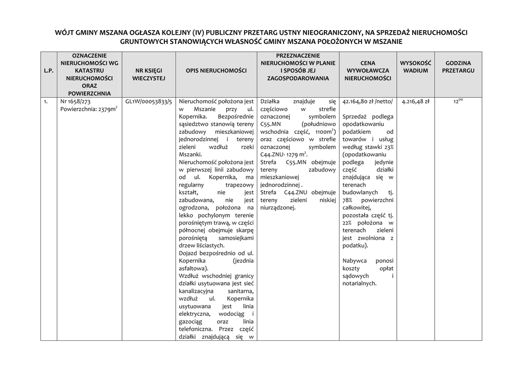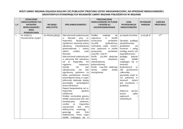 WÓJT GMINY MSZANA OGŁASZA KOLEJNY (IV) PUBLICZNY PRZETARG USTNY NIEOGRANICZONY, NA SPRZEDAŻ NIERUCHOMOŚCI GRUNTOWYCH STANOWIĄCYCH WŁASNOŚĆ GMINY MSZANA POŁOŻONYCH W MSZANIE L.P. 1. OZNACZENIE NIERUCHOMOŚCI WG KATASTRU NIERUCHOMOŚCI ORAZ POWIERZCHNIA Nr 1658/273 Powierzchnia: 2379m2 NR KSIĘGI WIECZYSTEJ OPIS NIERUCHOMOŚCI GL1W/00053833/5 Nieruchomość położona jest w Mszanie przy ul. Kopernika. Bezpośrednie sąsiedztwo stanowią tereny zabudowy mieszkaniowej jednorodzinnej i tereny zieleni wzdłuż rzeki Mszanki. Nieruchomość położona jest w pierwszej linii zabudowy od ul. Kopernika, ma regularny trapezowy kształt, nie jest zabudowana, nie jest ogrodzona, położona na lekko pochylonym terenie porośniętym trawą, w części północnej obejmuje skarpę porośniętą samosiejkami drzew liściastych. Dojazd bezpośrednio od ul. Kopernika (jezdnia asfaltowa). Wzdłuż wschodniej granicy działki usytuowana jest sieć kanalizacyjna sanitarna, wzdłuż ul. Kopernika usytuowana jest linia elektryczna, wodociąg i gazociąg oraz linia telefoniczna. Przez część działki znajdującą się w PRZEZNACZENIE NIERUCHOMOŚCI W PLANIE I SPOSÓB JEJ ZAGOSPODAROWANIA Działka znajduje się częściowo w strefie oznaczonej symbolem C55.MN (południowo wschodnia część, 1100m2) oraz częściowo w strefie oznaczonej symbolem C44.ZNU- 1279 m2. Strefa C55.MN obejmuje tereny zabudowy mieszkaniowej jednorodzinnej . Strefa C44.ZNU obejmuje tereny zieleni niskiej niurządzonej. CENA WYWOŁAWCZA NIERUCHOMOŚCI WYSOKOŚĆ WADIUM GODZINA PRZETARGU 42.164,80 zł /netto/ 4.216,48 zł 1200 Sprzedaż podlega opodatkowaniu podatkiem od towarów i usług według stawki 23% (opodatkowaniu podlega jedynie część działki znajdująca się w terenach budowlanych tj. 78% powierzchni całkowitej, pozostała część tj. 22% położona w terenach zieleni jest zwolniona z podatku). Nabywca ponosi koszty opłat sądowych i notarialnych. 2. Nr 1667/286 Powierzchnia: 1971m2 GL1W/00053833/5 terenach zieleni przechodzi linia średniego napięcia 20 kV. Nieruchomość położona jest w Mszanie przy łączniku pomiędzy ul. Kopernika i ul. Mickiewicza. Bezpośrednie sąsiedztwo stanowią tereny luźnej zabudowy mieszkaniowej jednorodzinnej i tereny rolne. Działka ma regularny prostokątny kształt, nie jest zabudowana, nie jest ogrodzona, położona na pochyłym terenie, porośniętym samosiejkami drzew liściastych, w części północno-zachodniej obejmuje skarpę. Dojazd drogą utwardzoną od ul. Kopernika lub ul. Mickiewicza (nawierzchnia utwardzona kamieniem). Wzdłuż wschodniej granicy działki usytuowana jest sieć kanalizacyjna sanitarna, najbliższa linia elektryczna (słup wysokiego napięcia) i wodociąg (wPE32) usytuowane są w odległości ok. 70m. Przetargi odbędą się w dniu 12 sierpnia 2013 r. w niniejszym ogłoszeniu. Przetargi przeprowadza się na każdą działkę oddzielnie. Działka znajduje się w strefie C62.MN. Strefa C62.MN. obejmuje tereny zabudowy mieszkaniowej jednorodzinnej . 40.320,00 /netto/ zł 4.032,00 zł 1300 Sprzedaż podlega opodatkowaniu podatkiem od towarów i usług według stawki 23%. Nabywca ponosi koszty opłat sądowych i notarialnych. w sali posiedzeń Urzędu Gminy w Mszanie przy ul. 1 Maja 81 w godzinach podanych Dla w/w nieruchomości został przeprowadzony I przetarg ustny nieograniczony zakończony wynikiem negatywnym w dniu 23 kwietnia 2012 r, II przetarg ustny nieograniczony zakończony wynikiem negatywnym w dniu 8 października 2012 r . oraz III przetarg ustny nieograniczony zakończony wynikiem negatywnym w dniu 05.03.2013 r. Przeznaczone do sprzedaży nieruchomości stanowią własność Gminy Mszana i nie są obciążone ograniczonymi prawami rzeczowymi, ani też nie ma przeszkód prawnych w rozporządzaniu nimi. 1. Warunkiem udziału w przetargach jest okazanie komisji przetargowej przed otwarciem przetargów: - dowodu wniesienia wadium - w przypadku osób fizycznych dowodu tożsamości - w przypadku osób prawnych i jednostek organizacyjnych nieposiadających osobowości prawnej, a podlegającym wpisom do rejestrów – aktualnego wypisu z rejestru, właściwych pełnomocnictw, dowodów tożsamości osób reprezentujących podmiot. 2. W przypadku nabycia nieruchomości przez małżonków, do dokonywania czynności przetargowych konieczna jest obecność obojga małżonków lub jednego z nich, ze stosownym pełnomocnictwem drugiego małżonka, zawierającym zgodę na odpłatne nabycie nieruchomości. 3. Warunkiem przystąpienia do przetargu jest wniesienie wadium w pieniądzu w wysokości podanej w niniejszym ogłoszeniu na konto Urzędu Gminy Mszana: Bank Spółdzielczy w Jastrzębiu-Zdroju nr 88 8470 0001 2001 0029 0094 0006 najpóźniej w terminie do dnia 09.08.2013 r. włącznie z dopiskiem „wadium za działkę nr …….”. Za datę wpłacenia wadium uważa się wpływ wymaganej kwoty na rachunek Urzędu Gminy Mszana. 4. Wpłata jednego wadium uprawnia do udziału w przetargu na nieruchomość, którą oznaczono w tytule przelewu. W przypadku gdy dana osoba zamierza uczestniczyć w przetargu na więcej niż jedną nieruchomość obowiązuje wpłata wadium za każdą nieruchomość z osobna z zaznaczeniem w tytule przelewu jej numeru. 5. Wadium zwraca się niezwłocznie po odwołaniu bądź zamknięciu przetargów, jednak nie później niż przed upływem 3 dni od dnia odwołania, zamknięcia, unieważnienia przetargów lub zakończenia przetargów wynikiem negatywnym. 6. Wadium wniesione przez uczestnika przetargu, który przetarg wygrał zalicza się na poczet zapłaty ceny nabycia własności nieruchomości. 7. Postąpienie nie może wynosić mniej niż 1% ceny wywoławczej, z zaokrągleniem w górę do pełnych dziesiątek złotych, a o jego ostatecznej wysokości decydują uczestnicy przetargów. 8. Przetargi są ważne bez względu na liczbę uczestników, jeżeli przynajmniej jeden uczestnik zaoferował co najmniej jedno postąpienie