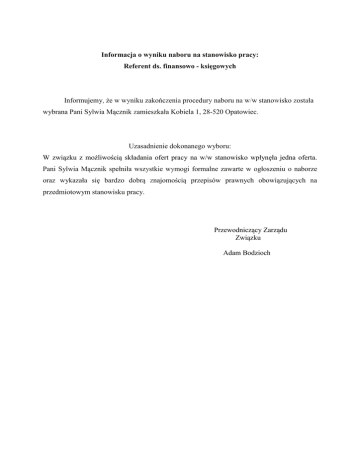 Informacja o wyniku naboru na stanowisko pracy: Referent ds. finansowo - księgowych Informujemy, że w wyniku zakończenia procedury naboru na w/w stanowisko została wybrana Pani Sylwia Mącznik zamieszkała Kobiela 1, 28-520 Opatowiec. Uzasadnienie dokonanego wyboru: W związku z możliwością składania ofert pracy na w/w stanowisko wpłynęła jedna oferta. Pani Sylwia Mącznik spełniła wszystkie wymogi formalne zawarte w ogłoszeniu o naborze oraz wykazała się bardzo dobrą znajomością przepisów prawnych obowiązujących na przedmiotowym stanowisku pracy. Przewodniczący Zarządu Związku Adam Bodzioch