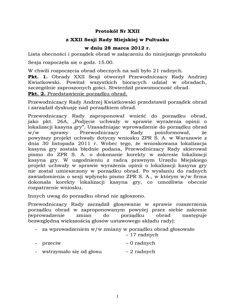 Protokół Nr XXII z XXII Sesji Rady Miejskiej w Pułtusku w dniu 28 marca 2012 r. Lista obecności i porządek obrad w załączeniu do niniejszego protokołu Sesja rozpoczęła się o godz. 15.00. W chwili rozpoczęcia obrad obecnych na sali było 21 radnych. Pkt. 1. Obrady XXII Sesji otworzył Przewodniczący Rady Andrzej Kwiatkowski. Powitał wszystkich biorących udział w obradach, szczególnie zaproszonych gości. Stwierdził prawomocność obrad. Pkt. 2. Przedstawienie porządku obrad. Przewodniczący Rady Andrzej Kwiatkowski przedstawił porządek obrad i zarządził dyskusję nad porządkiem obrad. Przewodniczący Rady zaproponował wnieść do porządku obrad, jako pkt. 26A, „Podjęcie uchwały w sprawie wyrażenia opinii o lokalizacji kasyna gry”. Uzasadniając wprowadzenie do porządku obrad w/w sprawy Przewodniczący Rady poinformował, że powyższy projekt uchwały dotyczy wniosku ZPR S. A. w Warszawie z dnia 30 listopada 2011 r. Wobec tego, że wnioskowana lokalizacja kasyna gry została błędnie podana, Przewodniczący Rady skierował pismo do ZPR S. A. o dokonanie korekty w zakresie lokalizacji kasyna gry. W uzgodnieniu z radcą prawnym Urzędu Miejskiego projekt uchwały w sprawie wyrażenia opinii o lokalizacji kasyna gry nie został umieszczony w porządku obrad. Po wysłaniu do radnych zawiadomienia o sesji wpłynęło pismo ZPR S. A., w którym w/w firma dokonała korekty lokalizacji kasyna gry, co umożliwia obecnie rozpatrzenie wniosku. Innych uwag do porządku obrad nie zgłoszono. Przewodniczący Rady zarządził głosowanie w sprawie rozszerzenia porządku obrad w zaproponowanym powyżej przez siebie zakresie (wprowadzenie zmian do porządku obrad następuje bezwzględną większością głosów ustawowego składu rady): - za wprowadzeniem w/w zmiany w porządku obrad głosowało – 17 radnych - przeciw – 0 radnych - wstrzymało się od głosu – 2 radnych 1 Pkt. 3. Interpelacje radnych. I. Radna Maria Korbal zgłosiła interpelację dotyczącą organizacji nowego roku szkolnego w przedszkolach prowadzonych przez Gminę Pułtusk i trybu rekrutacji dzieci do tych przedszkoli. Radna prosiła o wyjaśnienie powyższej sytuacji i podanie powodów podjęcia takiej decyzji przez Burmistrza Miasta. II. Radny Stanisław Skalik zgłosił następujące interpelacje: 1) Radny zapytał, czy są oszczędności w planowanych wydatkach na zimowe utrzymanie dróg gminnych ? Na co zostaną przeznaczone ewentualne oszczędności ? Radny prosił o udzielenie odpowiedzi pisemnej na powyższą interpelację. 2) W imieniu mieszkanki Popław radny poinformował, że odmawia się jej, jako osobie opiekującej się dzieckiem niepełnosprawnym, bezpłatnego przejazdu autobusem komunikacji miejskiej. Radny prosił o wyjaśnienie w powyższej sprawie. 3) Radny prosił, aby Burmistrz Miasta odniósł się do głosu mieszkańców wyrażonego na sesji Rady Miejskiej w dniu 31 stycznia 2012 r. przez p. Jana Sitka dotyczącego porządku w mieście i problemu bezpańskich psów. Radny poinformował, że popiera wypowiedź p. J. Sitka i stwierdził, że jest to ważny głos społeczeństwa. 4) Radny prosił Burmistrza o rozważenie możliwości wprowadzenia strefy płatnego parkowania, która objęłaby miejsca przeznaczone do postoju pojazdów zlokalizowane przy ul. Nowy Rynek naprzeciwko Dworca PKS. Obecnie w/w miejsca przeznaczone do postoju pojazdów są stale zajęte od rana do wieczora. Osoby przyjeżdżające do miasta nie mają gdzie zaparkować pojazdów na krótki czas. III. Radny Michał Kisiel w związku z natężeniem ruchu rowerzystów i pieszych na drodze wojewódzkiej Nr 618 w ul. Wyszkowskiej prosił Burmistrza o wystąpienie do zarządcy w/w drogi wojewódzkiej z wnioskiem o ustawienie znaku dotyczącego ograniczenia prędkości do 40 km/h na odcinku od zjazdu z mostu wyszkowskiego do ok. 200 m. za łukiem drogi w kierunku Wyszkowa. Uzasadniając powyższy wniosek radny poinformował, że pojazdy ciężarowe korzystające z w/w drogi jeżdżą z nadmierną prędkością; w ostatnim czasie miało miejsce zderzenie pojazdu ciężarowego z autobusem komunikacji miejskiej. Ustawienie znaku ograniczającego prędkość pojazdów do 40 km/h 2 uświadomiłoby kierowcom korzystającym z w/w drogi, iż nadal poruszają się na terenie zabudowanym, w granicach miasta. IV. Wiceprzewodnicząca Rady Róża Krasucka zgłosiła następujące interpelacje: 1) Kiedy na drogach na terenie miasta zostaną pomalowane przejścia dla pieszych ? Po sezonie zimowym oznakowanie to jest niewidoczne. Jednocześnie Wiceprzewodnicząca Rady prosiła o utworzenie i oznakowanie przejścia dla pieszych na drodze położonej przy Urzędzie Miejskim. 2) Wiceprzewodnicząca Rady prosiła o udzielenie odpowiedzi pisemnej na interpelację w sprawie: czy od momentu przejęcia od Powiatu Pułtuskiego mostów: benedyktyńskiego i świętojańskiego były wykonywane prace ? Jeżeli tak – to przez kogo i na jaką kwotę ? Następnie Wiceprzewodnicząca Rady zapytała, czy w br. w/w mosty będą odnawiane ? Obecnie wygląd w/w mostów szpeci miasto. V. Radny Tadeusz Ochtabiński zapytał, dlaczego ścieki z budynku położonego przy ul. Rynek 9 są odprowadzane do kanałku, a nie do kolektora kanalizacji sanitarnej ? Kiedy w/w budynek zostanie podłączony do kolektora kanalizacji sanitarnej w ul. Rynek ? Kto płacił kary za odprowadzanie w/w ścieków do kanałku ? Radny prosił o udzielenie odpowiedzi pisemnej na powyższą interpelację. VI. Radny Andrzej Wydra zgłosił następujące interpelacje: 1) Radny poinformował, że po sezonie zimowym zaobserwował nieprawidłowości na drodze we wsi Grabówiec, gdzie wystąpiły pęknięcia w nawierzchni drogi, prawdopodobnie dotyczą one dwóch warstw nawierzchni. W związku z tym radny prosił o podjęcie prac zabezpieczających. 2) Radny poruszył sprawę sprzątania poboczy we wsi Lipniki, gdzie po kilku dniach pobocza te były ponownie zaśmiecone. Być m