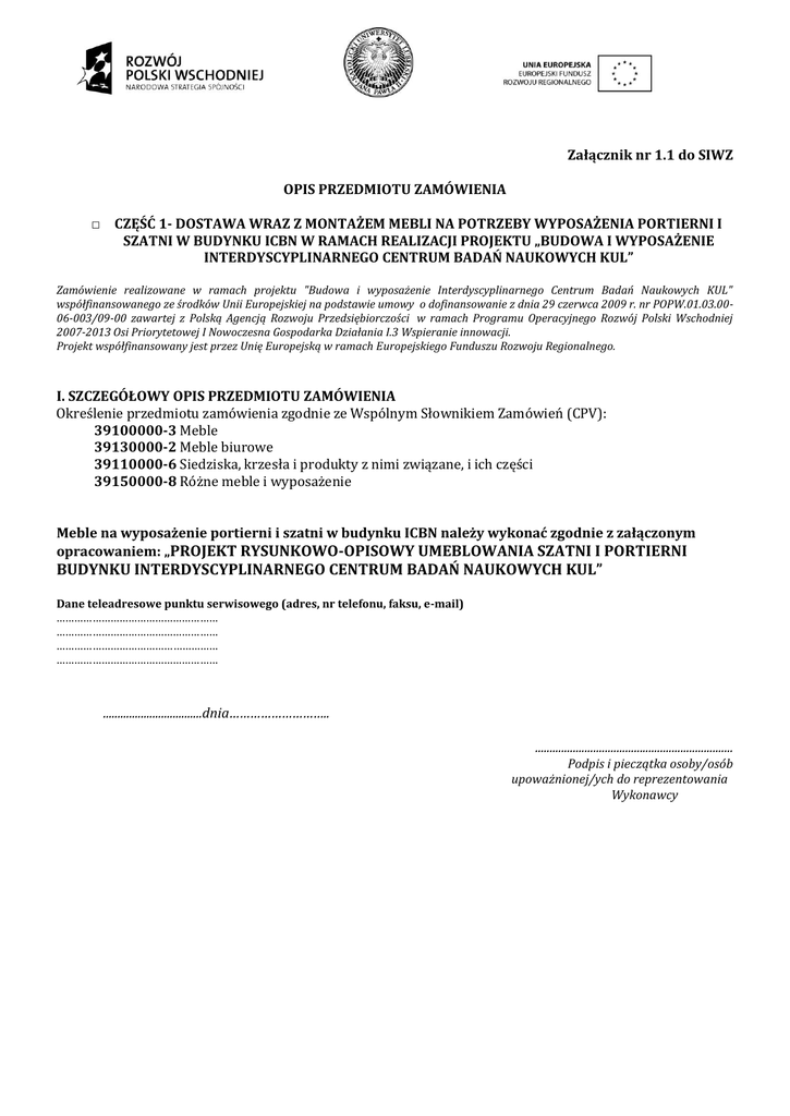 Załącznik nr 1.1 do SIWZ OPIS PRZEDMIOTU ZAMÓWIENIA □ CZĘŚĆ 1- DOSTAWA WRAZ Z MONTAŻEM MEBLI NA POTRZEBY WYPOSAŻENIA PORTIERNI I SZATNI W BUDYNKU ICBN W RAMACH REALIZACJI PROJEKTU „BUDOWA I WYPOSAŻENIE INTERDYSCYPLINARNEGO CENTRUM BADAŃ NAUKOWYCH KUL” Zamówienie realizowane w ramach projektu "Budowa i wyposażenie Interdyscyplinarnego Centrum Badań Naukowych KUL" współfinansowanego ze środków Unii Europejskiej na podstawie umowy o dofinansowanie z dnia 29 czerwca 2009 r. nr POPW.01.03.0006-003/09-00 zawartej z Polską Agencją Rozwoju Przedsiębiorczości w ramach Programu Operacyjnego Rozwój Polski Wschodniej 2007-2013 Osi Priorytetowej I Nowoczesna Gospodarka Działania I.3 Wspieranie innowacji. Projekt współfinansowany jest przez Unię Europejską w ramach Europejskiego Funduszu Rozwoju Regionalnego. I. SZCZEGÓŁOWY OPIS PRZEDMIOTU ZAMÓWIENIA Określenie przedmiotu zamówienia zgodnie ze Wspólnym Słownikiem Zamówień (CPV): 39100000-3 Meble 39130000-2 Meble biurowe 39110000-6 Siedziska, krzesła i produkty z nimi związane, i ich części 39150000-8 Różne meble i wyposażenie Meble na wyposażenie portierni i szatni w budynku ICBN należy wykonać zgodnie z załączonym opracowaniem: „PROJEKT RYSUNKOWO-OPISOWY UMEBLOWANIA SZATNI I PORTIERNI BUDYNKU INTERDYSCYPLINARNEGO CENTRUM BADAŃ NAUKOWYCH KUL” Dane teleadresowe punktu serwisowego (adres, nr telefonu, faksu, e-mail) ……………………………………………… ……………………………………………… ……………………………………………… ……………………………………………… ..................................dnia……………………….. .................................................................... Podpis i pieczątka osoby/osób upoważnionej/ych do reprezentowania Wykonawcy Załącznik nr 1.2 do SIWZ OPIS PRZEDMIOTU ZAMÓWIENIA □ CZĘŚĆ 2 - DOSTAWA WRAZ Z MONTAŻEM MEBLI NA POTRZEBY WYPOSAŻENIA SALI KONFENRECYJNEJ NR 0.08 W BUDYNKU ICBN W RAMACH REALIZACJI PROJEKTU „BUDOWA I WYPOSAŻENIE INTERDYSCYPLINARNEGO CENTRUM BADAŃ NAUKOWYCH KUL” Zamówienie realizowane w ramach projektu "Budowa i wyposażenie Interdyscyplinarnego Centrum Badań Naukowych KUL" współfinansowanego ze środków Unii Europejskiej na podstawie umowy o dofinansowanie z dnia 29 czerwca 2009 r. nr POPW.01.03.0006-003/09-00 zawartej z Polską Agencją Rozwoju Przedsiębiorczości w ramach Programu Operacyjnego Rozwój Polski Wschodniej 2007-2013 Osi Priorytetowej I Nowoczesna Gospodarka Działania I.3 Wspieranie innowacji. Projekt współfinansowany jest przez Unię Europejską w ramach Europejskiego Funduszu Rozwoju Regionalnego. I. SZCZEGÓŁOWY OPIS PRZEDMIOTU ZAMÓWIENIA Określenie przedmiotu zamówienia zgodnie ze Wspólnym Słownikiem Zamówień (CPV): 39100000-3 Meble 39130000-2 Meble biurowe 39110000-6 Siedziska, krzesła i produkty z nimi związane, i ich części 39150000-8 Różne meble i wyposażenie Wymagania dotyczące przedmiotu zamówienia: meble muszą być wykonane z zachowaniem zasad należytej staranności i rzemiosła meblarskiego, meble mogą być wykonane w wymiarach (szer./gł./wys.) z dopuszczalnym odchyleniem nieprzekraczającym 5%. A. SZCZEGÓŁOWE PARAMETRY TECHNICZNE I EKSPLOATACYJNE LP. RODZAJ MEBLI 1 SZCZEGÓŁOWY OPIS Krzesło stacjonarne z tapicerowanymi poduszkami na siedzisku i oparciu, z podłokietnikami i pulpitem, powinno posiadać wymiary zawarte w przedziale: Szerokość sklejki oparcia 420-440 mm Szerokość sklejki siedziska 420-440 mm Głębokość sklejki siedziska 400-420 mm Szerokość sklejki pulpitu 340-360 mm Głębokość sklejki pulpitu 280-300 mm Wysokość pulpitu liczona od siedziska 220-240 mm Szerokość całkowita 560-580 mm – liczona od końca krawędzi zewnętrznych nóg Wysokość całkowita (liczona do krańca oparcia) – 800-820 mm Głębokość całkowita – 540-560 mm ( bez pulpitu ) PARAMETRY OFEROWANE Nazwa/Typ/Model: . ....................................................... .................................................................. ................................................................ ................................................................. Dane teleadresowe punktu KRZESŁO serwisowego (adres, nr telefonu, STACJONARNE faksu, e-mail) Krzesło powinno posiadać : ……………………………………………… Konstrukcję w kształcie odwróconej litery „V”, 98 szt. Nogi wykonane z rur stalowych o średnicy 20-22 mm i grubości ……………………………………………… ……………………………………………… ścianki min. 2 mm. Ramę oparcia wykonaną z rur stalowych o średnicy 20-22 mm i ……………………………………………… grubości ścianki min 2 mm, wszystkie połączenia konstrukcji ramy Wykonanie zgodnie ze szczegółowym spawane. opisem minimalnych wymagań ujętych Siedzisko i oparcie wykonane jako niezależne formatki wykonane ze w kolumnie obok sklejki bukowej: siedzisko o grubości sklejki 8-10 mm, oparcie o grubości sklejki min 8-11 mm. Tapicerowane poduszki siedziska i oparcia. Stelaż krzesła malowany proszkowo na kolor RAL 9006. Pulpit umieszczony z prawej lub lewej strony krzesła, montowany do ramy krzesła – do wyboru Zamawiającego na etapie realizacji. Pulpit składający się z rury stalowej 22 mm malowanej proszkowo na kolor RAL9006 i blatu wykonanego ze sklejki bukowej o grubości 10-12 mm. Nie dopuszcza się pulpitu wykonanego z płyty wiórowej. Pulpit ruchomy w 2 płaszczyznach, z możliwością całkowitego demontażu. Krzesło musi posiadać fabrycznie zamontowany mechanizm do łączenia w rzędy za pomocą stalowego łącznika (trzpień i główka) , z funkcją zamykania w sposób trwały i zabezpieczający przed przypadkowym rozłączeniem. Krzesło wyposażone dodatkowo w składane podłokietniki z tworzywowymi nakładkami, zamontowane do oparcia krzesła. Moż