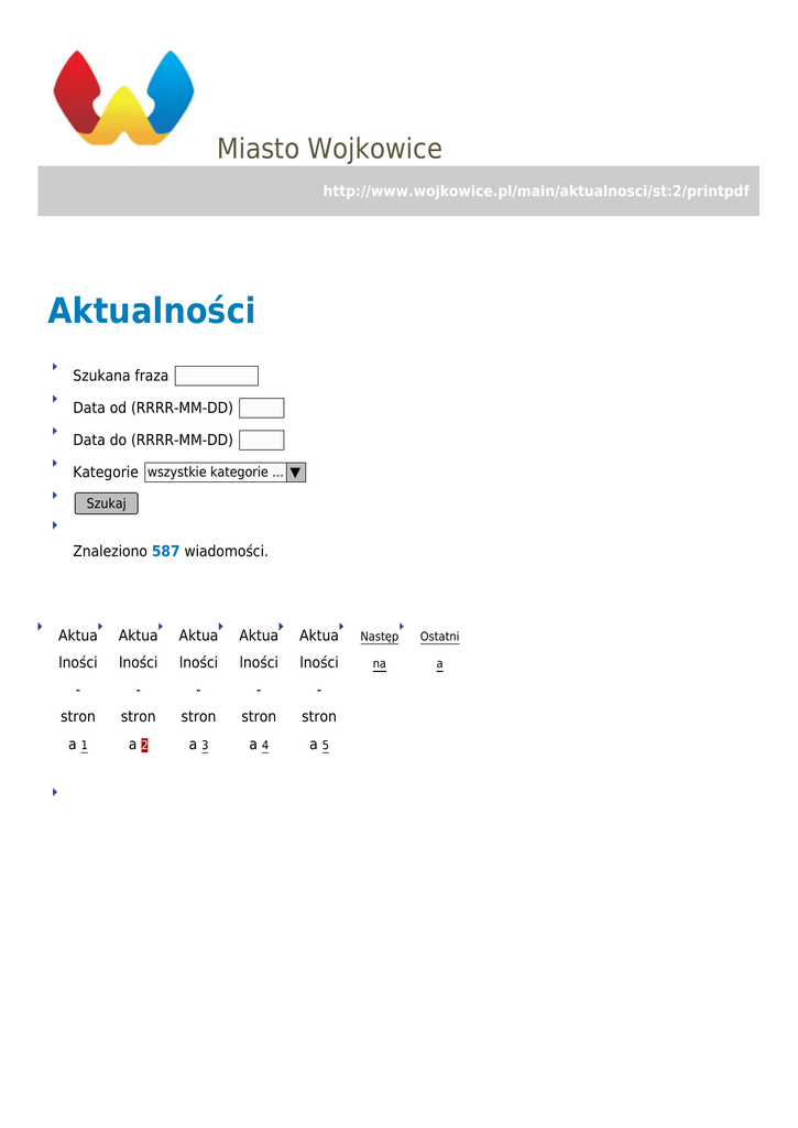 Miasto Wojkowice http://www.wojkowice.pl/main/aktualnosci/st:2/printpdf Aktualności Szukana fraza Data od (RRRR-MM-DD) Data do (RRRR-MM-DD) Kategorie wszystkie kategorie ... ▼ Szukaj Znaleziono 587 wiadomości. Aktua Aktua Aktua Aktua Aktua Następ Ostatni lności lności lności lności lności na a - - - - - stron stron stron stron stron a1 a2 a3 a4 a5 2017-02-15 kategoria: Zagrożenie ptasią grypą Wojkowice Podczas posiedzenie Powiatowego Zespołu Zarządzania Kryzysowego w Będzinie dnia 11 lutego 2017 r. zapoznano z lokalizacją ognisk wysoce zjadliwej grypy ptaków (H5N8) w miejscowości Chruszczobród, gm. Łazy, powiat zawierciański. 2017-02-14 I Sesja Wojkowickiej Rady Seniorek i Seniorów kategoria: Wojkowice 13 lutego w sali ślubów Urzędu Miasta w Wojkowicach odbyła się I sesja Wojkowickiej Rady Seniorek i Seniorów pierwszej kadencji. 2017-02-14 kategoria: Konkurs Walentynkowy rozstrzygnięty! Wojkowice Zapraszamy wszystkich do udziału w Konkursie Walentynkowym! Wystarczy udzielić poprawnej odpowiedzi na zadane pytania, aby wziąć dzisiaj udział w losowaniu niesamowitych nagród. 2017-02-13 Po spotkaniu z Marzeną Kipiel-Sztuką kategoria: Wojkowice Gościem Miejskiego Ośrodka Kultury w niedzielne popołudnie była popularna serialowa aktorka – Marzena Kipiel-Sztuka. Artystka spotkała się z mieszkańcami Wojkowic w sali widowiskowej MOK-u i opowiadała o swoich doświadczeniach w pracy aktorskiej, anegdotach z planu filmowego oraz przeróżnych ciekawostkach, które mogły zainteresować zgromadzoną publiczność. 2017-02-13 kategoria: Otwarty konkurs ofert Wojkowice Biuro ds. Pozyskiwania Środków Zewnętrznych, Promocji Miasta i Obsługi Inwestora informuję iż od 13.02.2017 do 10.03.2017 trwa otwarty konkursu ofert na realizacje zadania „Wspieranie i upowszechnianie kultury fizycznej”. 2017-02-13 Konsultacje o możliwościach pozyskania środków unijnych 2014-2020 dla przedsiębiorców kategoria: Wojkowice Urząd Miasta w Wojkowicach oraz Lokalny Punkt Informacyjny Funduszy Europejskich w Sosnowcu zapraszają do skorzystania z Mobilnego Punktu Informacyjnego. 2017-02-09 kategoria: Kolejne środki zewnętrzne pozyskane! Wojkowice Udało się pozyskać kolejne środki zewnętrzne. Tym razem są to pieniądze, które zostaną przeznaczone na zapewnienie funkcjonowania miejsc opieki nad dziećmi w Miejskim Żłobku "Figielkowo". 2017-02-02 Wizyta delegacji z naszej partnerskiej Gminy Łapsze Niżne kategoria: Wojkowice W ubiegły weekend mieliśmy zaszczyt gościć w naszej Gminie delegację z Gminy Partnerskiej Łapsze Niżne – Wojkowice odwiedził Wójt Jakub Jamróz, Przewodniczący Rady Gminy Zdzisław Majerczak, Zastępca Przewodniczącego Rady Jan Noworolski, Radny Tomasz Markowicz, Radny Jan Stańczak, Radny Józef Prelich, Radny Antoni Szewczyk. 2017-02-02 kategoria: Spotkanie Noworoczne 2017 Wojkowice 27 stycznia br. w MOK w Wojkowicach odbyło się III Spotkanie Noworoczne, które zostało uświetnione przez wielu znamienitych gości z terenu województwa śląskiego, ale także przedstawicieli Naszej gminy partnerskiej Gmina Łapsze Niżne. Był to czas podsumowania 2016 r. i inwestycji towarzyszących, ale i prezentacji planowanych działań na rok 2017. 2017-02-01 Uwaga na śliskie drogi i chodniki !! kategoria: Wojkowice Instytut Meteorologii wydał alerty pierwszego stopnia dla Polski centralnej, południowej i wschodniej. Alerty obowiązują w województwach - podlaskim, mazowieckim, łódzkim, opolskim, śląskim, świętokrzyskim, lubelskim, małopolskim, podkarpackim. W dużej części kraju występują marznące opady, które skutkują gołoledzią. Na drogach może być bardzo ślisko. Aktua Aktua Aktua Aktua Aktua Następ Ostatni lności lności lności lności lności na a - - - - - stron stron stron stron stron a1 a2 a3 a4 a5