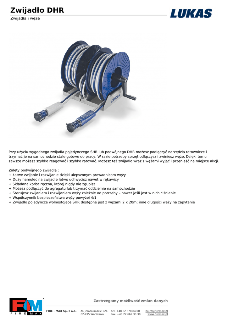 Zwijadło DHR Zwijadła i węże Przy użyciu wygodnego zwijadła pojedynczego SHR lub podwójnego DHR możesz podłączyć narzędzia ratownicze i trzymać je na samochodzie stale gotowe do pracy. W razie potrzeby sprzęt odłączysz i zwiniesz węże. Dzięki temu zawsze możesz szybko reagować i szybko ratować. Możesz też zwijadło wraz z wężami wyjąć i przenieść na miejsce akcji. Zalety podwójnego zwijadła : + Łatwe zwijanie i rozwijanie dzięki ulepszonym prowadnicom węży + Duży hamulec na zwijadle łatwo uchwycisz nawet w rękawicy + Składana korba ręczna, której nigdy nie zgubisz + Możesz podłączyć do agregatu lub trzymać oddzielnie na samochodzie + Sterujesz zwijaniem i rozwijaniem węży zależnie od potrzeby – nawet jeśli jest w nich ciśnienie + Współczynnik bezpieczeństwa węży powyżej 4:1 + Zwijadło pojedyncze wolnostojące SHR dostępne jest z wężami 2 x 20m; inne długości węży na zapytanie Zastrzegamy możliwość zmian danych FIRE - MAX Sp. z o.o. Al. Jerozolimskie 224 02-495 Warszawa tel. +48 22 578 84 00 fax. +48 22 662 38 38 [email protected] www.firemax.pl Zwijadło DHR Zwijadła i węże Dane techniczne Nr katalogowy: 81-61-20 Długość węża: 2 x 20 m Zastrzegamy możliwość zmian danych FIRE - MAX Sp. z o.o. Al. Jerozolimskie 224 02-495 Warszawa tel. +48 22 578 84 00 fax. +48 22 662 38 38 [email protected] www.firemax.pl