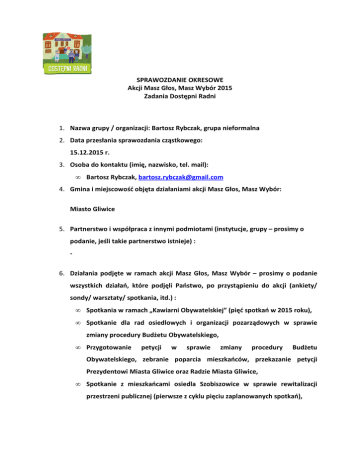 SPRAWOZDANIE OKRESOWE Akcji Masz Głos, Masz Wybór 2015 Zadania Dostępni Radni 1. Nazwa grupy / organizacji: Bartosz Rybczak, grupa nieformalna 2. Data przesłania sprawozdania cząstkowego: 15.12.2015 r. 3. Osoba do kontaktu (imię, nazwisko, tel. mail): • Bartosz Rybczak, [email protected] 4. Gmina i miejscowość objęta działaniami akcji Masz Głos, Masz Wybór: Miasto Gliwice 5. Partnerstwo i współpraca z innymi podmiotami (instytucje, grupy – prosimy o podanie, jeśli takie partnerstwo istnieje) : 6. Działania podjęte w ramach akcji Masz Głos, Masz Wybór – prosimy o podanie wszystkich działań, które podjęli Państwo, po przystąpieniu do akcji (ankiety/ sondy/ warsztaty/ spotkania, itd.) : • Spotkania w ramach „Kawiarni Obywatelskiej” (pięć spotkań w 2015 roku), • Spotkanie dla rad osiedlowych i organizacji pozarządowych w sprawie zmiany procedury Budżetu Obywatelskiego, • Przygotowanie petycji w sprawie zmiany procedury Budżetu Obywatelskiego, zebranie poparcia mieszkańców, przekazanie petycji Prezydentowi Miasta Gliwice oraz Radzie Miasta Gliwice, • Spotkanie z mieszkańcami osiedla Szobiszowice w sprawie rewitalizacji przestrzeni publicznej (pierwsze z cyklu pięciu zaplanowanych spotkań), 7. Ilość osób zaangażowanych w realizację zadania (mieszkańcy, radni, itd.): Ilość mieszkańców, którzy wzięli udział w naszych spotkaniach szacuję na około 80 – 100 osób, w tym czterech radnych Rady Miasta i kilkunastu radnych Rad Osiedli. W tej grupie byli także przedstawiciele organizacji pozarządowych. 8. W przypadku, organizowanych przez Państwa spotkań z mieszkańcami, prosimy o podanie daty spotkania, tematu spotkania, kto był organizatorem, ilu było mieszkańców, radnych Kawiarnia Obywatelska, styczeń 2015 – spotkanie otwarte dla mieszkańców „przy kawie”. Temat – ruchy miejskie. Organizator – grupa nieformalna. W spotkaniu uczestniczyło około 20 osób, w tym radni osiedlowi. Kawiarnia Obywatelska, luty 2015 – spotkanie otwarte dla mieszkańców. Temat spotkania – komunikacja miejska i infrastruktura transportowa. Organizator – grupa nieformalna. W spotkaniu uczestniczyło około 25 osób, w tym radni osiedlowi oraz urzędnicy samorządowi. Kawiarnia Obywatelska, marzec 2015 – spotkanie otwarte dla mieszkańców. Temat roboczy „Miasta z wizją”. Organizator – grupa nieformalna. W spotkaniu uczestniczyło około 15 osób, w tym radni osiedlowi i radny Rady Miasta. Kawiarnia Obywatelska, maj 2015 - spotkanie otwarte dla mieszkańców. Temat „Charakter miasta – zabytki i drzewa”. Organizator – grupa nieformalna. Frekwencja – około 10 osób. Kawiarnia Obywatelska, spotkanie po przerwie wakacyjnej, październik 2015 spotkanie otwarte dla mieszkańców. Temat „Kongres Ruchów Miejskich”. Organizator – grupa nieformalna. Frekwencja – około 15 osób, w tym radni osiedlowi. To było ostatnie spotkanie w 2015 roku, w 2016 będziemy organizować te spotkania w zmienionej formule. Ośrodek Studiów o Mieście, wrzesień 2015 – spotkanie dla radnych oraz organizacji pozarządowych w sprawie zmiany procedury w Gliwickim Budżecie Obywatelskim. W spotkaniu wzięło udział około 30 osób, radni osiedlowi, trzech radnych RM, przedstawiciele organizacji pozarządowych. W 2016 roku planujemy przeprowadzić około 4 takich spotkań informacyjnych dla mieszkańców. Ośrodek Studiów o Mieście - spotkania w sprawie rewitalizacji przestrzeni publicznej w dzielnicy Szobiszowice. Spotkania robocze dla ngo – październik/listopad. Pierwsze spotkanie dla zarządów zainteresowanych Wspólnot Mieszkaniowych – listopad. Udział wzięło około 15 osób, reprezentowane były wszystkie wspólnoty zainteresowane przedmiotem planowanej rewitalizacji oraz radny Rady Miasta (równocześnie radny Osiedla Szobiszowice). Kolejne spotkanie z mieszkańcami – grudzień. Cykl spotkań konsultacyjnych dla mieszkańców (w formie warsztatów) przewidziany na przełom stycznia i lutego. Swój udział potwierdził Radny Rady Miasta z osiedla Szobiszowice. 9. Proszę wymienić swoje największe osiągnięcia w dotychczasowej realizacji zadania w ramach Akcji Masz Głos, Masz Wybór Przeprowadzenie skutecznego lobbingu na rzecz zmian w procedurze gliwickiego Budżetu Obywatelskiego oraz zaktywizowanie mieszkańców wokół tej inicjatywy. Na fundamencie prowadzonych działań udało się zgromadzić grupę aktywnych osób, które tworzą organizację Ośrodek Studiów o Mieście Gliwice. Za sukces uznać można zapoczątkowanie procesu „wychodzenia” radnych Rady Miasta do mieszkańców oraz akcję edukacyjną i promocyjną dotyczącą Rad Osiedlowych (jednostki te są obecne w świadomości mieszkańców w stopniu znikomym). 10. Jak oceniają Państwo zaangażowanie mieszkańców w działania związane z akcją? (1- brak zaangażowania, 2- niskie zainteresowanie, 3- trudno powiedzieć, 4- dostrzegam zainteresowanie, 5- bardzo duże zaangażowanie ) 1 2 3 4 5 11. Jak oceniają Państwo zaangażowanie radnych w działania związane z akcją? (1- brak zaangażowania, 2- niskie zainteresowanie, 3- trudno powiedzieć, 4-dostrzegam zainteresowanie, 5- bardzo duże zaangażowanie ) 1 2 3 12. Uwagi, dodatkowe informacje: 4 5