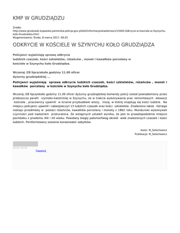 KMP W GRUDZIĄDZU Źródło: http://www.grudziadz.kujawsko-pomorska.policja.gov.pl/kb2/informacje/wiadomosci/13445,Odkrycie-w-kosciele-w-Szynychukolo-Grudziadza.html Wygenerowano: Środa, 8 marca 2017, 09:25 ODKRYCIE W KOŚCIELE W SZYNYCHU KOŁO GRUDZIĄDZA Policjanci wyjaśniają sprawę odkrycia ludzkich czaszek, kości szkieletów, różańców , monet i kawałków porcelany w kościele w Szynychu koło Grudziądza. Wczoraj /28 lipca/około godziny 11.00 oficer dyżurny grudziądzkiej ... Policjanci wyjaśniają sprawę odkrycia ludzkich czaszek, kości szkieletów, różańców , monet i kawałków porcelany w kościele w Szynychu koło Grudziądza. Wczoraj /28 lipca/około godziny 11.00 oficer dyżurny grudziądzkiej komendy policji został powiadomiony przez proboszcza parafii rzymsko-katolickiej w Szynychu, że w trakcie wykonywania prac remontowych elewacji kościoła , pracownicy ujawnili w ścianie przybudówki wieży, niszę, w której znajdują się kości ludzkie. Na miejscu policjanci ujawnili i zabezpieczyli 13 ludzkich czaszek oraz kości szkieletów. Znaleziono także różnego rodzaju przedmioty w postaci różańców, kawałków porcelany i monety z 1862 roku. Mundurowi wykonywali czynności pod nadzorem prokuratora. Ze wstępnych ustaleń wynika, że jest to prawdopodobnie miejsce pochówku z przełomu XIX i XX wieku. Powołany biegły patomorfolog określi wiek znalezionych czaszek i kości ludzkich. Poinformowany zostanie konserwator zabytków. Autor: M_Solochewicz Publikacja: M_Solochewicz Ocena: 0/5 (0) Tweetnij