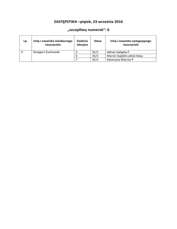 ZASTĘPSTWA –piątek, 23 września 2016 „szczęśliwy numerek”: 6 Lp. 2. Imię i nazwisko nieobecnego nauczyciela Grzegorz Żuchowski Godzina lekcyjna 5 6 7 Klasa 3C/1 3C/1 3C/1 Imię i nazwisko zastępującego nauczyciela Adrian Gałązka P Marcin Gajdzik całość klasy Katarzyna Marcisz P