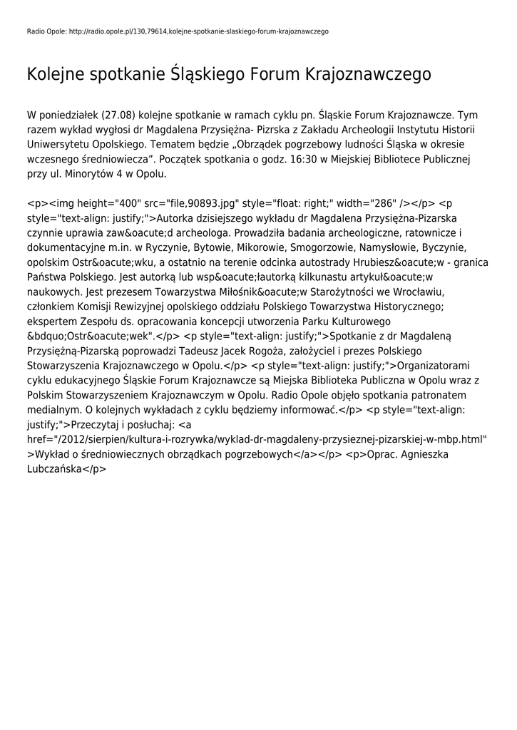 Radio Opole: http://radio.opole.pl/130,79614,kolejne-spotkanie-slaskiego-forum-krajoznawczego Kolejne spotkanie Śląskiego Forum Krajoznawczego W poniedziałek (27.08) kolejne spotkanie w ramach cyklu pn. Śląskie Forum Krajoznawcze. Tym razem wykład wygłosi dr Magdalena Przysiężna- Pizrska z Zakładu Archeologii Instytutu Historii Uniwersytetu Opolskiego. Tematem będzie „Obrządek pogrzebowy ludności Śląska w okresie wczesnego średniowiecza”. Początek spotkania o godz. 16:30 w Miejskiej Bibliotece Publicznej przy ul. Minorytów 4 w Opolu. <p><img height="400" src="file,90893.jpg" style="float: right;" width="286" /></p> <p style="text-align: justify;">Autorka dzisiejszego wykładu dr Magdalena Przysiężna-Pizarska czynnie uprawia zawód archeologa. Prowadziła badania archeologiczne, ratownicze i dokumentacyjne m.in. w Ryczynie, Bytowie, Mikorowie, Smogorzowie, Namysłowie, Byczynie, opolskim Ostrówku, a ostatnio na terenie odcinka autostrady Hrubieszów - granica Państwa Polskiego. Jest autorką lub współautorką kilkunastu artykułów naukowych. Jest prezesem Towarzystwa Miłośników Starożytności we Wrocławiu, członkiem Komisji Rewizyjnej opolskiego oddziału Polskiego Towarzystwa Historycznego; ekspertem Zespołu ds. opracowania koncepcji utworzenia Parku Kulturowego „Ostrówek".</p> <p style="text-align: justify;">Spotkanie z dr Magdaleną Przysiężną-Pizarską poprowadzi Tadeusz Jacek Rogoża, założyciel i prezes Polskiego Stowarzyszenia Krajoznawczego w Opolu.</p> <p style="text-align: justify;">Organizatorami cyklu edukacyjnego Śląskie Forum Krajoznawcze są Miejska Biblioteka Publiczna w Opolu wraz z Polskim Stowarzyszeniem Krajoznawczym w Opolu. Radio Opole objęło spotkania patronatem medialnym. O kolejnych wykładach z cyklu będziemy informować.</p> <p style="text-align: justify;">Przeczytaj i posłuchaj: <a href="/2012/sierpien/kultura-i-rozrywka/wyklad-dr-magdaleny-przysieznej-pizarskiej-w-mbp.html" >Wykład o średniowiecznych obrządkach pogrzebowych</a></p> <p>Oprac. Agnieszka Lubczańska</p>
