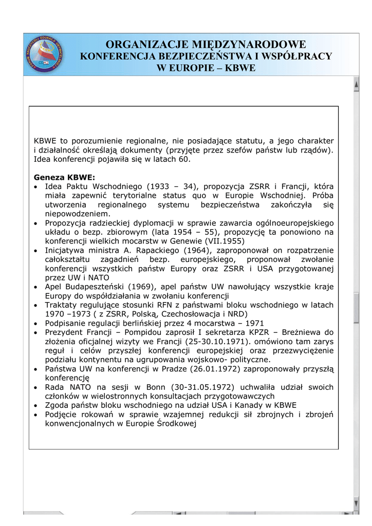 ORGANIZACJE MIĘDZYNARODOWE KONFERENCJA BEZPIECZEŃSTWA I WSPÓŁPRACY W EUROPIE – KBWE KBWE to porozumienie regionalne, nie posiadające statutu, a jego charakter i działalność określają dokumenty (przyjęte przez szefów państw lub rządów). Idea konferencji pojawiła się w latach 60. Geneza KBWE: • Idea Paktu Wschodniego (1933 – 34), propozycja ZSRR i Francji, która miała zapewnić terytorialne status quo w Europie Wschodniej. Próba utworzenia regionalnego systemu bezpieczeństwa zakończyła się niepowodzeniem. • Propozycja radzieckiej dyplomacji w sprawie zawarcia ogólnoeuropejskiego układu o bezp. zbiorowym (lata 1954 – 55), propozycję ta ponowiono na konferencji wielkich mocarstw w Genewie (VII.1955) • Inicjatywa ministra A. Rapackiego (1964), zaproponował on rozpatrzenie całokształtu zagadnień bezp. europejskiego, proponował zwołanie konferencji wszystkich państw Europy oraz ZSRR i USA przygotowanej przez UW i NATO • Apel Budapeszteński (1969), apel państw UW nawołujący wszystkie kraje Europy do współdziałania w zwołaniu konferencji • Traktaty regulujące stosunki RFN z państwami bloku wschodniego w latach 1970 –1973 ( z ZSRR, Polską, Czechosłowacja i NRD) • Podpisanie regulacji berlińskiej przez 4 mocarstwa – 1971 • Prezydent Francji – Pompidou zaprosił I sekretarza KPZR – Breżniewa do złożenia oficjalnej wizyty we Francji (25-30.10.1971). omówiono tam zarys reguł i celów przyszłej konferencji europejskiej oraz przezwyciężenie podziału kontynentu na ugrupowania wojskowo- polityczne. • Państwa UW na konferencji w Pradze (26.01.1972) zaproponowały przyszłą konferencję • Rada NATO na sesji w Bonn (30-31.05.1972) uchwaliła udział swoich członków w wielostronnych konsultacjach przygotowawczych • Zgoda państw bloku wschodniego na udział USA i Kanady w KBWE • Podjęcie rokowań w sprawie wzajemnej redukcji sił zbrojnych i zbrojeń konwencjonalnych w Europie Środkowej ORGANIZACJE MIĘDZYNARODOWE KONFERENCJA BEZPIECZEŃSTWA I WSPÓŁPRACY W EUROPIE – KBWE Postanowienia Aktu Końcowego KBWE 1 sierpnia 1975 r. 35 szefów państw i rządów podpisało Akt Końcowy KBWE, zwany Wielką Karta Pokoju, nie był umową międzynarodową, ale uroczystą deklaracją intencji o znaczeniu politycznym i moralnym, wyrażał wole współdziałania państw w podzielonej na 2 ideologiczne bloki Europę. KBWE nie posiadał statutu. Akt składał się z 3 części: 1) pierwszy koszyk (koszyk polityczny) – obejmował 10 zasad prawno – politycznych, stanowiących podstawę rozwoju stosunków międzynarodowych (przestrzeganie zasad wzajemnej suwerennej równości, wstrzymanie się do użycia lub groźby użycia siły, nienaruszalność granic, poszanowanie prawa człowieka i podstawowych wolności, prawo narodów do samostanowienia, zawiadamianie o zamiarze odbycia manewrów wojskowych) oraz dołączono dokumenty w sprawie budowy tzw. środków zaufania i niektórych aspektów bezpieczeństwa i rozbrojenia, wyrażał on wolę zmniejszenia stopnia konfrontacji militarnej na rzecz odprężenia, rozbrojenia i bezpieczeństwa. 2) drugi koszyk (koszyk ekonomiczny) – rozszerzenie kontaktów handlowych – otwarcie stałych przedstawicielstw, wymiana inf. o handlu, wymiana patentów i licencji, wspólne badania przemysłowe, ochrona środowiska. 3) trzeci koszyk (koszyk praw człowieka) – respektowanie podstawowych praw człowieka, kontakty między ludzkie (poszerzenie zakresu ich swobody, łączenie rodzin, zawieranie małżeństw między obywatelami różnych krajów), współpraca i wymiana w dziedzinie kultury i oświaty, poprawa stanu rozpowszechniania i wymiany informacji. Paryska Karta Nowej Europy Paryska Karta Nowej Europy – podpisana 21 listopada 1990 przez szefów państw lub rządów 32 państw europejskich, USA i Kanady. Zawierała postanowienia dotyczące poszanowania praw człowieka i przestrzegania zasad Aktu Końcowego KBWE oraz określała kierunki przyszłych działań. Zainicjowała też proces instytucjonalizacji KBWE, przewidując regularne (co 2 lata) odbywanie spotkań na szczycie i powołując do życia nowe organy (Radę, Komitet Wysokich Przedstawicieli, Sekretariat, Centrum Zapobiegania Konfliktom, Biuro Wolnych Wyborów). Miała przemienić KBWE z forum negocjacji i dialogu w aktywna strukturę operacyjną. Karta stanowiła polityczny manifest końca „zimnej wojny” i tworzyła podstawy dla jednolitości kontynentu europejskiego.