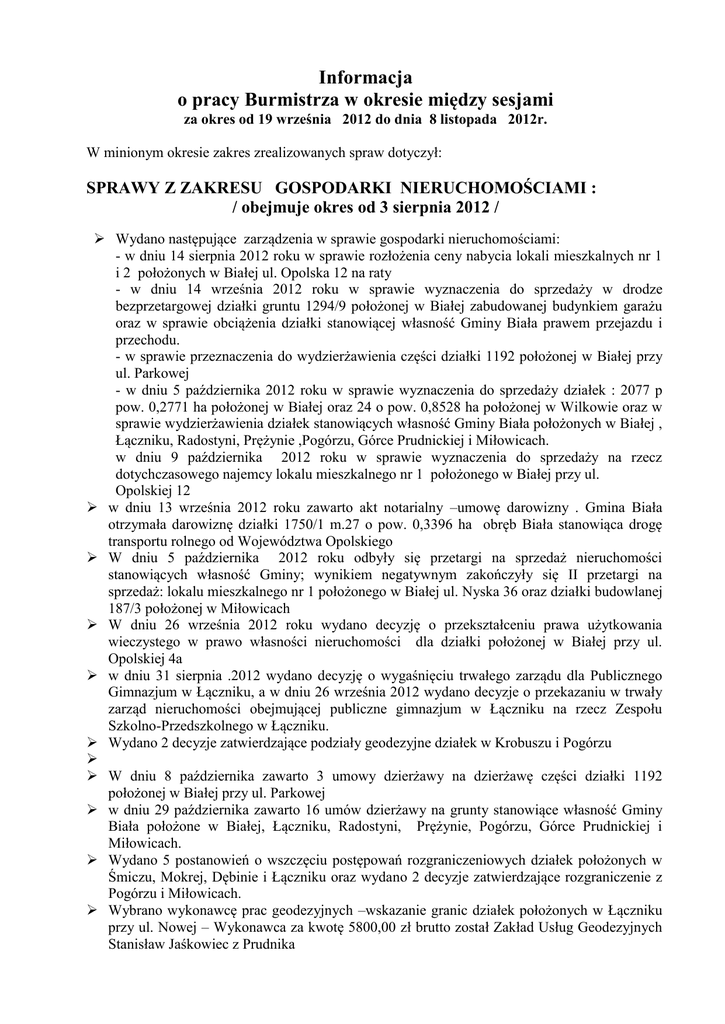 Informacja o pracy Burmistrza w okresie między sesjami za okres od 19 września 2012 do dnia 8 listopada 2012r. W minionym okresie zakres zrealizowanych spraw dotyczył: SPRAWY Z ZAKRESU GOSPODARKI NIERUCHOMOŚCIAMI : / obejmuje okres od 3 sierpnia 2012 / Wydano następujące zarządzenia w sprawie gospodarki nieruchomościami: - w dniu 14 sierpnia 2012 roku w sprawie rozłożenia ceny nabycia lokali mieszkalnych nr 1 i 2 położonych w Białej ul. Opolska 12 na raty - w dniu 14 września 2012 roku w sprawie wyznaczenia do sprzedaży w drodze bezprzetargowej działki gruntu 1294/9 położonej w Białej zabudowanej budynkiem garażu oraz w sprawie obciążenia działki stanowiącej własność Gminy Biała prawem przejazdu i przechodu. - w sprawie przeznaczenia do wydzierżawienia części działki 1192 położonej w Białej przy ul. Parkowej - w dniu 5 października 2012 roku w sprawie wyznaczenia do sprzedaży działek : 2077 p pow. 0,2771 ha położonej w Białej oraz 24 o pow. 0,8528 ha położonej w Wilkowie oraz w sprawie wydzierżawienia działek stanowiących własność Gminy Biała położonych w Białej , Łączniku, Radostyni, Prężynie ,Pogórzu, Górce Prudnickiej i Miłowicach. w dniu 9 października 2012 roku w sprawie wyznaczenia do sprzedaży na rzecz dotychczasowego najemcy lokalu mieszkalnego nr 1 położonego w Białej przy ul. Opolskiej 12 w dniu 13 września 2012 roku zawarto akt notarialny –umowę darowizny . Gmina Biała otrzymała darowiznę działki 1750/1 m.27 o pow. 0,3396 ha obręb Biała stanowiąca drogę transportu rolnego od Województwa Opolskiego W dniu 5 października 2012 roku odbyły się przetargi na sprzedaż nieruchomości stanowiących własność Gminy; wynikiem negatywnym zakończyły się II przetargi na sprzedaż: lokalu mieszkalnego nr 1 położonego w Białej ul. Nyska 36 oraz działki budowlanej 187/3 położonej w Miłowicach W dniu 26 września 2012 roku wydano decyzję o przekształceniu prawa użytkowania wieczystego w prawo własności nieruchomości dla działki położonej w Białej przy ul. Opolskiej 4a w dniu 31 sierpnia .2012 wydano decyzję o wygaśnięciu trwałego zarządu dla Publicznego Gimnazjum w Łączniku, a w dniu 26 września 2012 wydano decyzje o przekazaniu w trwały zarząd nieruchomości obejmującej publiczne gimnazjum w Łączniku na rzecz Zespołu Szkolno-Przedszkolnego w Łączniku. Wydano 2 decyzje zatwierdzające podziały geodezyjne działek w Krobuszu i Pogórzu W dniu 8 października zawarto 3 umowy dzierżawy na dzierżawę części działki 1192 położonej w Białej przy ul. Parkowej w dniu 29 października zawarto 16 umów dzierżawy na grunty stanowiące własność Gminy Biała położone w Białej, Łączniku, Radostyni, Prężynie, Pogórzu, Górce Prudnickiej i Miłowicach. Wydano 5 postanowień o wszczęciu postępowań rozgraniczeniowych działek położonych w Śmiczu, Mokrej, Dębinie i Łączniku oraz wydano 2 decyzje zatwierdzające rozgraniczenie z Pogórzu i Miłowicach. Wybrano wykonawcę prac geodezyjnych –wskazanie granic działek położonych w Łączniku przy ul. Nowej – Wykonawca za kwotę 5800,00 zł brutto został Zakład Usług Geodezyjnych Stanisław Jaśkowiec z Prudnika Zawarto akty notarialne –umowy sprzedaży - w dniu 10 sierpnia 2012 lokalu mieszkalnego nr 2 położonego w Białej przy ul. Prudnickiej 17 działek gruntu 1208/2 o pow. 0,0934 ha i 1208/3 o pow. 0,0961 ha położonych w Białej oraz lokalu mieszkalnego nr 1 położonego w Białej przy ul. Prudnickiej 8 - w dniu 23 sierpnia 2012 roku umowę sprzedaży działki budowlanej 305/1 położonej w Olbrachcicach, działki budowlanej 26/3 położonej w Józefowie, lokalu mieszkalnego nr 3 oraz użytkowego 6 U-garażu położonych w Białej ul. Rynek 14 - w dniu 7 września 2012 roku lokalu mieszkalnego nr 1 położonej w Białej ul. Prudnicka 8 , trzech lokali mieszkalnych położonych w Białej przy ul. Opolskiej 12 oraz lokalu mieszkalnego nr 2 położonego w Białej przy ul. Nyskiej 36 SPRAWY Z ZAKRESU REFERATU GOSPODARKI KOMUNALNEJ INWESTYCJI I OCHRONY ŚRODOWISKA: Zakończono przebudowę drogi gminnej w Otokach. Zakończono remont mieszkania przy ul. Czarnej 2/1, Zakończono remont świetlicy wiejskiej w Prężynie. Zakończono rozbiórkę i odbudowę pomieszczeń gospodarczych przy ul. 1-go Maja. Wymieniono stolarkę okienną w remizie w Brzeźnicy. Wybudowano piec pokojowy w lokalu ul. Kościuszki 16/1. Wybudowano chodnik betonowy przy ul. Kilińskiego. Wyremontowano dachy w budynkach komunalnych ul. Prudnicka 7 i 10, Wasiłowice, Prężyna.. 9. Wyremontowano elewację kamienic przy ul. 1-go maja 16 wraz z remontem klatki schodowej, 10. Remont instalacji elektrycznych w budynkach w Kolnowicach, Białej, 11. Rozpoczęto prace przy remoncie budynków komunalnych ul. Plac Zamkowy 8, ul. Kościuszki 3, Budynek OPS. 12. Rozpoczęto rewaloryzację murów obronnych w Białej przy ul. Szkolnej. 13. Rozpoczęto przebudowę ul. Oświęcimskiej w Białej. 14. Zamontowano siłownie zewnętrzną w Pogórzu. 15. Podpisano umowy na : - budowę pieców pokojowych i kuchennych w budynkach komunalnych, wykonanie dokumentacji projektowych na przebudowę dróg – ul.Stare Miasto, Hanki Sawickiej, Piotra Skargi. przeglądy techniczne placów zabaw na terenie Gminy dokumentacje techniczną termomodernizacji Zespołu Szkół w Białej. budowę oświetlenia ulicznego w Rostkowicach i Mokrej, 16. Wydano 3 decyzje o warunkach zabudowy. 17. Wydano 19 zaświadczeń o przeznaczeniu działek w m.p.z.p 18. Wykonano 4 wypisy i wyrysy z m.p.z.p 19. Wydano 3 postanowienia opiniujące wstępne projektu podziału nieruchomości. 20. Wydano 25 decyzji na wycinkę drzew i krzewów. 21. Zakończono 3 postępowania o wydanie decyzji środowiskowych. 1. 2. 3. 4. 5. 6. 7. 8. SPRAWY Z ZAKRESU REFERATU ZAMÓWIEŃ PUBLICZNYCH, ROLNICTWA I INTEGRACJI EUROPEJSKIEJ: 1. Wydano - 8 zaświadczeń dot. prowadzenia gospodarstwa rolnego. 2. Przekazano 2 be