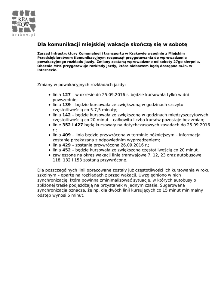 Dla komunikacji miejskiej wakacje skończą się w sobotę Zarząd Infrastruktury Komunalnej i transportu w Krakowie wspólnie z Miejskim Przedsiębiorstwem Komunikacyjnym rozpoczął przygotowania do wprowadzenie powakacyjnego rozkładu jazdy. Zmiany zostaną wprowadzone od soboty 27go sierpnia. Obecnie MPK przygotowuje rozkłady jazdy, które niebawem będą dostępne m.in. w Internecie. Zmiany w powakacyjnych rozkładach jazdy: linia 127 – w okresie do 25.09.2016 r. będzie kursowała tylko w dni powszednie; linia 139 – będzie kursowała ze zwiększoną w godzinach szczytu częstotliwością co 5-7,5 minuty; linia 142 – będzie kursowała ze zwiększoną w godzinach międzyszczytowych częstotliwością co 20 minut – całkowita liczba kursów pozostaje bez zmian; linie 352 i 427 będą kursowały na dotychczasowych zasadach do 25.09.2016 r.; linia 409 – linia będzie przywrócona w terminie późniejszym – informacja zostanie przekazana z odpowiednim wyprzedzeniem; linia 429 – zostanie przywrócona 26.09.2016 r.; linia 452 – będzie kursowała ze zwiększoną częstotliwością co 20 minut. zawieszone na okres wakacji linie tramwajowe 7, 12, 23 oraz autobusowe 118, 132 i 153 zostaną przywrócone. Dla poszczególnych linii opracowane zostały już częstotliwości ich kursowania w roku szkolnym – oparte na rozkładach z przed wakacji. Uwzględniono w nich synchronizację, która powinna zminimalizować sytuacje, w których autobusy o zbliżonej trasie podjeżdżają na przystanek w jednym czasie. Sugerowana synchronizacja oznacza, że np. dla dwóch linii kursujących co 15 minut minimalny odstęp wynosi 5 minut. Powered by TCPDF (www.tcpdf.org)