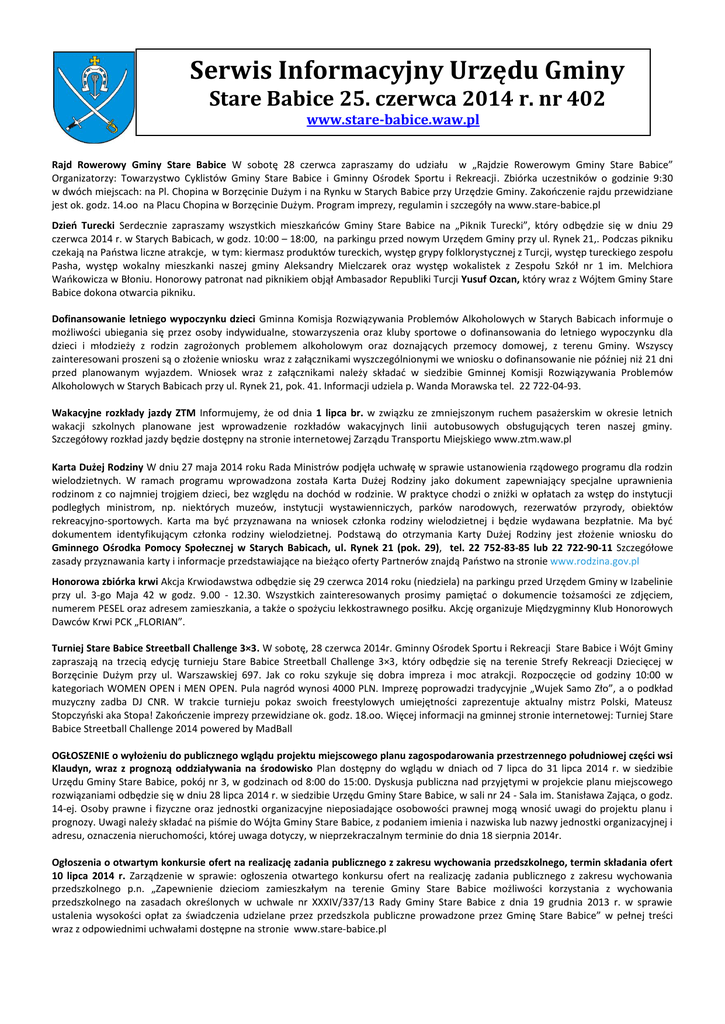 Serwis Informacyjny Urzędu Gminy Stare Babice 25. czerwca 2014 r. nr 402 www.stare-babice.waw.pl Rajd Rowerowy Gminy Stare Babice W sobotę 28 czerwca zapraszamy do udziału w „Rajdzie Rowerowym Gminy Stare Babice” Organizatorzy: Towarzystwo Cyklistów Gminy Stare Babice i Gminny Ośrodek Sportu i Rekreacji. Zbiórka uczestników o godzinie 9:30 w dwóch miejscach: na Pl. Chopina w Borzęcinie Dużym i na Rynku w Starych Babice przy Urzędzie Gminy. Zakończenie rajdu przewidziane jest ok. godz. 14.oo na Placu Chopina w Borzęcinie Dużym. Program imprezy, regulamin i szczegóły na www.stare-babice.pl Dzień Turecki Serdecznie zapraszamy wszystkich mieszkańców Gminy Stare Babice na „Piknik Turecki”, który odbędzie się w dniu 29 czerwca 2014 r. w Starych Babicach, w godz. 10:00 – 18:00, na parkingu przed nowym Urzędem Gminy przy ul. Rynek 21,. Podczas pikniku czekają na Państwa liczne atrakcje, w tym: kiermasz produktów tureckich, występ grypy folklorystycznej z Turcji, występ tureckiego zespołu Pasha, występ wokalny mieszkanki naszej gminy Aleksandry Mielczarek oraz występ wokalistek z Zespołu Szkół nr 1 im. Melchiora Wańkowicza w Błoniu. Honorowy patronat nad piknikiem objął Ambasador Republiki Turcji Yusuf Ozcan, który wraz z Wójtem Gminy Stare Babice dokona otwarcia pikniku. Dofinansowanie letniego wypoczynku dzieci Gminna Komisja Rozwiązywania Problemów Alkoholowych w Starych Babicach informuje o możliwości ubiegania się przez osoby indywidualne, stowarzyszenia oraz kluby sportowe o dofinansowania do letniego wypoczynku dla dzieci i młodzieży z rodzin zagrożonych problemem alkoholowym oraz doznających przemocy domowej, z terenu Gminy. Wszyscy zainteresowani proszeni są o złożenie wniosku wraz z załącznikami wyszczególnionymi we wniosku o dofinansowanie nie później niż 21 dni przed planowanym wyjazdem. Wniosek wraz z załącznikami należy składać w siedzibie Gminnej Komisji Rozwiązywania Problemów Alkoholowych w Starych Babicach przy ul. Rynek 21, pok. 41. Informacji udziela p. Wanda Morawska tel. 22 722-04-93. Wakacyjne rozkłady jazdy ZTM Informujemy, że od dnia 1 lipca br. w związku ze zmniejszonym ruchem pasażerskim w okresie letnich wakacji szkolnych planowane jest wprowadzenie rozkładów wakacyjnych linii autobusowych obsługujących teren naszej gminy. Szczegółowy rozkład jazdy będzie dostępny na stronie internetowej Zarządu Transportu Miejskiego www.ztm.waw.pl Karta Dużej Rodziny W dniu 27 maja 2014 roku Rada Ministrów podjęła uchwałę w sprawie ustanowienia rządowego programu dla rodzin wielodzietnych. W ramach programu wprowadzona została Karta Dużej Rodziny jako dokument zapewniający specjalne uprawnienia rodzinom z co najmniej trojgiem dzieci, bez względu na dochód w rodzinie. W praktyce chodzi o zniżki w opłatach za wstęp do instytucji podległych ministrom, np. niektórych muzeów, instytucji wystawienniczych, parków narodowych, rezerwatów przyrody, obiektów rekreacyjno-sportowych. Karta ma być przyznawana na wniosek członka rodziny wielodzietnej i będzie wydawana bezpłatnie. Ma być dokumentem identyfikującym członka rodziny wielodzietnej. Podstawą do otrzymania Karty Dużej Rodziny jest złożenie wniosku do Gminnego Ośrodka Pomocy Społecznej w Starych Babicach, ul. Rynek 21 (pok. 29), tel. 22 752-83-85 lub 22 722-90-11 Szczegółowe zasady przyznawania karty i informacje przedstawiające na bieżąco oferty Partnerów znajdą Państwo na stronie www.rodzina.gov.pl Honorowa zbiórka krwi Akcja Krwiodawstwa odbędzie się 29 czerwca 2014 roku (niedziela) na parkingu przed Urzędem Gminy w Izabelinie przy ul. 3-go Maja 42 w godz. 9.00 - 12.30. Wszystkich zainteresowanych prosimy pamiętać o dokumencie tożsamości ze zdjęciem, numerem PESEL oraz adresem zamieszkania, a także o spożyciu lekkostrawnego posiłku. Akcję organizuje Międzygminny Klub Honorowych Dawców Krwi PCK „FLORIAN”. Turniej Stare Babice Streetball Challenge 3×3. W sobotę, 28 czerwca 2014r. Gminny Ośrodek Sportu i Rekreacji Stare Babice i Wójt Gminy zapraszają na trzecią edycję turnieju Stare Babice Streetball Challenge 3×3, który odbędzie się na terenie Strefy Rekreacji Dziecięcej w Borzęcinie Dużym przy ul. Warszawskiej 697. Jak co roku szykuje się dobra impreza i moc atrakcji. Rozpoczęcie od godziny 10:00 w kategoriach WOMEN OPEN i MEN OPEN. Pula nagród wynosi 4000 PLN. Imprezę poprowadzi tradycyjnie „Wujek Samo Zło”, a o podkład muzyczny zadba DJ CNR. W trakcie turnieju pokaz swoich freestylowych umiejętności zaprezentuje aktualny mistrz Polski, Mateusz Stopczyński aka Stopa! Zakończenie imprezy przewidziane ok. godz. 18.oo. Więcej informacji na gminnej stronie internetowej: Turniej Stare Babice Streetball Challenge 2014 powered by MadBall OGŁOSZENIE o wyłożeniu do publicznego wglądu projektu miejscowego planu zagospodarowania przestrzennego południowej części wsi Klaudyn, wraz z prognozą oddziaływania na środowisko Plan dostępny do wglądu w dniach od 7 lipca do 31 lipca 2014 r. w siedzibie Urzędu Gminy Stare Babice, pokój nr 3, w godzinach od 8:00 do 15:00. Dyskusja publiczna nad przyjętymi w projekcie planu miejscowego rozwiązaniami odbędzie się w dniu 28 lipca 2014 r. w siedzibie Urzędu Gminy Stare Babice, w sali nr 24 - Sala im. Stanisława Zająca, o godz. 14-ej. Osoby prawne i fizyczne oraz jednostki organizacyjne nieposiadające osobowości prawnej mogą wnosić uwagi do projektu planu i prognozy. Uwagi należy składać na piśmie do Wójta Gminy Stare Babice, z podaniem imienia i nazwiska lub nazwy jednostki organizacyjnej i adresu, oznaczenia nieruchomości, której uwaga dotyczy, w nieprzekraczalnym terminie do dnia 18 sierpnia 2014r. Ogłoszenia o otwartym konkursie ofert na realizację zadania publicznego z zakresu wychowania przedszkolnego, termin składania ofert 10 lipca 2014 r. Zarządzenie w sprawie: ogłoszenia otwartego konkursu ofe