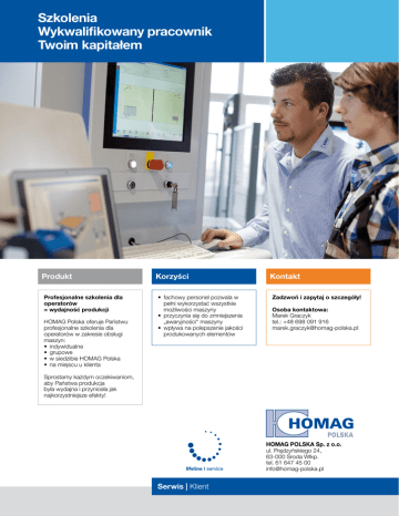 Szkolenia Wykwalifikowany pracownik Twoim kapitałem Produkt Profesjonalne szkolenia dla operatorów = wydajność produkcji HOMAG Polska oferuje Państwu profesjonalne szkolenia dla operatorów w zakresie obsługi maszyn: • indywidualne • grupowe • w siedzibie HOMAG Polska • na miejscu u klienta Korzyści • fachowy personel pozwala w pełni wykorzystać wszystkie możliwości maszyny • przyczynia się do zmniejszenia „awaryjności“ maszyny • wpływa na polepszenie jakości produkowanych elementów Kontakt Zadzwoń i zapytaj o szczegóły! Osoba kontaktowa: Marek Graczyk tel.: +48 698 091 916 [email protected] Sprostamy każdym oczekiwaniom, aby Państwa produkcja była wydajna i przyniosła jak najkorzystniejsze efekty! HOMAG POLSKA Sp. z o.o. ul. Prądzyńskiego 24, 63-000 Środa Wlkp. tel. 61 647 45 00 [email protected] Serwis | Klient Oprogramowania Dobre oprogramowanie to klucz do sukcesu Produkt Oprogramowanie Grupy HOMAG •woodCAD|CAM* •woodWOP •woodWOP CAD-Plugin •woodWOP DXF-Import •woodNEST •woodTIME •collisionControl •woodMotion •woodWindow •woodASEMBLER + woodVisio •woodLINE •CuteRite Korzyści Sprawdź nas i wykorzystaj swój potencjał, a zyskasz: • oszczędność czasu produkcji • wysoką jakość produkowanych elementów • zwiększenie wydajności produkcji • indywidualność produkcji Kontakt Zadzwoń i zapytaj o szczegóły! Osoba kontaktowa: Marek Graczyk tel.: +48 698 091 916 [email protected] * Bezpłatna wersja testowa już dostępna! Bezpłatne szkolenie wstępne w siedzibie HOMAG Polska! I to wszystko w korzystnej cenie! Nie zwlekaj - tego nie można przegapić! HOMAG POLSKA Sp. z o.o. ul. Prądzyńskiego 24, 63-000 Środa Wlkp. tel. 61 647 45 00 [email protected] Serwis | Klient