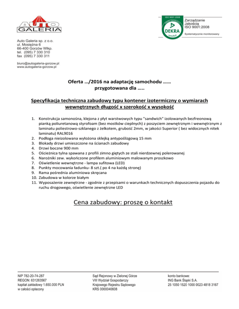 Oferta …/2016 na adaptację samochodu …… przygotowana dla ….. Specyfikacja techniczna zabudowy typu kontener izotermiczny o wymiarach wewnętrznych długość x szerokość x wysokość 1. Konstrukcja samonośna, klejona z płyt warstwowych typu "sandwich" izolowanych bezfreonową pianką poliuretanową styrofoam (bez mostków cieplnych) z poszyciem zewnętrznym i wewnętrznym z laminatu poliestrowo-szklanego z żelkotem, grubość 2mm, w jakości Superior ( bez widocznych nitek laminatu) RAL9016 2. Podłoga nieizolowana wyłożona sklejką antypoślizgową 15 mm 3. Blokady drzwi umieszczone na ścianach zabudowy 4. Drzwi boczne 900 mm 5. Ościeżnica tylna spawana z profili zimno giętych ze stali nierdzewnej polerowanej 6. Narożniki zew. wykończone profilem aluminiowym malowanym proszkowo 7. Oświetlenie wewnętrzne - lampa sufitowa (LED) 8. Punkty mocowania ładunku- 8 szt.( po 4 na każdą stronę) 9. Rama pośrednia aluminiowa skręcana 10. Zabudowa w kolorze białym 11. Wyposażenie zewnętrzne - zgodnie z przepisami o warunkach technicznych dopuszczenia pojazdu do ruchu drogowego, oświetlenie zewnętrzne LED Cena zabudowy: proszę o kontakt