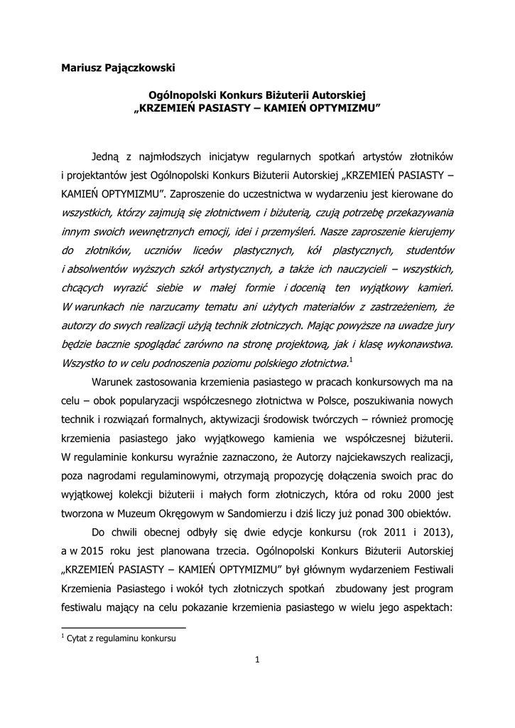 Mariusz Pajączkowski Ogólnopolski Konkurs Biżuterii Autorskiej „KRZEMIEŃ PASIASTY – KAMIEŃ OPTYMIZMU” Jedną z najmłodszych inicjatyw regularnych spotkań artystów złotników i projektantów jest Ogólnopolski Konkurs Biżuterii Autorskiej „KRZEMIEŃ PASIASTY – KAMIEŃ OPTYMIZMU”. Zaproszenie do uczestnictwa w wydarzeniu jest kierowane do wszystkich, którzy zajmują się złotnictwem i biżuterią, czują potrzebę przekazywania innym swoich wewnętrznych emocji, idei i przemyśleń. Nasze zaproszenie kierujemy do złotników, uczniów liceów plastycznych, kół plastycznych, studentów i absolwentów wyższych szkół artystycznych, a także ich nauczycieli – wszystkich, chcących wyrazić siebie w małej formie i docenią ten wyjątkowy kamień. W warunkach nie narzucamy tematu ani użytych materiałów z zastrzeżeniem, że autorzy do swych realizacji użyją technik złotniczych. Mając powyższe na uwadze jury będzie bacznie spoglądać zarówno na stronę projektową, jak i klasę wykonawstwa. Wszystko to w celu podnoszenia poziomu polskiego złotnictwa.1 Warunek zastosowania krzemienia pasiastego w pracach konkursowych ma na celu – obok popularyzacji współczesnego złotnictwa w Polsce, poszukiwania nowych technik i rozwiązań formalnych, aktywizacji środowisk twórczych – również promocję krzemienia pasiastego jako wyjątkowego kamienia we współczesnej biżuterii. W regulaminie konkursu wyraźnie zaznaczono, że Autorzy najciekawszych realizacji, poza nagrodami regulaminowymi, otrzymają propozycję dołączenia swoich prac do wyjątkowej kolekcji biżuterii i małych form złotniczych, która od roku 2000 jest tworzona w Muzeum Okręgowym w Sandomierzu i dziś liczy już ponad 300 obiektów. Do chwili obecnej odbyły się dwie edycje konkursu (rok 2011 i 2013), a w 2015 roku jest planowana trzecia. Ogólnopolski Konkurs Biżuterii Autorskiej „KRZEMIEŃ PASIASTY – KAMIEŃ OPTYMIZMU” był głównym wydarzeniem Festiwali Krzemienia Pasiastego i wokół tych złotniczych spotkań zbudowany jest program festiwalu mający na celu pokazanie krzemienia pasiastego w wielu jego aspektach: 1 Cytat z regulaminu konkursu 1 od archeologii, historii, mineralogii, rzemiosła, sztuki złotniczej i zbiorów muzealnych – do działań inspirowanych lub skojarzeniowo związanych z tym minerałem, włączając w to aspekt krajoznawczy i muzyczny. Udało się stworzyć konkurs mający wyjątkową oprawę i naprawdę szeroki zasięg oddziaływania. Pomysłodawcą i organizatorem konkursów jest Galeria Otwarta Mariusza Pajączkowskiego. Inicjatywę wsparli: Urząd Miasta Sandomierza, Gold&Silver Gallery Cezarego Łutowicza oraz Stowarzyszenie Twórców Form Złotniczych. Organizację wystaw i wernisaży sfinansowała Galeria Otwarta. Oprawą graficzną konkursu, projektem i składem katalogów oraz promocją zajmował się Mariusz Pajączkowski. Autorem zdjęć prac do katalogu był Patryk Goszczyński. Druk katalogów towarzyszących konkursom został sfinansowany ze środków sponsorów (w tym Galerii Sztuki w Legnicy) i reklamodawców. Druk plakatów i ulotek został sfinansowany ze środków Urzędu Miejskiego w Sandomierzu. Inicjatywę wsparli m.in. Muzeum Okręgowe w Sandomierzu, Biuro Wystaw Artystycznych w Sandomierzu, Chorągiew Rycerstwa Ziemi Sandomierskiej, Sandomierskie Centrum Kultury, wykładowcy Akademii Sztuk Pięknych im. Władysława Strzemińskiego w Łodzi oraz liczna rzesza przyjaciół skupionych wokół Galerii Otwartej w Sandomierzu. Do jury I edycji konkursu zostali zaproszeni: Cezary Łutowicz – projektant biżuterii, mistrz złotnictwa, członek STFZ, od 1972 roku propagator krzemienia pasiastego w biżuterii (przewodniczący), prof. Andrzej Boss – artysta plastyk, wykładowca łódzkiej Akademii Sztuk Pięknych; dr Ewa Kondek – prezes Towarzystwa Naukowego Sandomierskiego, wiceburmistrz Sandomierza; Katarzyna Pisarczyk – historyk sztuki, dyrektor Biura Wystaw Artystycznych w Sandomierzu; Szczepan Siudak – artysta plastyk, członek Związku Polskich Artystów Rzeźbiarzy; Marcin Tymiński – projektant biżuterii, prezes Stowarzyszenia Twórców Form Złotniczych; Bożena Ewa Wódz – historyk sztuki, kustosz Muzeum Okręgowego 2 w Sandomierzu, twórczyni i kuratorka jedynej w świecie kolekcji muzealnej dzieł sztuki złotniczej z krzemieniem pasiastym. Zostały przyznane następujące nagrody i wyróżnienia: Pierwszą nagrodę otrzymał Jarosław Kolec Stowarzyszenie Twórców Form Złotniczych), (nagroda ufundowana przez drugą otrzymała Anna Wojdan (Nagroda Wielkiego Krzemienia ufundowana przez Gold & Silver Gallery Cezarego Łutowicza), trzecią – Krzysztof Piotrowski (Nagroda Otwartego Krzemienia ufundowana przez Galerię Otwartą Mariusza Pajączkowskiego). Zostały również przyznane równorzędne wyróżnienia spośród prac zakwalifikowanych do konkursu. Wyróżnienia Burmistrza Miasta Sandomierz otrzymali Bogumiła Adamska oraz Radosław Wójcik. Wyróżnienia Muzeum Okręgowego w Sandomierzu otrzymali Jarosław Kolec oraz Ryszarda i Tomasz Krzesimowscy. Wyróżnienie Biura Wystaw Artystycznych BWA Sandomierskiego w Sandomierzu Centrum Kultury otrzymał otrzymał Jacek Radosław Skrzyński. Wyróżnienie Wójcik. Wyróżnienie Sandomierskiego Stowarzyszenia Kulturalnego otrzymał Giedymin Jabłoński. Podczas obrad jury zostało przyznane dodatkowe wyróżnienie Prezesa Stowarzyszenia Twórców Form Złotniczych, które otrzymał Krzysztof Piotrowski. Pozostali uczestnicy konkursu to: Andrzej Adamski, Andrzej Bielak, Agata Bieńkowska, Andrzej Boss, Beata Ciesielska, Eugeniusz Gowkielewicz, Marcin Gronkowski, Małgorzata Kalińska, Jerzy Kret, Anna Mazoń, Michalina Owczarek, Andrzej Pacak, Jan Pomianowski, Marta Rudnicka, Wojciech Rygało, Magdalena i Tomasz Stajszczak, Olgierd Stopiński, Grzegorz Ślączka, Grażyna Zalewska, Tadeusz Ziętara oraz (poza konkursem) Cezary Łutowicz, Mariusz Pajączkow
