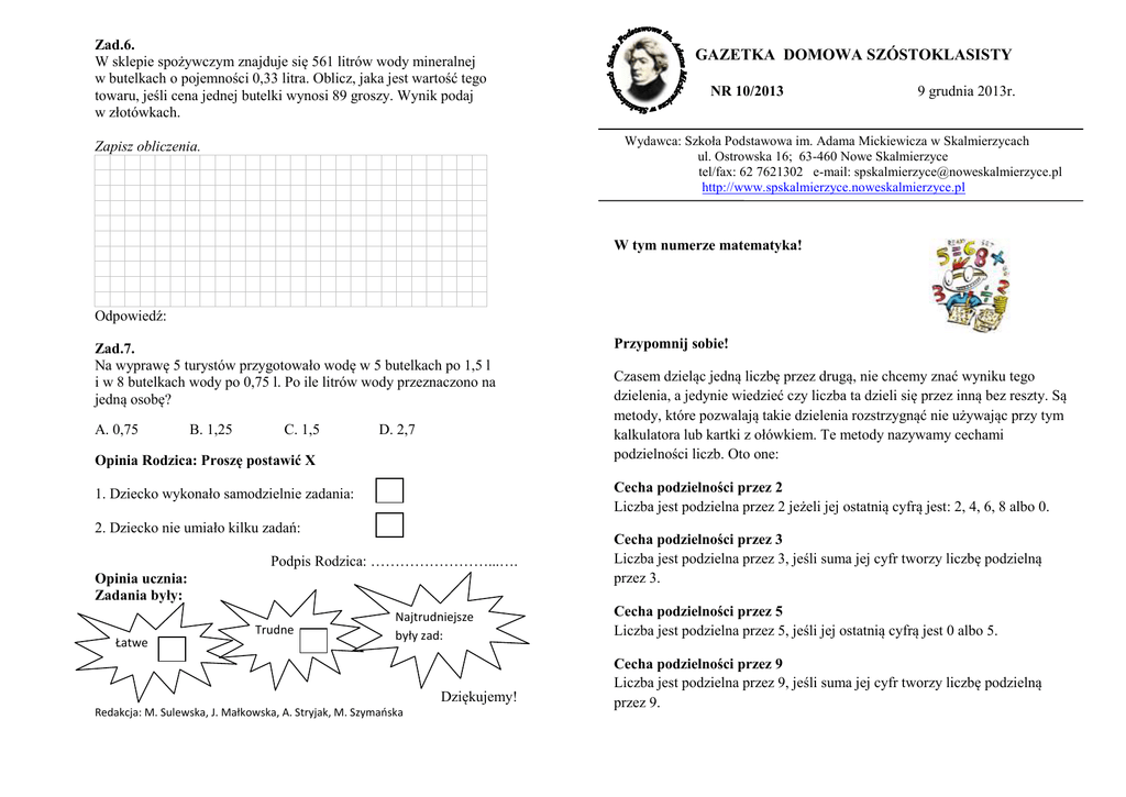 Zad.6. W sklepie spożywczym znajduje się 561 litrów wody mineralnej w butelkach o pojemności 0,33 litra. Oblicz, jaka jest wartość tego towaru, jeśli cena jednej butelki wynosi 89 groszy. Wynik podaj w złotówkach. GAZETKA DOMOWA SZÓSTOKLASISTY NR 10/2013 9 grudnia 2013r. Wydawca: Szkoła Podstawowa im. Adama Mickiewicza w Skalmierzycach ul. Ostrowska 16; 63-460 Nowe Skalmierzyce tel/fax: 62 7621302 e-mail: [email protected] http://www.spskalmierzyce.noweskalmierzyce.pl Zapisz obliczenia. W tym numerze matematyka! Odpowiedź: Zad.7. Na wyprawę 5 turystów przygotowało wodę w 5 butelkach po 1,5 l i w 8 butelkach wody po 0,75 l. Po ile litrów wody przeznaczono na jedną osobę? A. 0,75 B. 1,25 C. 1,5 D. 2,7 Opinia Rodzica: Proszę postawić X 2. Dziecko nie umiało kilku zadań: Podpis Rodzica: ……………………...…. Opinia ucznia: Zadania były: Łatwe Czasem dzieląc jedną liczbę przez drugą, nie chcemy znać wyniku tego dzielenia, a jedynie wiedzieć czy liczba ta dzieli się przez inną bez reszty. Są metody, które pozwalają takie dzielenia rozstrzygnąć nie używając przy tym kalkulatora lub kartki z ołówkiem. Te metody nazywamy cechami podzielności liczb. Oto one: Cecha podzielności przez 2 Liczba jest podzielna przez 2 jeżeli jej ostatnią cyfrą jest: 2, 4, 6, 8 albo 0. 1. Dziecko wykonało samodzielnie zadania: Trudne Przypomnij sobie! Najtrudniejsze były zad: Dziękujemy! Redakcja: M. Sulewska, J. Małkowska, A. Stryjak, M. Szymańska Cecha podzielności przez 3 Liczba jest podzielna przez 3, jeśli suma jej cyfr tworzy liczbę podzielną przez 3. Cecha podzielności przez 5 Liczba jest podzielna przez 5, jeśli jej ostatnią cyfrą jest 0 albo 5. Cecha podzielności przez 9 Liczba jest podzielna przez 9, jeśli suma jej cyfr tworzy liczbę podzielną przez 9. Cecha podzielności przez 10 Liczba jest podzielna przez 10 jeśli jej ostatnią cyfrą jest zero. Cecha podzielności przez 25 Liczba jest podzielna przez 10 jeśli jej dwie ostatnie cyfry to: 25, 50, 75, 00. Zad.3. Bilet na samolot z Krakowa do Warszawy dla osoby dorosłej kosztuje 497 zł,a dla dziecka 343 zł. Ile razem kosztuje przelot w jedną stronę 2 osób dorosłych i 2 dzieci? Zapisz obliczenia. Cecha podzielności przez 100 Liczba jest podzielna przez 100 jeśli jej dwie ostatnie cyfry to: 00. Zadania z matematyki - na podstawie materiałów OKE w Krakowie Odpowiedź: Zad.1. Ogród miał kształt prostokąta o wymiarach 25 m x 30 m. Jakie pole powierzchni ma ten ogród? Zapisz obliczenia. Zad.4. Rowerzysta pierwszego dnia przejechał trasę o długości 50 km, drugiego – o 10 km więcej niż pierwszego, a trzeciego dnia dwa razy mniej niż drugiego. Ile kilometrów przejechał rowerzysta trzeciego dnia? Zapisz obliczenia. Odpowiedź: Odpowiedź: Zad.2. Rabaty kwiatowe zajmują ¼ z połowy ogrodu. Jaką część ogrodu zajmują rabaty kwiatowe? Zad.5. Twój starszy kolega chwali się, że w ciągu 2 tygodni może pokonać pieszo trasę o długości 528 km, idąc codziennie 30 km. Czy jest to możliwe? Zapisz obliczenia. Zapisz obliczenia. Odpowiedź: Odpowiedź: