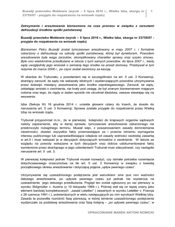 Buzadji przeciwko Mołdowie (wyrok – 5 lipca 2016 r., Wielka Izba, skarga nr 23755/07 - przyjęta do rozpatrzenia na wniosek rządu) 1 Zatrzymanie i aresztowanie biznesmena na czas procesu w związku z zarzutami defraudacji środków spółki państwowej Buzadji przeciwko Mołdowie (wyrok – 5 lipca 2016 r., Wielka Izba, skarga nr 23755/07 przyjęta do rozpatrzenia na wniosek rządu) Biznesmen Petru Buzadji został tymczasowo aresztowany w maju 2007 r. i formalnie oskarżony o defraudację na szkodę spółki państwowej, której był dyrektorem. Powodem aresztowania była waga zarzutów, skomplikowany charakter sprawy oraz ryzyko zmowy. Było ono wielokrotnie przedłużane w istocie z tych samych powodów, do lipca 2007 r., kiedy sądy uwzględniły jego wniosek o zamianę tego środka na areszt domowy. Przebywał w tym reżymie do marca 2008 r., po czym został zwolniony za kaucją. W skardze do Trybunału, z powołaniem się w szczególności na art. 5 ust. 3 Konwencji, skarżący zarzucił, że sądy nie wskazały istotnych i wystarczających powodów utrzymywania przez dziesięć miesięcy aresztowania jako środka zapobiegawczego. Zarzucił, że sądy, oddalając wnioski o zwolnienie, nie brały pod uwagę, że był znanym biznesmenem mającym rodzinę oraz tego, że nigdy w żaden sposób nie utrudniał śledztwa, zawsze stawiając się na wezwania. Izba (Sekcja III) 16 grudnia 2014 r. urzekła głosami cztery do trzech, że doszło do naruszenia art. 5 ust. 3 Konwencji. Sprawa została przyjęte do rozpatrzenia przez Wielką Izbę na wniosek rządu. Trybunał przypomniał m.in., że w pierwszej kolejności do krajowych organów sądowych należy zapewnienie, aby w danej sprawie, tymczasowe aresztowanie oskarżonego nie przekroczyło rozsądnego terminu. Musiał więc, z poszanowaniem zasady domniemania niewinności, zbadać wszystkie fakty przemawiające za i przeciw istnieniu wymagania interesu publicznego lub usprawiedliwiające odejście od zasady wolności osobistej zawartej w art.5 i musi wskazać je w decyzjach dotyczących wniosków o zwolnienie. W istocie ze względu na powody wskazane w tych decyzjach oraz dobrze udokumentowane fakty wymienione przez skarżącego w jego odwołaniach Trybunał musi zdecydować, czy nastąpiło naruszenie art. 5 ust. 3. W pierwszej kolejności jednak Trybunał musiał rozważyć, czy istniała potrzeba rozwinięcia dotychczasowego orzecznictwa na tle art. 5 ust. 3 Konwencji w związku z kwestią początkowego okresu aresztowania i dotyczącą pojęcia „upływ pewnego czasu”. Utrzymywanie się uzasadnionego podejrzenia jest warunkiem sine qua non ważności dalszego aresztowania, po upływie pewnego czasu już jednak nie wystarcza na uzasadnienie jego dalszego przedłużania. Pogląd ten został ogłoszony po raz pierwszy w wyroku Stögmüller v. Austria (z 10 listopada 1969 r.). Później stał się on lepiej znany jako element bardziej kompleksowych „zasad Letellier” ( zawartych w wyroku Letellier v. Francja z 26 czerwca 1991 r.), potwierdzonych w wielu następujących po nim wyrokach Wielkiej Izby. Zasada ta pozwoliła rozróżnić fazę pierwszą, w której istnienie uzasadnionego podejrzenia wystarczało za podstawę aresztowania oraz fazę kolejną – „po upływie pewnego czasu”, w OPRACOWANIE MAREK ANTONI NOWICKI 2 Buzadji przeciwko Mołdowie (wyrok – 5 lipca 2016 r., Wielka Izba, skarga nr 23755/07 - przyjęta do rozpatrzenia na wniosek rządu) której samo uzasadnione podejrzenie już nie wystarcza i wymaga się innych „istotnych i wystarczających” powodów aresztowania podejrzanego. W postępowaniu przed Trybunałem skarżący nie twierdził, że nie istniało uzasadnione podejrzenie popełnienia przez niego przestępstwa, Trybunał uważał więc, że nie było konieczne badanie tej kwestii. Ze względu jednak na słabość dodatkowych powodów (innych niż uzasadnione podejrzenie) wskazanych przez sądy krajowe, pojawiła się kwestia momentu, od którego musiały one zacząć być wymagane. Odpowiedź na to pytanie zależała od sposobu interpretacji wyrażenia „upływ pewnego czasu”. Trybunał w swoim orzecznictwie nie zdefiniował dotychczas zakresu wyrażenia „upływ pewnego czasu” ani nie wprowadził żadnych ogólnych kryteriów w tym zakresie. W wydanym niedawno wyroku w sprawie Magee i inni v. Wielka Brytania (z 12 maja 2005 r.) przyznał, że nie ma żadnych określonych ram czasowych odnoszących się do „upływu pewnego czasu”. Trybunał nie usiłował przełożyć tej koncepcji na określoną liczbę dni, miesięcy lub lat ani na rozmaite okresy w zależności od wagi przestępstwa. Z wielu wyroków wynikało jednak, że nawet po względnie krótkim okresie kilku dni uzasadnione podejrzenie nie mogło jako takie usprawiedliwiać tymczasowego aresztowania i musiało być wsparte dodatkowymi podstawami. Trybunał uznał więc za użyteczne dla celów części drugiej art. 5 § 3 dalsze rozwinięcie orzecznictwa odnoszącego się do wymagania od krajowych organów sądowych uzasadnienia dalszego aresztowania. Okres brany pod uwagę przy ocenie uzasadnionego charakteru aresztowania na podstawie drugiej części art. 5 ust. 3 rozpoczyna się od momentu pozbawienia danej osoby wolności. Od tego samego momentu uzyskuje ona również prawo na podstawie części pierwszej ust. 3 do postawienia „niezwłocznie przed sędzią lub innym urzędnikiem uprawnionym przez ustawę do wykonywania władzy sądowej” oferującego wymagane gwarancje niezależności od władzy wykonawczej i stron. Przepis ten zawiera wymagania proceduralne, aby „sędzia lub inny urzędnik uprawniony przez ustawę” przesłuchał osobiście postawioną przed nim osobę oraz wymaganie materialne, aby ten sam urzędnik ocenił okoliczności przemawiające za lub przeciw aresztowaniu, a więc czy istniały powody usprawiedliwiające aresztowanie i zarządził zwolnienie w razie ich braku. Innymi słowy art. 5 § 3 wymag