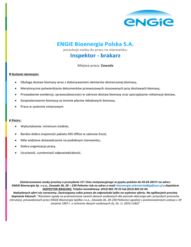 ENGIE Bioenergia Polska S.A. poszukuje osoby do pracy na stanowisku: Inspektor - brakarz Miejsce pracy: Zawada # GŁÓWNE OBOWIĄZKI: Obsługa dostaw biomasy wraz z dokonywaniem obmiarów dostarczanej biomasy, Merytoryczne potwierdzanie dokumentów przewozowych stosowanych przy dostawach biomasy, Prowadzenie ewidencji, sprawozdawczości w zakresie dostaw biomasy oraz sporządzanie reklamacji dostaw, Gospodarowanie biomasą na terenie placów składowych biomasy, Praca w systemie zmianowym # PROFIL: Wykształcenie: minimum średnie, Bardzo dobra znajomość pakietu MS Office w zakresie Excel, Mile widziane doświadczenie na podobnym stanowisku, Dobra organizacja pracy, Uczciwość, sumienność odpowiedzialność. Zainteresowane osoby prosimy o przesyłanie CV i listu motywacyjnego w języku polskim do 03.03.2017r na adres: ENGIE Bioenergia Sp. z o.o., Zawada 26, 28 – 230 Połaniec lub na adres e-mail: [email protected] z dopiskiem INSPEKTOR-BRAKARZ; Telefon kontaktowy: (015) 865 70 22 lub (015) 865 65 44. Nadsyłanych ofert nie zwracamy. Zastrzegamy sobie prawo do odpowiedzi tylko na wybrane oferty. Na aplikacjach prosimy dopisanie klauzuli: "Wyrażam zgodę na przetwarzanie swoich danych osobowych dla potrzeb obecnego jak i przyszłych procesów rekrutacji, prowadzonych przez ENGIE Bioenergia Spółka z o.o., Zawada 26, 28-230 Połaniec) zgodnie z postanowieniami ustawy z 29 sierpnia 1997 r. o ochronie danych osobowych (tj. Dz. U. 2014.1182)”