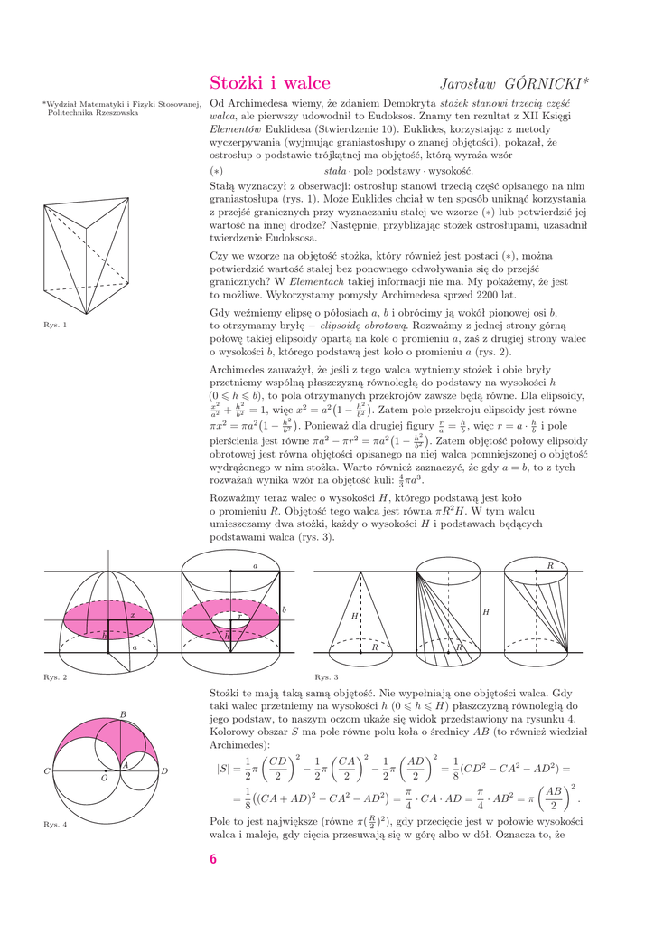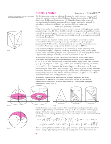 Stożki i walce *Wydział Matematyki i Fizyki Stosowanej, Politechnika Rzeszowska Jarosław GÓRNICKI* Od Archimedesa wiemy, że zdaniem Demokryta stożek stanowi trzecią część walca, ale pierwszy udowodnił to Eudoksos. Znamy ten rezultat z XII Księgi Elementów Euklidesa (Stwierdzenie 10). Euklides, korzystając z metody wyczerpywania (wyjmując graniastosłupy o znanej objętości), pokazał, że ostrosłup o podstawie trójkątnej ma objętość, którą wyraża wzór (∗) stała · pole podstawy · wysokość. Stałą wyznaczył z obserwacji: ostrosłup stanowi trzecią część opisanego na nim graniastosłupa (rys. 1). Może Euklides chciał w ten sposób uniknąć korzystania z przejść granicznych przy wyznaczaniu stałej we wzorze (∗) lub potwierdzić jej wartość na innej drodze? Następnie, przybliżając stożek ostrosłupami, uzasadnił twierdzenie Eudoksosa. Czy we wzorze na objętość stożka, który również jest postaci (∗), można potwierdzić wartość stałej bez ponownego odwoływania się do przejść granicznych? W Elementach takiej informacji nie ma. My pokażemy, że jest to możliwe. Wykorzystamy pomysły Archimedesa sprzed 2200 lat. Rys. 1 Gdy weźmiemy elipsę o półosiach a, b i obrócimy ją wokół pionowej osi b, to otrzymamy bryłę − elipsoidę obrotową. Rozważmy z jednej strony górną połowę takiej elipsoidy opartą na kole o promieniu a, zaś z drugiej strony walec o wysokości b, którego podstawą jest koło o promieniu a (rys. 2). Archimedes zauważył, że jeśli z tego walca wytniemy stożek i obie bryły przetniemy wspólną płaszczyzną równoległą do podstawy na wysokości h (0 6 h 6 b), to pola otrzymanych przekrojów zawsze będą równe. Dla elipsoidy, x2 h2 h2 2 2 a2 + b2 = 1, więc x = a 1 − b2 . Zatem pole przekroju elipsoidy jest równe 2 πx2 = πa2 1 − hb2 . Ponieważ dla drugiej figury ar = hb , więc r = a · hb i pole 2 pierścienia jest równe πa2 − πr2 = πa2 1 − hb2 . Zatem objętość połowy elipsoidy obrotowej jest równa objętości opisanego na niej walca pomniejszonej o objętość wydrążonego w nim stożka. Warto również zaznaczyć, że gdy a = b, to z tych rozważań wynika wzór na objętość kuli: 34 πa3 . Rozważmy teraz walec o wysokości H, którego podstawą jest koło o promieniu R. Objętość tego walca jest równa πR2 H. W tym walcu umieszczamy dwa stożki, każdy o wysokości H i podstawach będących podstawami walca (rys. 3). Rys. 2 Rys. 4 Rys. 3 Stożki te mają taką samą objętość. Nie wypełniają one objętości walca. Gdy taki walec przetniemy na wysokości h (0 6 h 6 H) płaszczyzną równoległą do jego podstaw, to naszym oczom ukaże się widok przedstawiony na rysunku 4. Kolorowy obszar S ma pole równe polu koła o średnicy AB (to również wiedział Archimedes): 2 2 2 1 CD CA AD 1 1 1 |S| = π − π − π = (CD2 − CA2 − AD2 ) = 2 2 2 2 2 2 8 2 1 AB π π = (CA + AD)2 − CA2 − AD2 = · CA · AD = · AB 2 = π . 8 4 4 2 Pole to jest największe (równe π( R2 )2 ), gdy przecięcie jest w połowie wysokości walca i maleje, gdy cięcia przesuwają się w górę albo w dół. Oznacza to, że 6 Rozwiązanie zadania M 1510. Ponieważ prawdopodobieństwo wylosowania dwóch punktów leżących na tej samej średnicy koła ω jest równe zeru, możemy założyć, że taka sytuacja się nie zdarzyła. Niech A1 , A2 , . . . , A11 będą pewnymi punktami koła ω, a B1 , B2 , . . . , B11 – punktami symetrycznymi do nich względem środka koła. Rozważmy 211 sytuacji, w których dla każdego 1 6 i 6 11 i-tym wylosowanym punktem jest Ai lub Bi . Wśród nich jest 2 · 11 takich przypadków, w których wylosowane punkty leżą po jednej stronie pewnej średnicy koła ω – każdy odpowiada wyborowi pewnego punktu spośród wyróżnionych oraz 10 „kolejnych” zgodnie z ruchem wskazówek zegara. czwarta część objętości walca leżąca poza stożkami może być przedstawiona jako połowa elipsoidy obrotowej o wysokości H/2 mającej w podstawie koło o promieniu R/2. Aby się o tym przekonać, wystarczy wyznaczyć zależność długości odcinka AB od odległości między płaszczyzną tnącą a płaszczyzną połowiącą walec. Można również przekształcić odcinek OC na odcinek o długości H/2 przez powinowactwo prostokątne. Takie przekształcenie łuk okręgu przeprowadza w łuk elipsy. Dzięki temu otrzymujemy „równanie objętości brył”: walec(R, H) = stożek(R, H) + stożek(R, H) + 4 · pół elipsoidy (R/2, H/2) = = stożek(R, H) + stożek(R, H) + 4 [walec (R/2, H/2) − stożek (R/2, H/2)] , gdzie stożek(R, H) = k · πR2 H i niewiadomą jest k. Przekształcając powyższe równanie do postaci 2 2 πR2 H = kπR2 H + kπR2 H + 4[π (R/2) (H/2) − kπ (R/2) (H/2)], otrzymujemy k = 1/3. Mamy więc potwierdzenie, że stożek o wysokości H, mający w podstawie koło o promieniu R, ma objętość równą 13 πR2 H. Spróbujemy teraz wyznaczyć objętość paraboloidy obrotowej o wysokości H i promieniu podstawy R. Oczywiście, nie chcemy używać rachunku całkowego. Równanie paraboli tworzącej paraboloidę obrotową o promieniu podstawy R i wysokości H jest następujące: y = RH2 x2 (rys. 5; taka parabola jest jedyna!). Obok rozważmy walec o wysokości H, którego podstawą jest koło o promieniu R, w którym wydrążono paraboloidę obrotową utworzoną przez parabolę y = H − RH2 x2 . W wyniku przecięcia obu brył na wysokości h (0 6 h 6 H) 2 płaszczyzną równoległą do podstawy otrzymujemy koło o polu S(h) = πr2 = π RHh H 2 (korzystamy z równania paraboli h = R2 r ). Rys. 5 Ponieważ dla pierścienia mamy h = H − H 2 R2 z , więc R2 h = S(h). H Oznacza to, że objętość paraboloidy obrotowej jest równa połowie objętości opisanego na niej walca: 21 πR2 H. P (h) = πR2 − πz 2 = π Miłośnikom rachunków polecam inne rozwiązanie: można bez trudu sprawdzić, że na rysunku 6 kolorowe obszary obrócone 