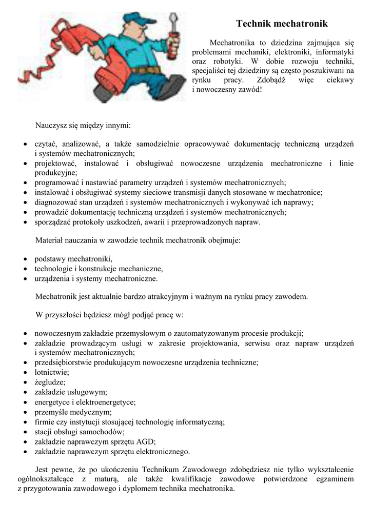 Technik mechatronik Mechatronika to dziedzina zajmująca się problemami mechaniki, elektroniki, informatyki oraz robotyki. W dobie rozwoju techniki, specjaliści tej dziedziny są często poszukiwani na rynku pracy. Zdobądź więc ciekawy i nowoczesny zawód! Nauczysz się między innymi: czytać, analizować, a także samodzielnie opracowywać dokumentację techniczną urządzeń i systemów mechatronicznych; projektować, instalować i obsługiwać nowoczesne urządzenia mechatroniczne i linie produkcyjne; programować i nastawiać parametry urządzeń i systemów mechatronicznych; instalować i obsługiwać systemy sieciowe transmisji danych stosowane w mechatronice; diagnozować stan urządzeń i systemów mechatronicznych i wykonywać ich naprawy; prowadzić dokumentację techniczną urządzeń i systemów mechatronicznych; sporządzać protokoły uszkodzeń, awarii i przeprowadzonych napraw. Materiał nauczania w zawodzie technik mechatronik obejmuje: podstawy mechatroniki, technologie i konstrukcje mechaniczne, urządzenia i systemy mechatroniczne. Mechatronik jest aktualnie bardzo atrakcyjnym i ważnym na rynku pracy zawodem. W przyszłości będziesz mógł podjąć pracę w: nowoczesnym zakładzie przemysłowym o zautomatyzowanym procesie produkcji; zakładzie prowadzącym usługi w zakresie projektowania, serwisu oraz napraw urządzeń i systemów mechatronicznych; przedsiębiorstwie produkującym nowoczesne urządzenia techniczne; lotnictwie; żegludze; zakładzie usługowym; energetyce i elektroenergetyce; przemyśle medycznym; firmie czy instytucji stosującej technologię informatyczną; stacji obsługi samochodów; zakładzie naprawczym sprzętu AGD; zakładzie naprawczym sprzętu elektronicznego. Jest pewne, że po ukończeniu Technikum Zawodowego zdobędziesz nie tylko wykształcenie ogólnokształcące z maturą, ale także kwalifikacje zawodowe potwierdzone egzaminem z przygotowania zawodowego i dyplomem technika mechatronika.