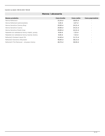 Cennik na dzień: 08-03-2017 09:26 Henna i akcesoria Nazwa produktu Cena brutto Cena netto Cena poprzednia 22,20 zł 18,05 zł - 5,00 zł 4,07 zł - Henna Sensitive Ciemny Brąz 29,90 zł 24,31 zł - Henna Sensitive Czarna 29,90 zł 24,31 zł - Henna Sensitive Średni brąz 29,90 zł 24,31 zł - Pędzelek do nakładania henny miękki, prosty 9,00 zł 7,32 zł - Pędzelek do nakładania henny twardy skośny 9,00 zł 7,32 zł - RefectoCil Oxidant Liquid 3% 14,40 zł 11,71 zł - RefectoCil Sensitive Aktywator 46,90 zł 38,13 zł - RefectoCil Tint Remover - zmywacz henny 48,70 zł 39,59 zł - Henna Refectocil Henna Refectocil jednorazówka 1/1 Powered by TCPDF (www.tcpdf.org)