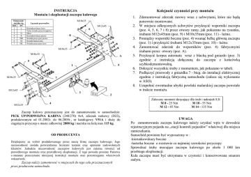 Kolejność czynności przy montażu INSTRUKCJA Montażu i eksploatacji zaczepu kulowego Oznaczenie zacisku wg ISO PN 1 L 2 + 3 31 4 R 5 58R 6 54 7 58L M10x35 Łączenie przewodów M12x45 Kierunkowskazy lewe Tylne światła przeciwmgłowe Masa Kierunkowskazy prawe Światła pozycyjne prawe Światła hamowania Światła pozycyjne lewe 6 8 M10x35 M10x35 A 5 4 1 M10x35 7 M12x45 3 A M12x35 1. Zdemontować zderzak rurowy wraz z uchwytami, które nie będą ponownie montowane. 2. W miejscu odkręconych uchwytów przykręcić wsporniki zaczepu (poz. 4, 5, 6, 7 i 8) przez otwory ramy, jak pokazano na rysunku, śrubami M12x45mm (poz. 9) i M10x35mm (poz. 11) - luźno. 3. Pomiędzy wsporniki boczne (poz. 4) wsunąć belkę główną zaczepu (poz. 1) i przykręcić śrubami M12x35mm (poz. 10) - luźno. 4. Zamontować zderzak do wsporników (poz. 4) fabrycznymi śrubami przez otwory (poz. A). 5. Przykręcić korpus automatu wraz z blachą pod gniazdo (poz. 3) zgodnie z instrukcją dołączaną do zaczepu z końcówką szybkodemontowalną. 6. Dokręcić wszystkie śruby z momentem, jak pokazano w tabeli. 7. Podłączyć przewody z gniazdka 7 - bieg. do instalacji elektrycznej zgodnie z instrukcją fabryczną samochodu (zaleca się wykonanie w ASO). 8. Uzupełnić ewentualne ubytki powłoki malarskiej zaczepu powstałe w trakcie montażu. 2 Zalecany moment skręcający dla śrub i nakrętek 8,8: M 8 - 25 Nm M 10 - 55 Nm M 12 - 85 Nm M 14 - 135 Nm 4 Zaczep kulowy przeznaczony jest do zamontowania w samochodzie: PICK UP/PODWOJNA KABINA (240/270) 4x4, zderzak rurkowy (D22), produkowanym od 01.2002r. do 06.2005r., nr katalogowy V51A i służy do ciągnięcia przyczep o masie całkowitej 2800 kg i nacisku na kulę max 115 kg. OD PRODUCENTA Dziękujemy za wybór produkowanego przez naszą firmę zaczepu kulowego. Jego niezawodność została potwierdzona licznymi testami oraz opiniami zadowolonych klientów. Jednakże niezawodność zaczepów kulowych jest zależna również od prawidłowego montażu oraz prawidłowej eksploatacji. Z tego powodu prosimy Państwa o staranne przeczytanie niniejszej instrukcji montażu oraz przestrzeganie właściwych wskazówek. Zaczep należy zamontować w miejscach do tego celu przeznaczonych przez producenta samochodu. UWAGA Po zamontowaniu zaczepu kulowego należy uzyskać wpis w dowodzie rejestracyjnym pojazdu na „stacji kontroli pojazdów” właściwej dla miejsca zamieszkania. Samochód powinien być wyposażony w : -kierunkowskazy boczne -lusterka boczne o rozstawie co najmniej szerokości przyczepy Sprawdzać śruby mocujące zaczepu kulowego po około 1 000 km przebiegu eksploatacji. Kula zaczepu musi być utrzymana w czystości i konserwowana smarem stałym. PPUH AUTO-HAK S.J. Wyposażenie zaczepu: Produkcja Zaczepów Kulowych Henryk & Zbigniew Nejman 76-200 SŁUPSK ul. Słoneczna 16K tel/fax (059) 8-414-414; 8-414-413 E-mail: [email protected] www. autohak.com.pl Zaczep kulowy bez wyposażenia elektrycznego V51A Klasa: A50-X Nr kat. Przeznaczony do zamontowania w samochodzie: Producent: NISSAN Model: PICK UP/PODWOJNA KABINA Typ: (240/270) 4x4, zderzak rurkowy (D22) produkowanym od 01.2002r. do 06.2005r. KARTA GWARANCYJNA Dane techniczne: wartość siły D: 13,87 kN maksymalna masa przyczepy: 2800 kg maksymalny nacisk na kulę: 115 kg Numer homologacji zgodnie z dyrektywą 94/20/WE: e20*94/20*0567*00 Producent udziela gwarancji niniejszą kartą gwarancyjną na okres 24 miesięcy licząc od dnia zakupu zaczepu kulowego do samochodu: NISSAN PICK UP PICK UP/PODWOJNA KABINA (240/270) 4x4, zderzak rurkowy (D22) produkowanego od 01.2002r. do 06.2005r. Data produkcji .............................. Data zakupu............................................. Zakres gwarancji obejmuje wyłącznie wady jakościowe wynikające z winy producenta. Gwarancja nie obejmuje natomiast uszkodzeń zawinionych przez nabywcę, wynikających z niewłaściwego montażu, użytkowania lub konserwacji, uszkodzeń mechanicznych, normalnego zużycia podczas eksploatacji itp. Gwarancja udzielona na zakupiony towar nie wyłącza, nie ogranicza ani nie zawiesza uprawnień kupującego wynikających z niezgodności towaru z umową. Reklamacje należy zgłaszać w punkcie sprzedaży, składając jednocześnie kartę gwarancyjną. Usunięcie "wady" następuje po stwierdzeniu przez punkt sprzedaży wspólnie z producentem słuszności złożonej reklamacji. Reklamacja powinna być załatwiona w ciągu 14 dni od dnia uznania reklamacji. Karta gwarancyjna jest nieważna jeżeli nie jest wypełniona i podpisana. Data zgłoszenia reklamacji: ................................................................... INFORMACJA WSTĘPNA Zaczep kulowy jest skonstruowany zgodnie z zasadami bezpieczeństwa ruchu drogowego. Zaczep kulowy jest elementem wpływającym na bezpieczeństwo jazdy i może zostać zainstalowany wyłącznie przez personel wyspecjalizowany. Niedopuszczalne jest dokonywanie jakichkolwiek zmian w konstrukcji zaczepu. Powoduje to wygaśniecie dopuszczenia do stosowania. W przypadku obecności masy izolacyjnej lub osłony podwozia w miejscu przylegania zaczepu, należy ją usunąć. Nieosłonięte miejsca karoserii oraz wywiercone otwory należy pomalować farbą antykorozyjną. Informacjami wiążącymi odnośnie wartości obciążeń są dane podawane przez producenta samochodu, względnie wartości maksymalnej masy przyczepy oraz maksymalnego nacisku na kulę, przy czym wartości parametrów zaczepu kulowego nie mogą być przekroczone. Wzór do obliczania wartości siły D: Maks. masa przyczepy [kg] x Maks. masa samochodu [kg] Maks. masa przyczepy [kg] + Maks. masa samochodu [kg] X 9,81 = 1000 D [kN]